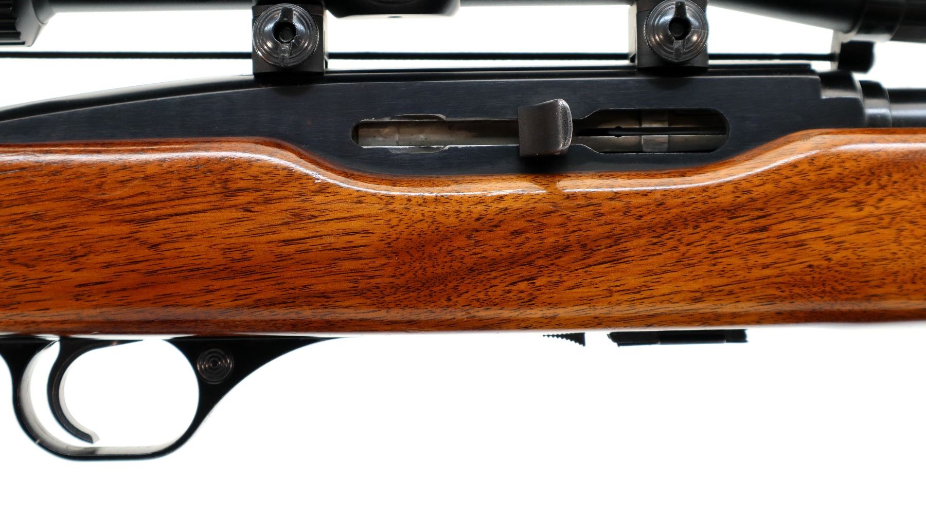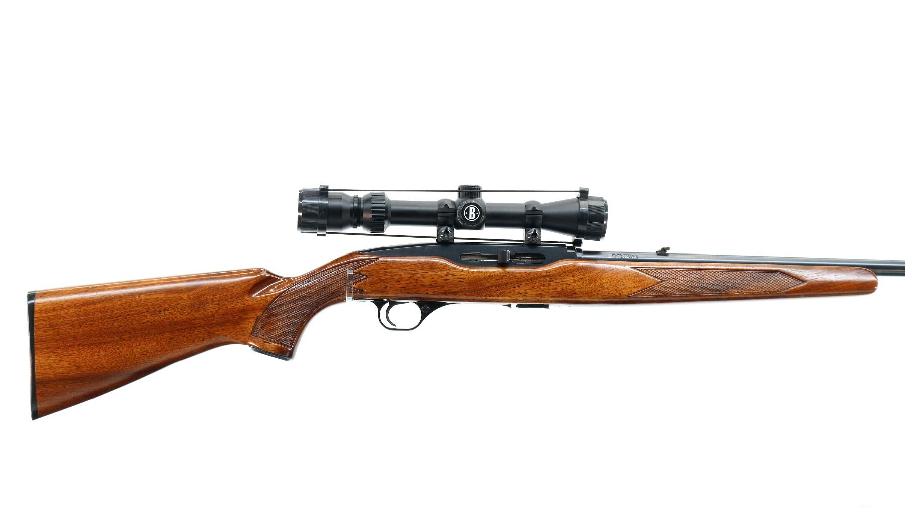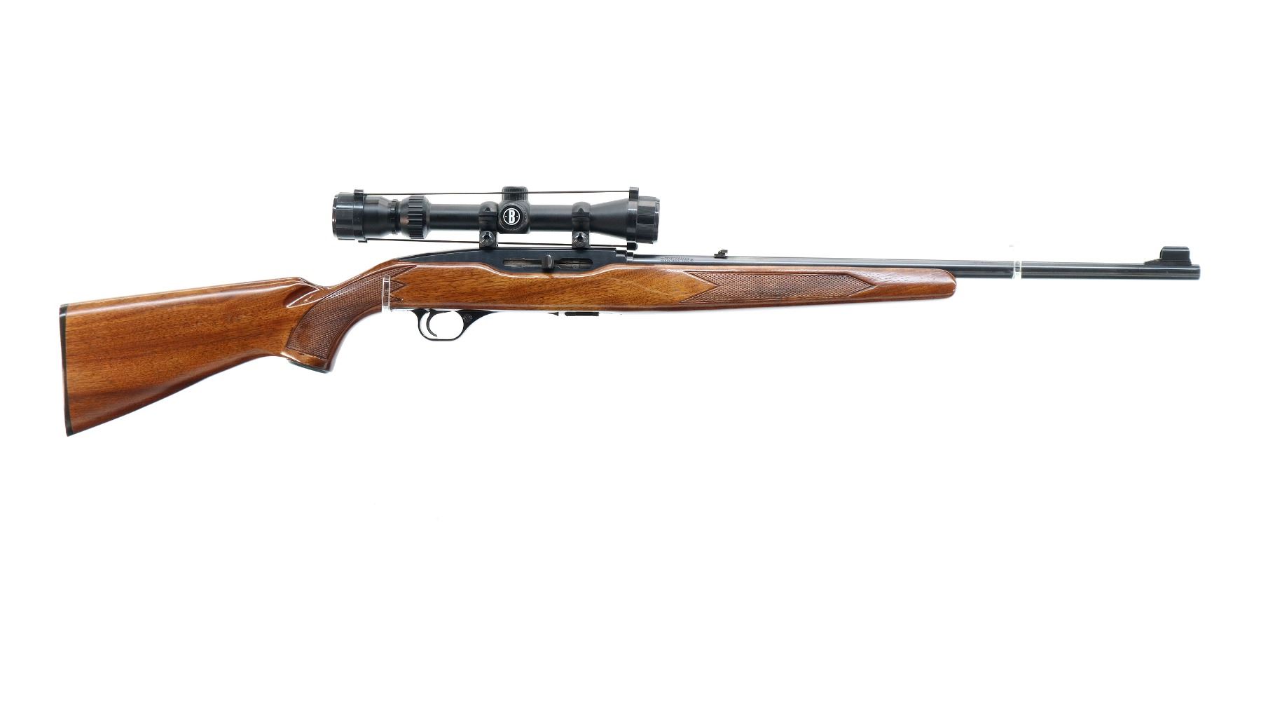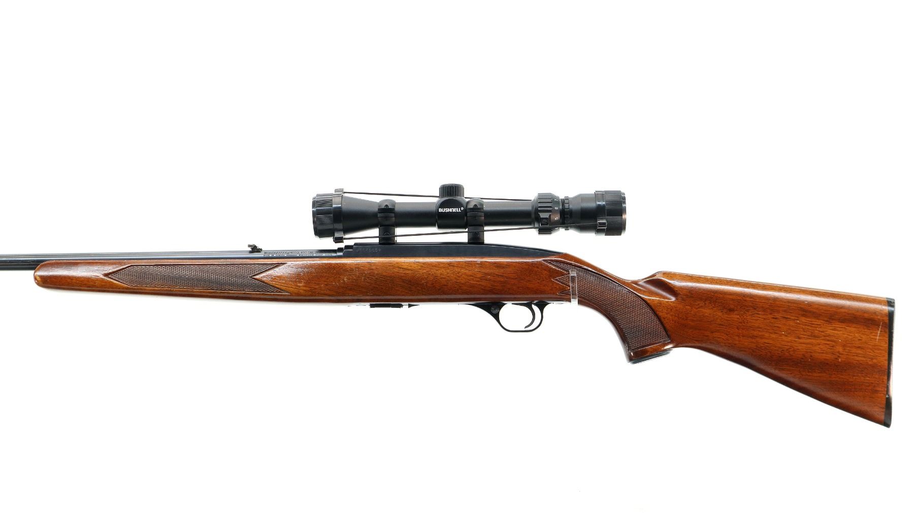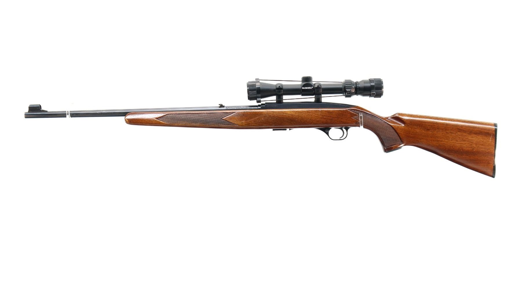 Main Description: Blade front sight with hood and ramp, adjustable folding u notched rear sight, blued finish, grooved receiver with Bushnell 3-9x32 scope installed, clear optics with duplex crosshair. One piece wood stock, checkered forearm, pistol grip and black polymer butt plate, steel grip cap.