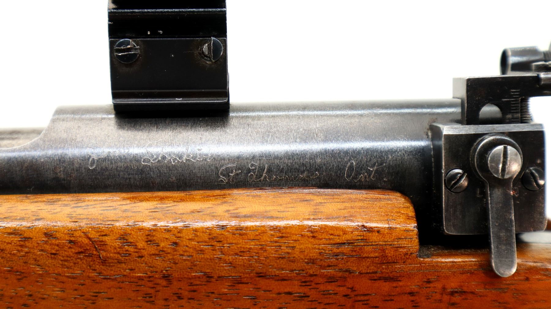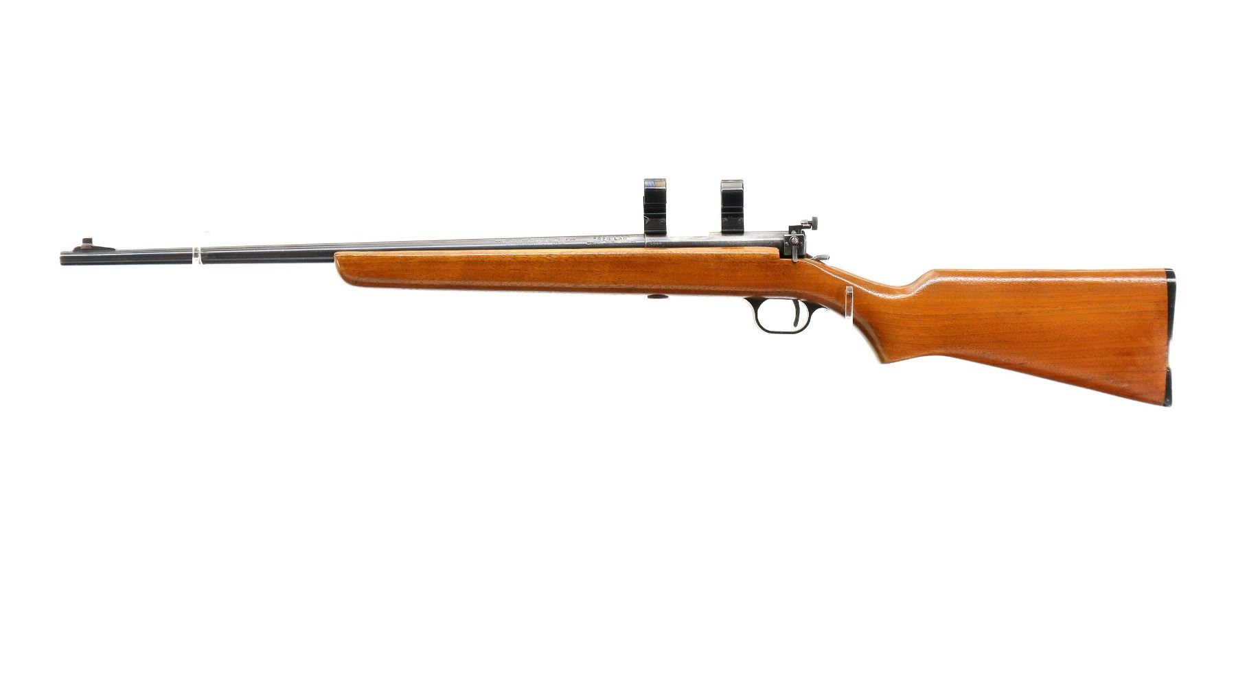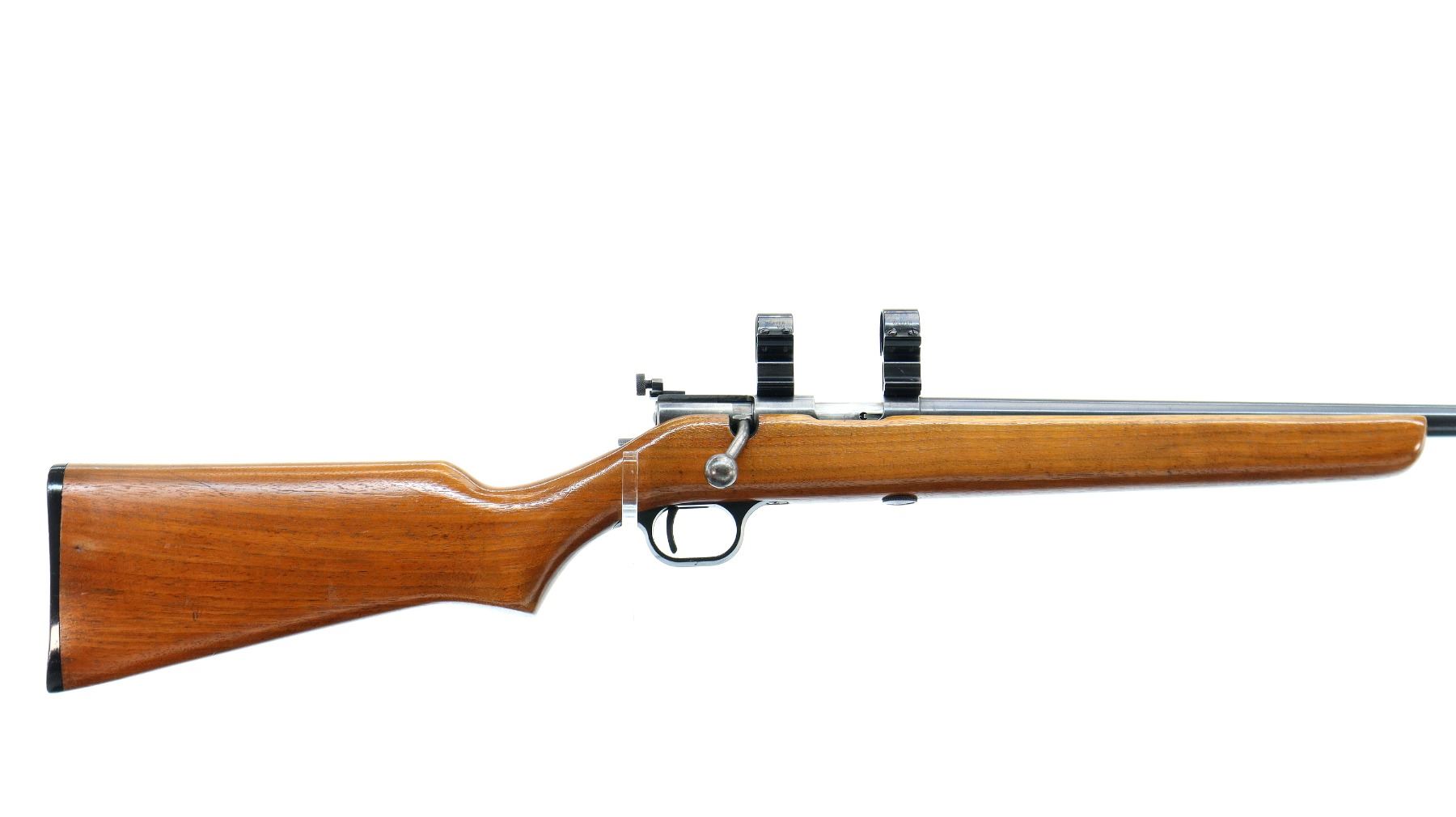 Main Description: Blade front sight with ramp, adjustable rear peep sight, blued finish, receiver drilled and tapped with 1" rings installed, left side of receiver has faint markings etched into it. One piece wood stock, pistol grip, checkered black polymer butt plate