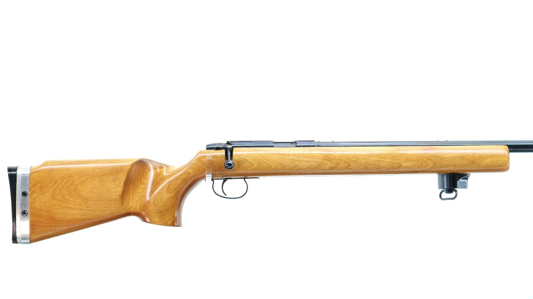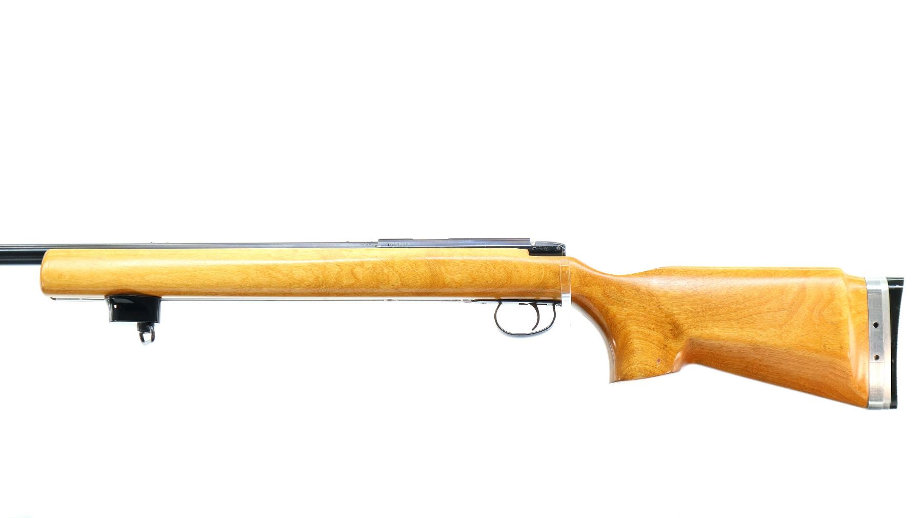 Main Description: No sights, has a Unertl style base at muzzle, possibly reblued finish, heavy barrel drilled and tapped with plug screws installed, grooved receiver. One piece target style wood stock, pistol grip, cheek rest, adjustable checkered black polymer butt plate, full length rail under forearm with black polymer hand stop and swivel.