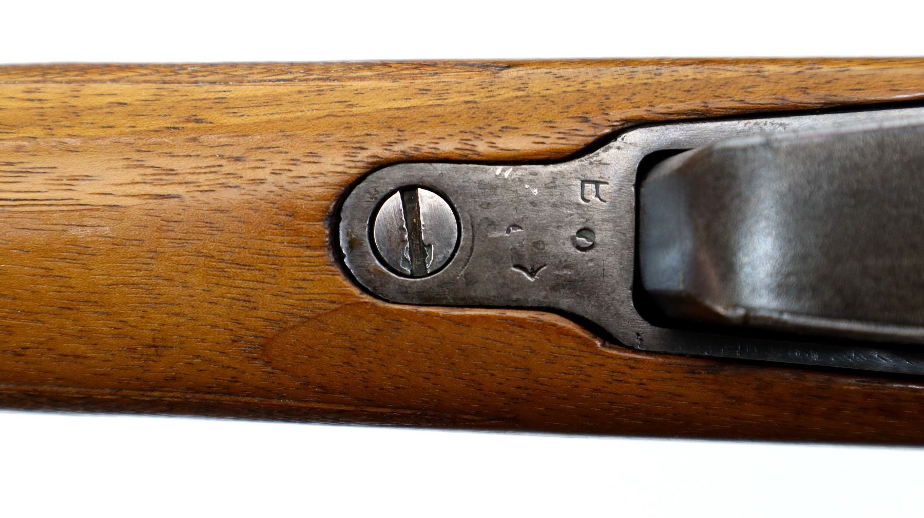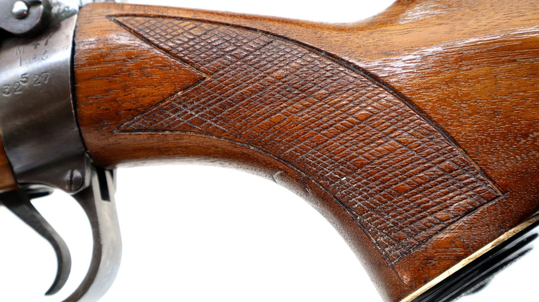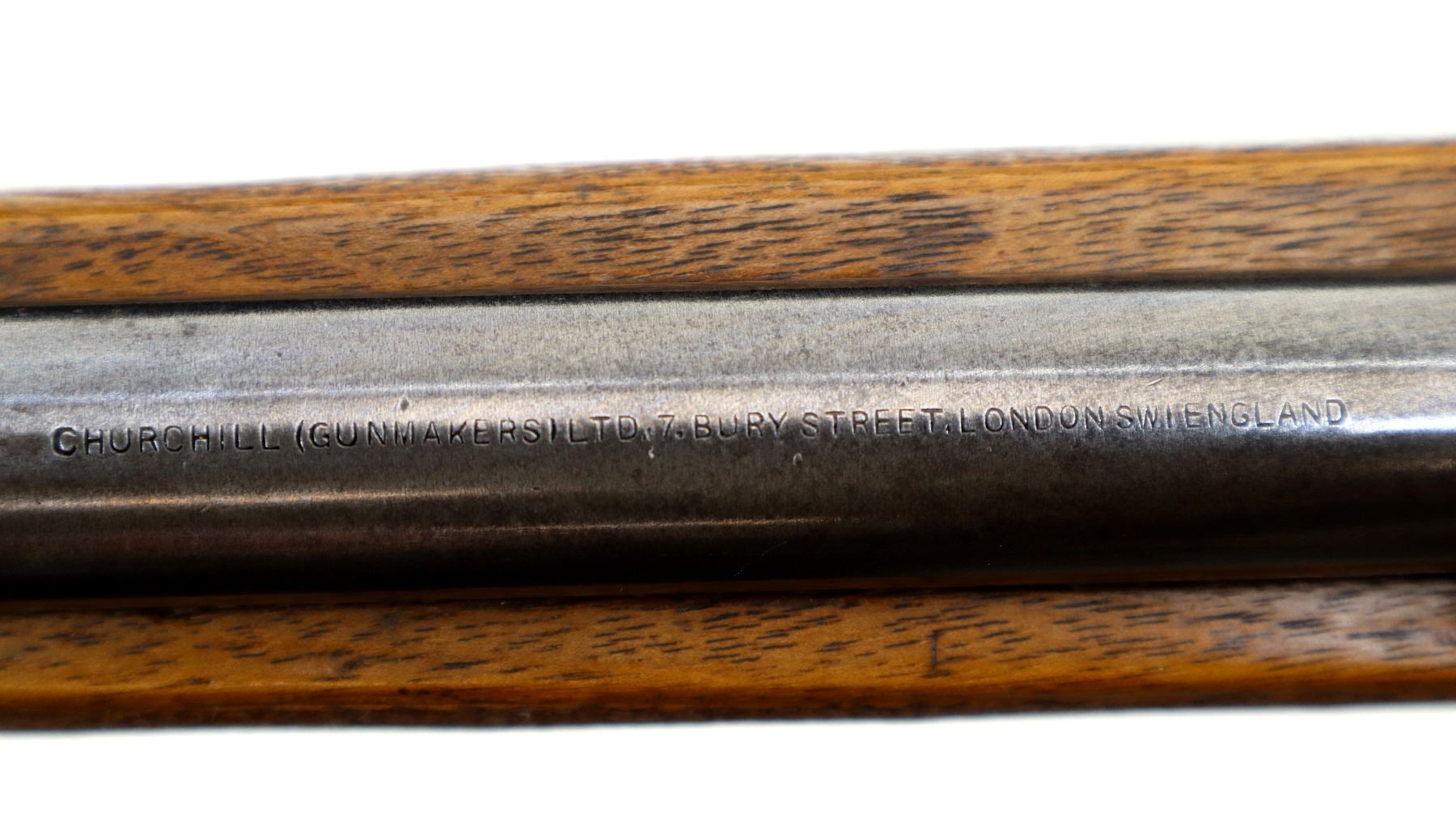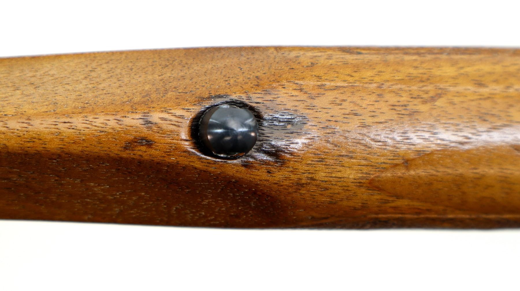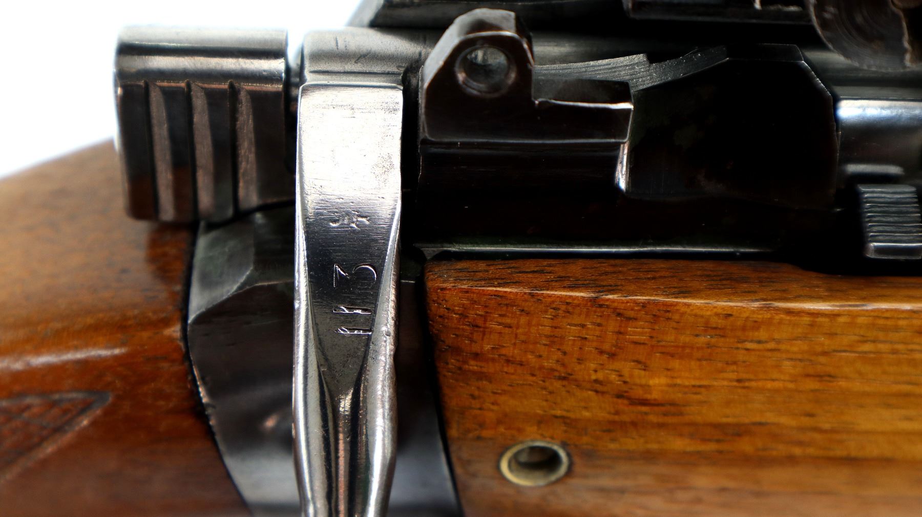 Main Description: Manufactured by M47 1943, bolt matches converted by Churchill. Blade front sight with ramp, missing rear sight, blued finish, receiver drilled and tapped with Bushnell 4x Banner scope installed, clear optics with duplex crosshair, missing rubber eye ring. Two piece Monte Carlo sporter stocks. Schnabel forend tip, checkered forearm and pistol grip, cheek rest, black rubber recoil pad, grip cap, swivel studs.