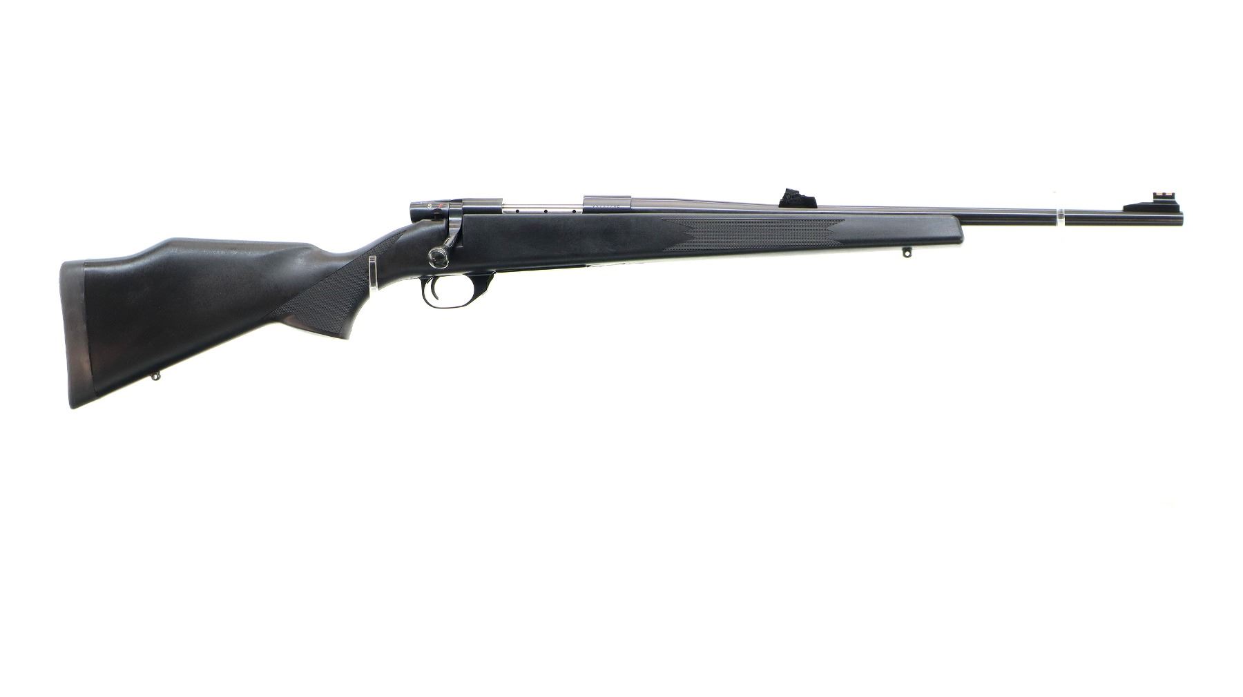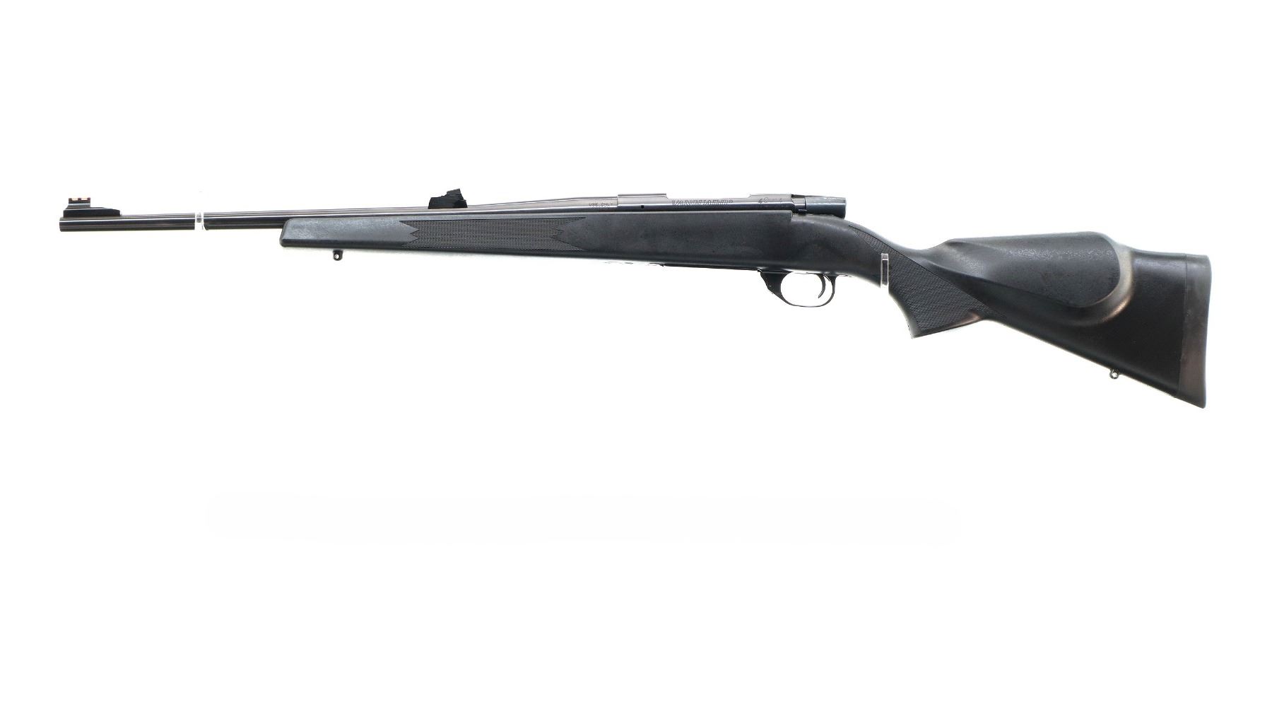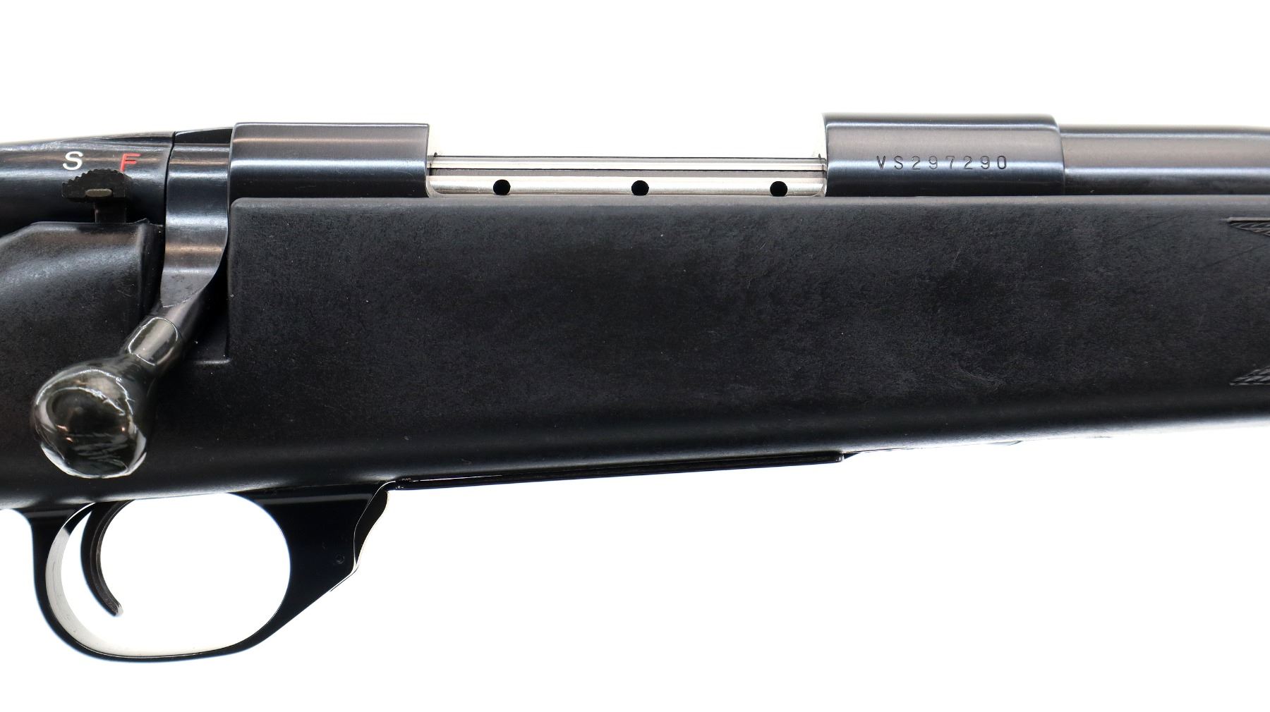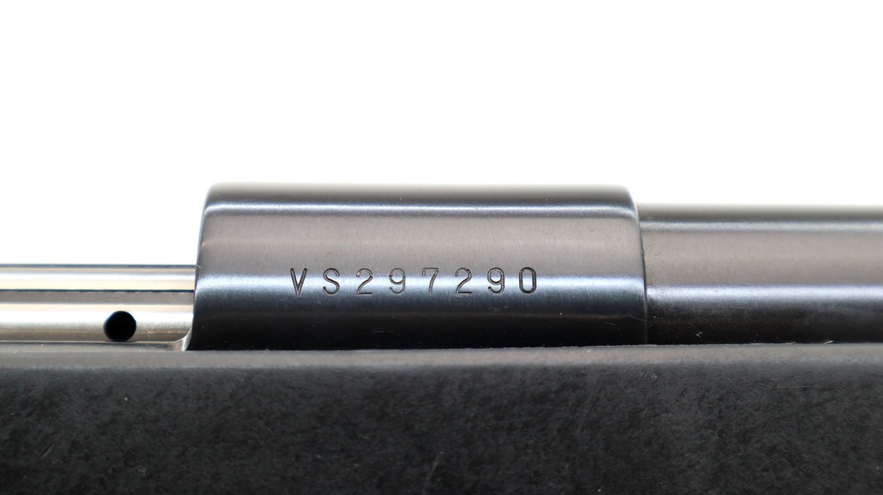 Main Description: Red fiber optic blade front sight with ramp, adjustable u notched green fiber optic rear sight, blued finish, receiver drilled and tapped with plug screws installed, fluted bolt with checkered knob. One piece black synthetic stock, checkered forearm and pistol grip, cheek rest, black rubber recoil pad, hinged floor plate, swivel studs.