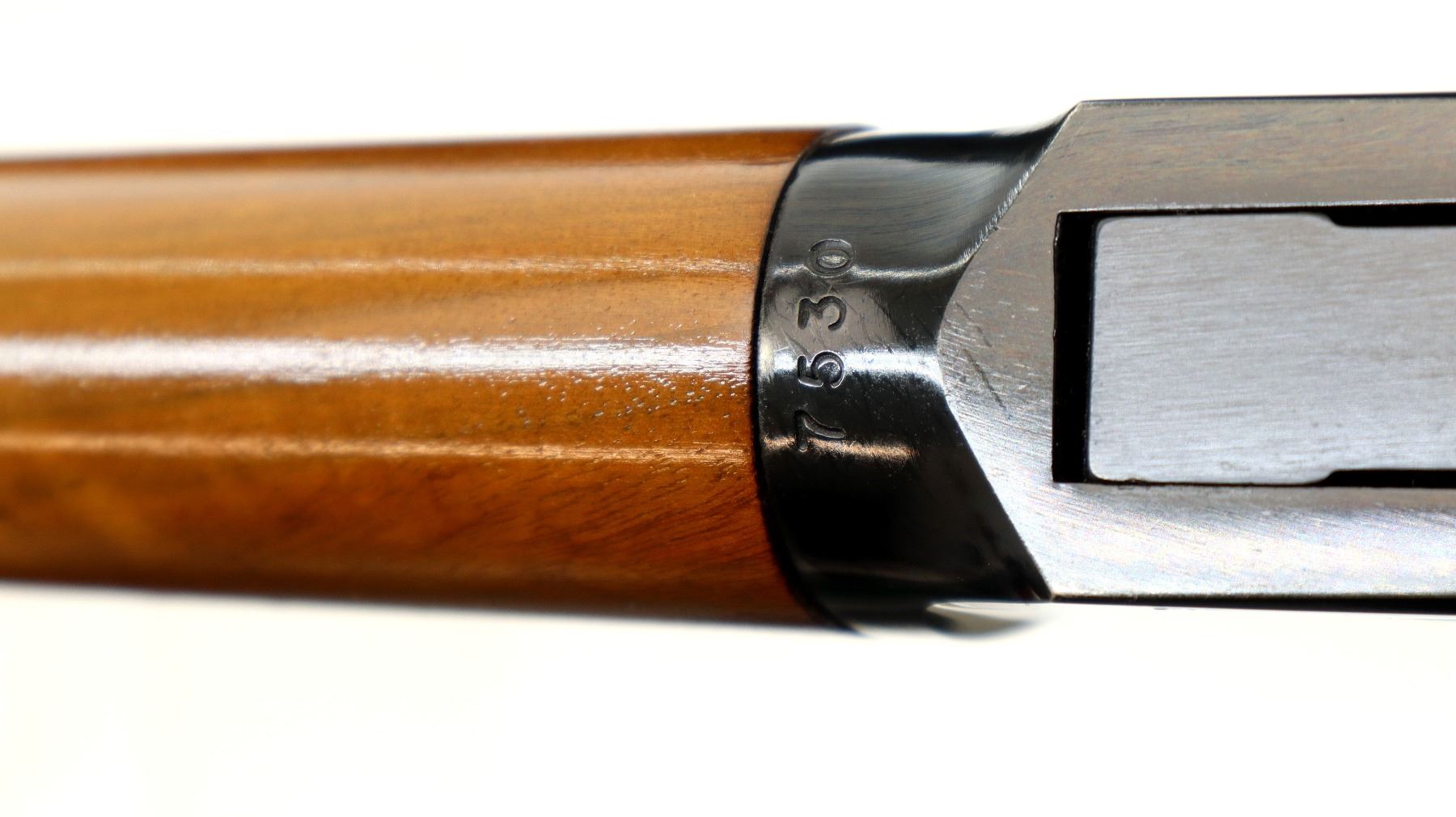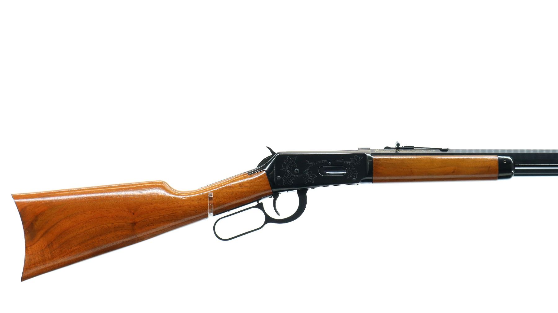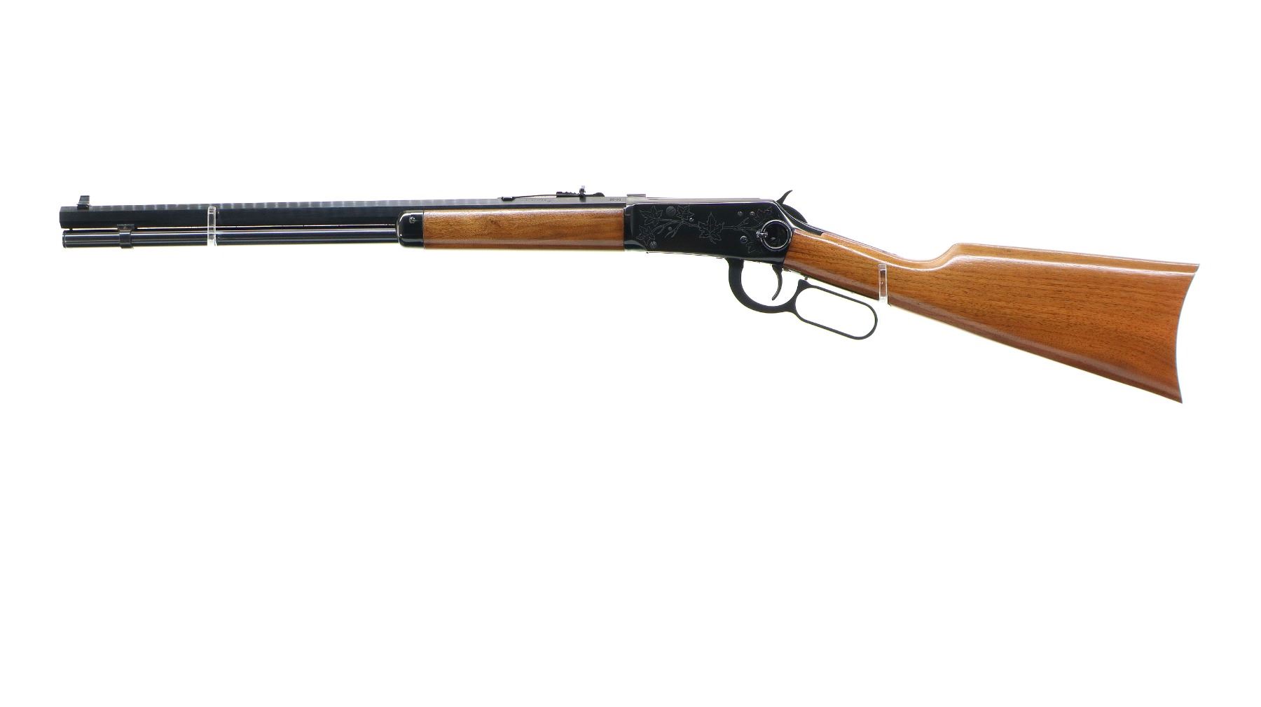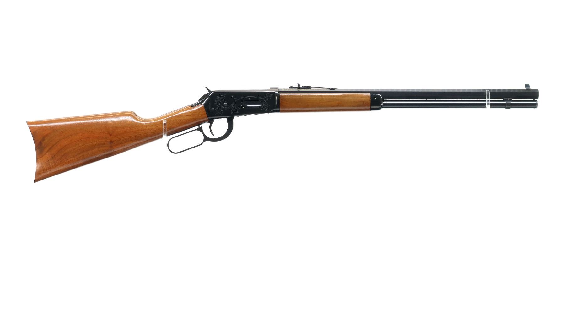 Main Description: Blade front sight, adjustable u notched rear sight, blued finish, octagon barrel, engraved receiver, grooved spur hammer, saddle ring and stud. Two piece wood stocks, straight grip, smooth curved steel butt plate, full length magtube.