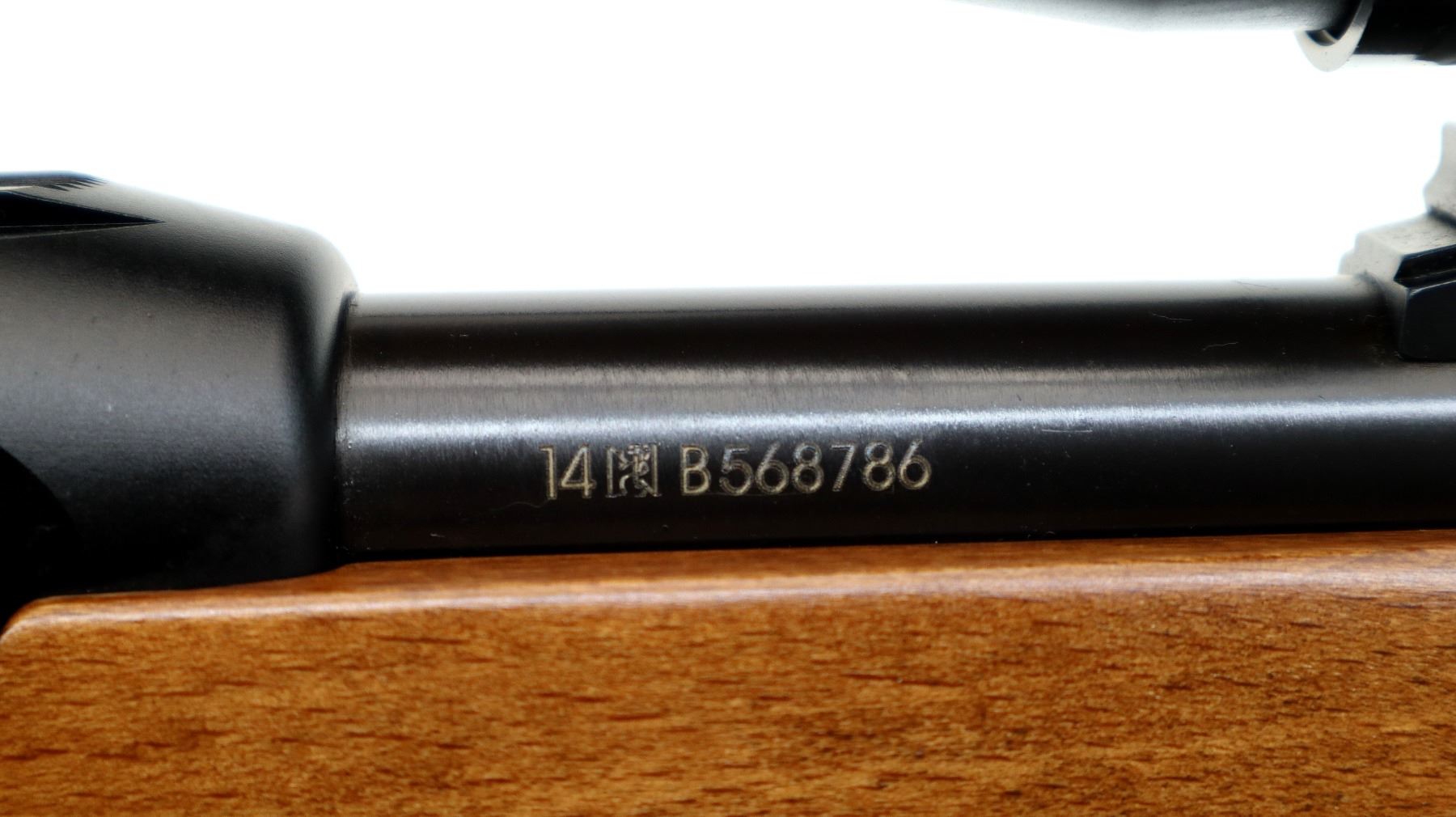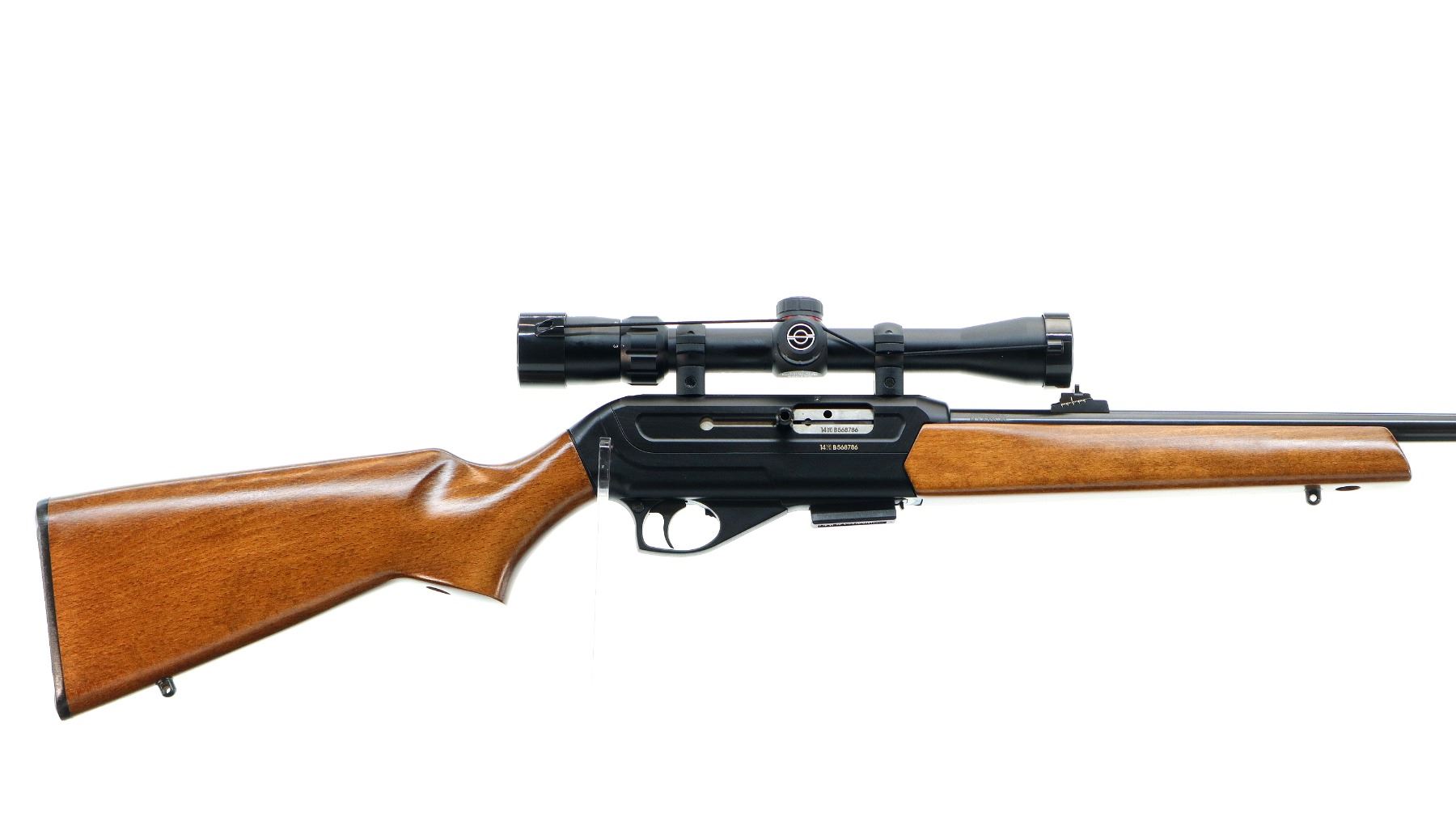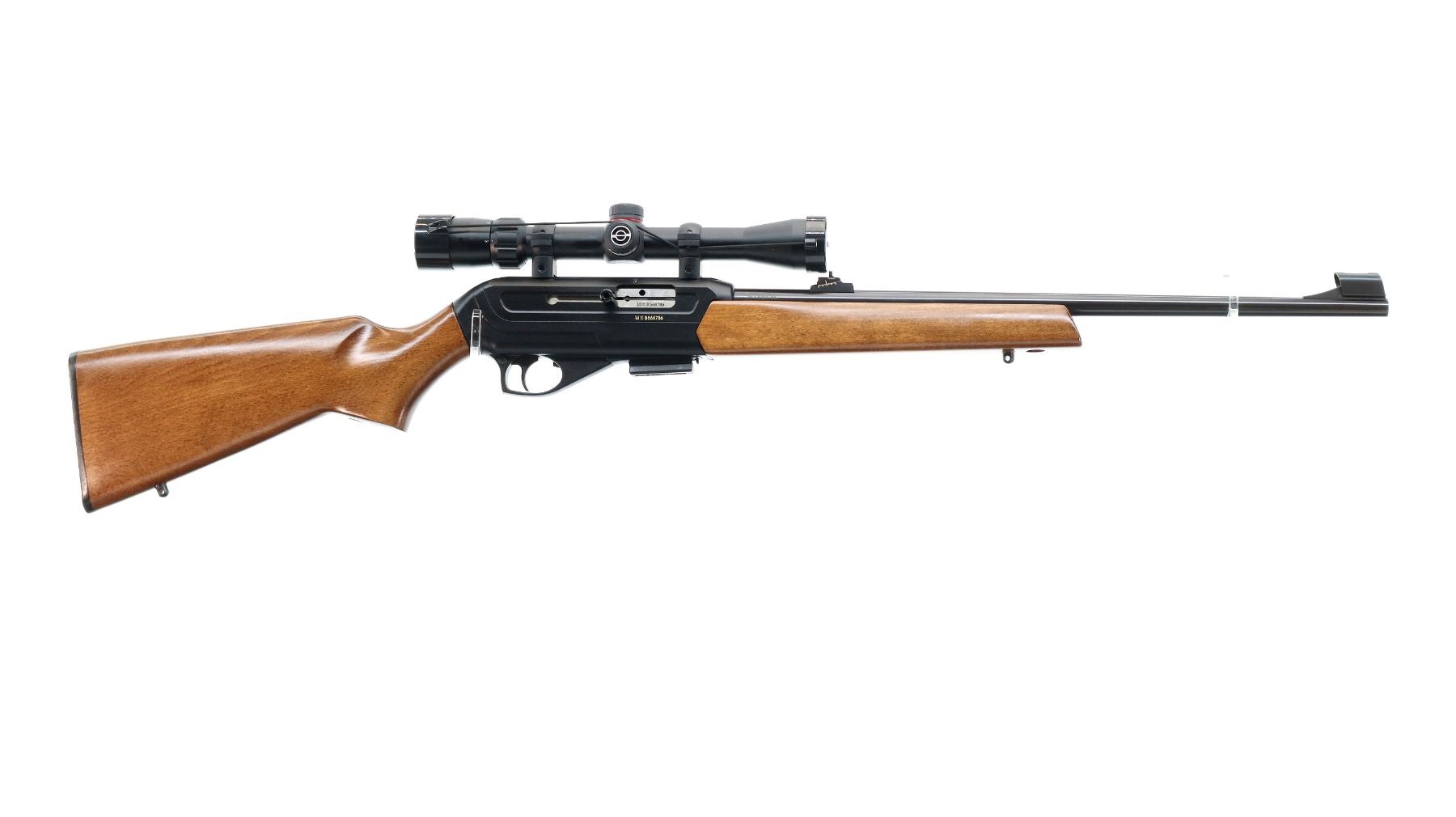 Main Description: Blade front sight with hood and ramp, adjustable u notched rear sight, blued barrel, grooved black alloy receiver with Simmons 22 Mag 3-9x32 scope installed, clear optics with duplex crosshair. Smooth bolt knob. Two piece wood stocks, pistol grip, checkered black polymer butt plate, swivel studs.