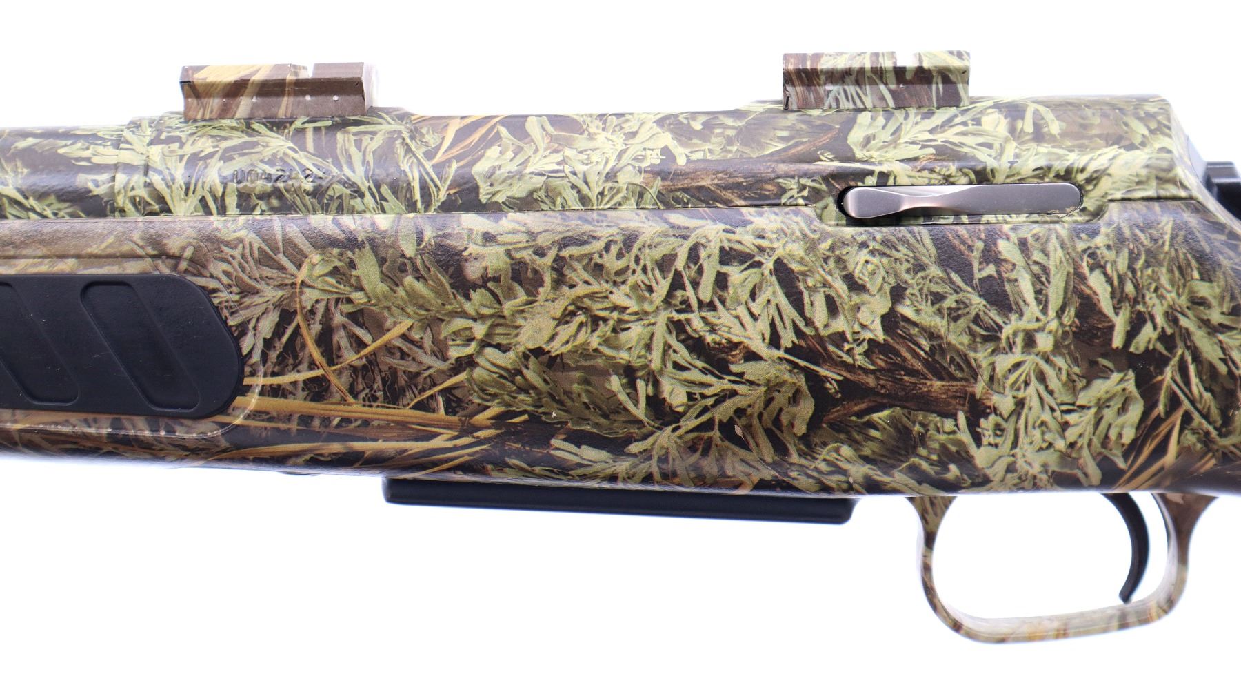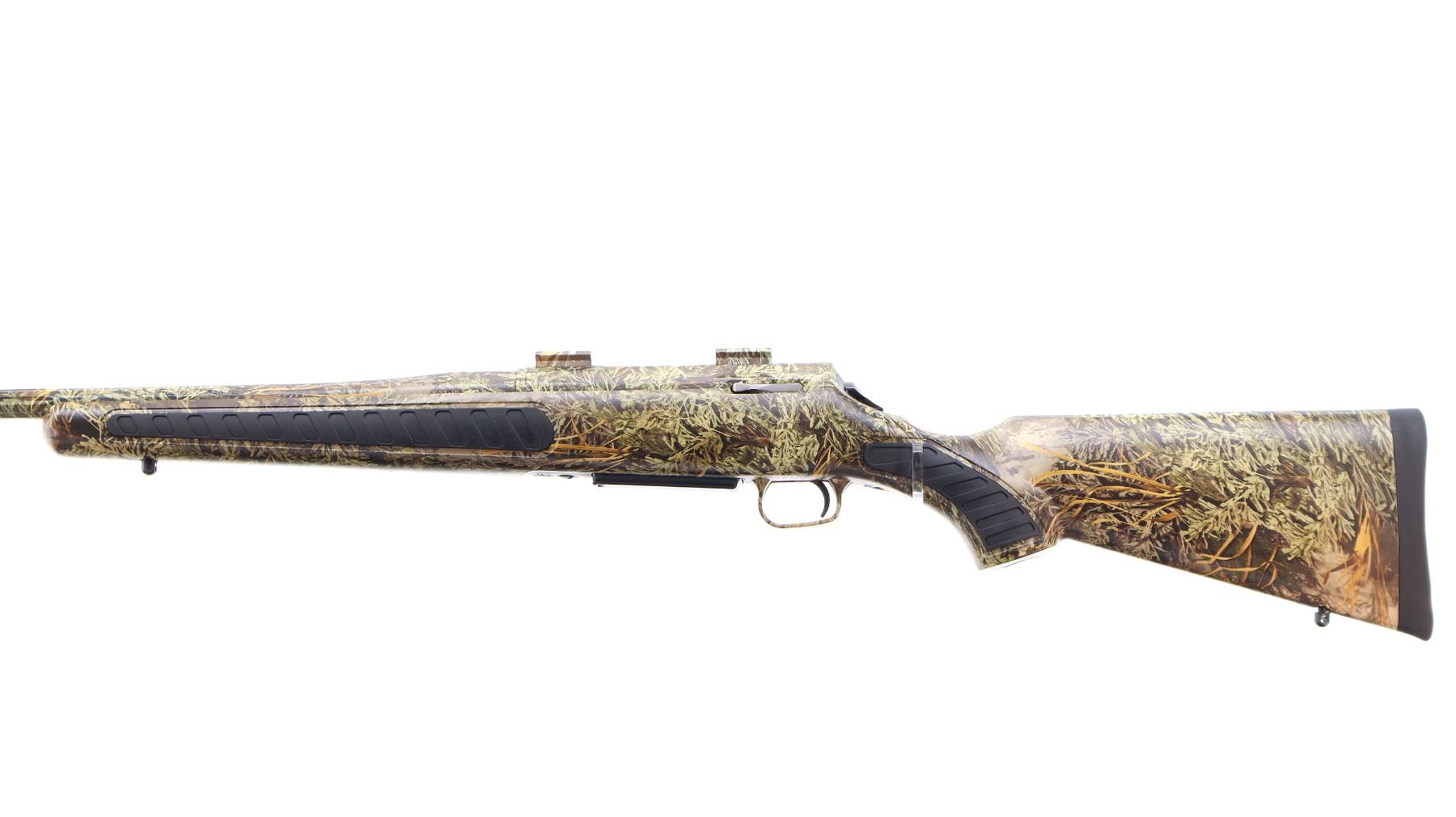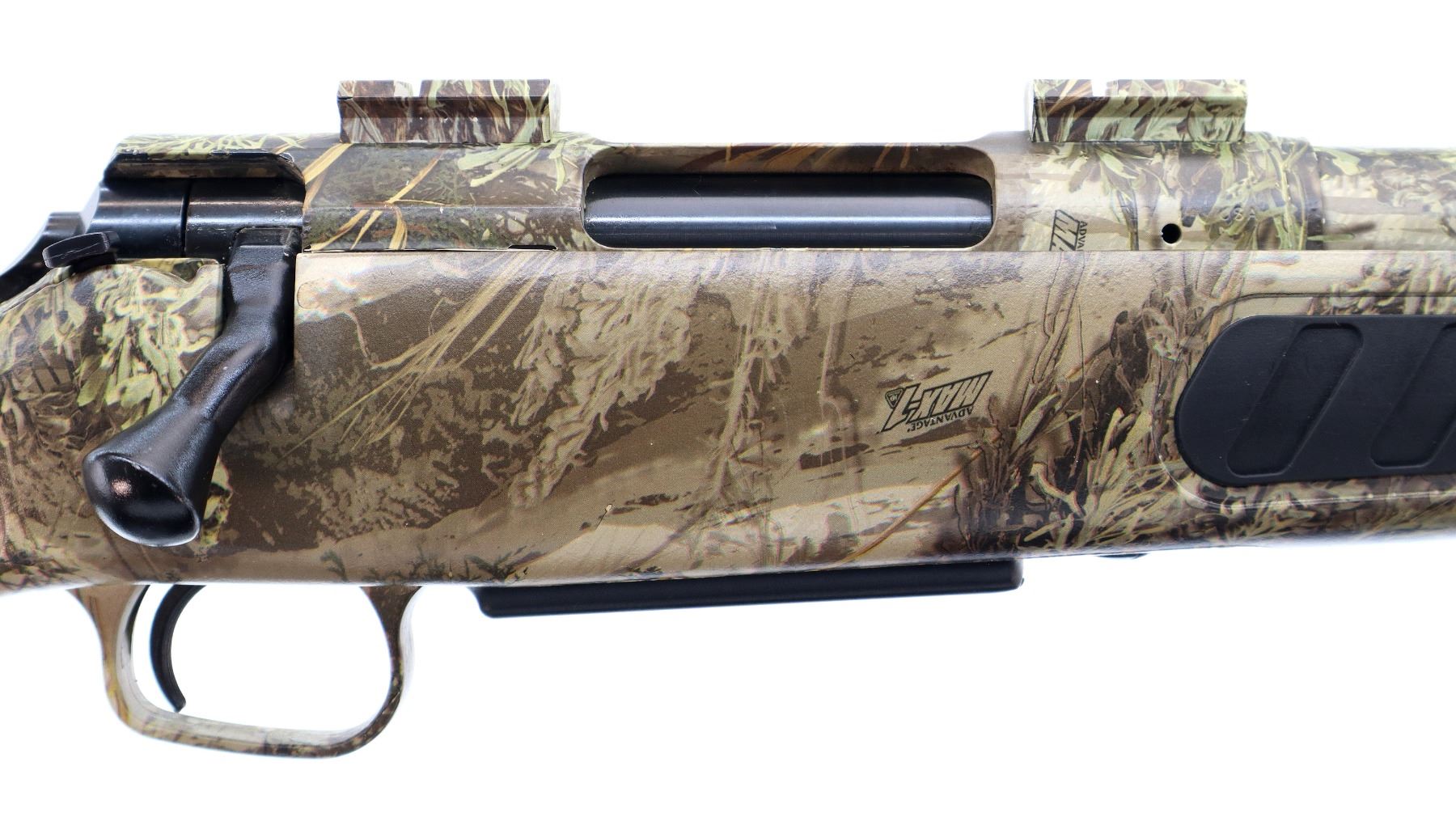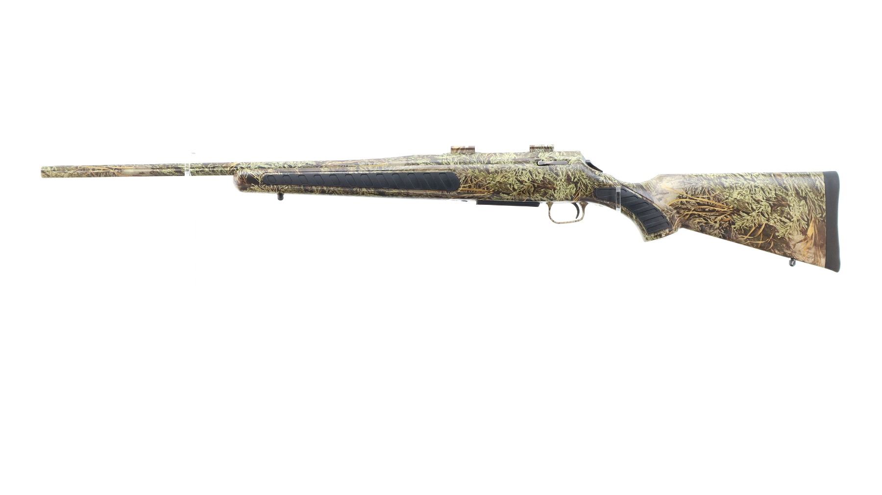 Main Description: No sights, Advantage Max I Camo Finish overall, fluted barrel with 5 R rifling, receiver drilled and tapped with two piece scope bases installed, tapered bolt knob. One piece synthetic stock, black rubber forearm and pistol grip panels, black rubber recoil pad, swivel studs.