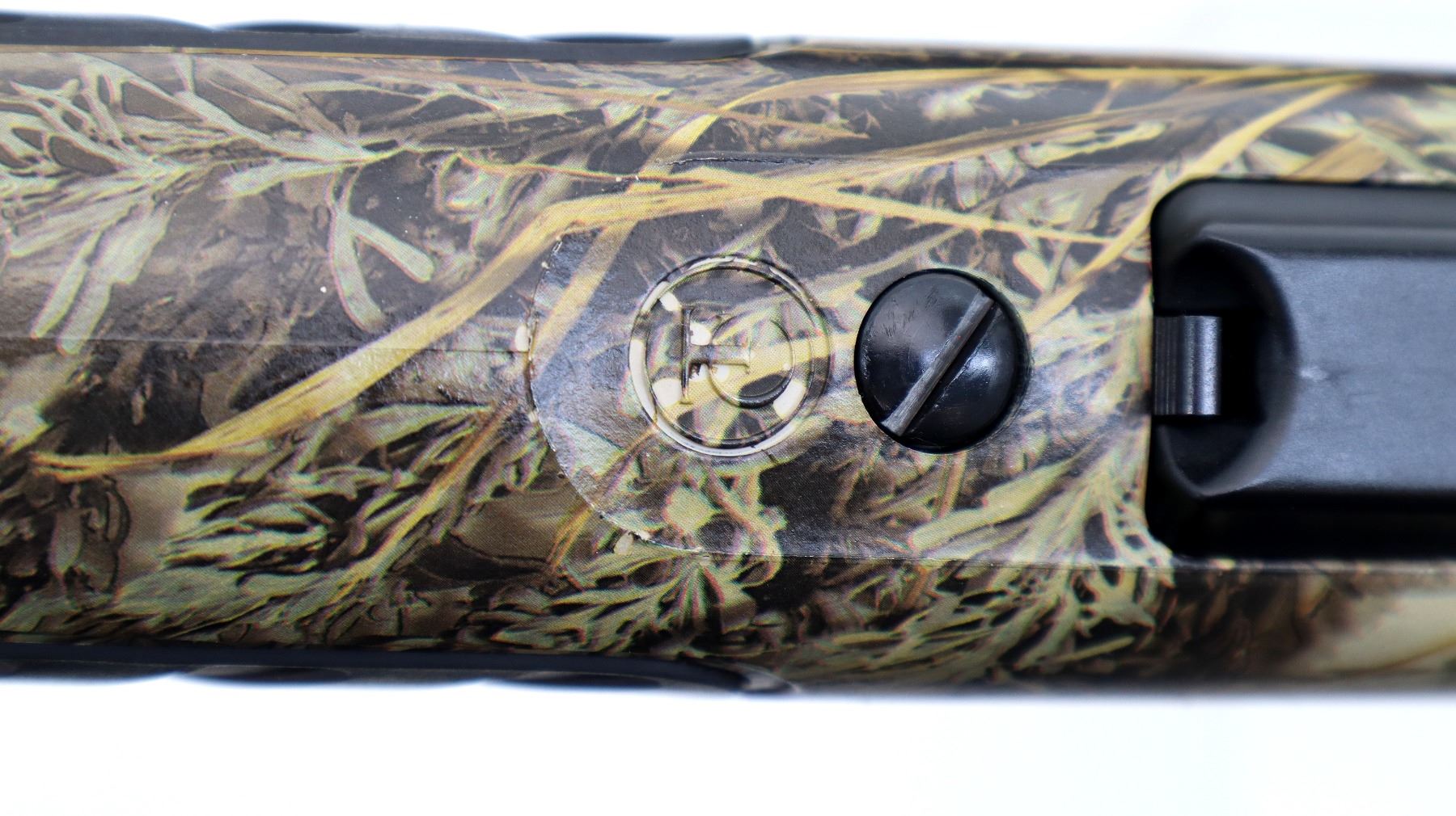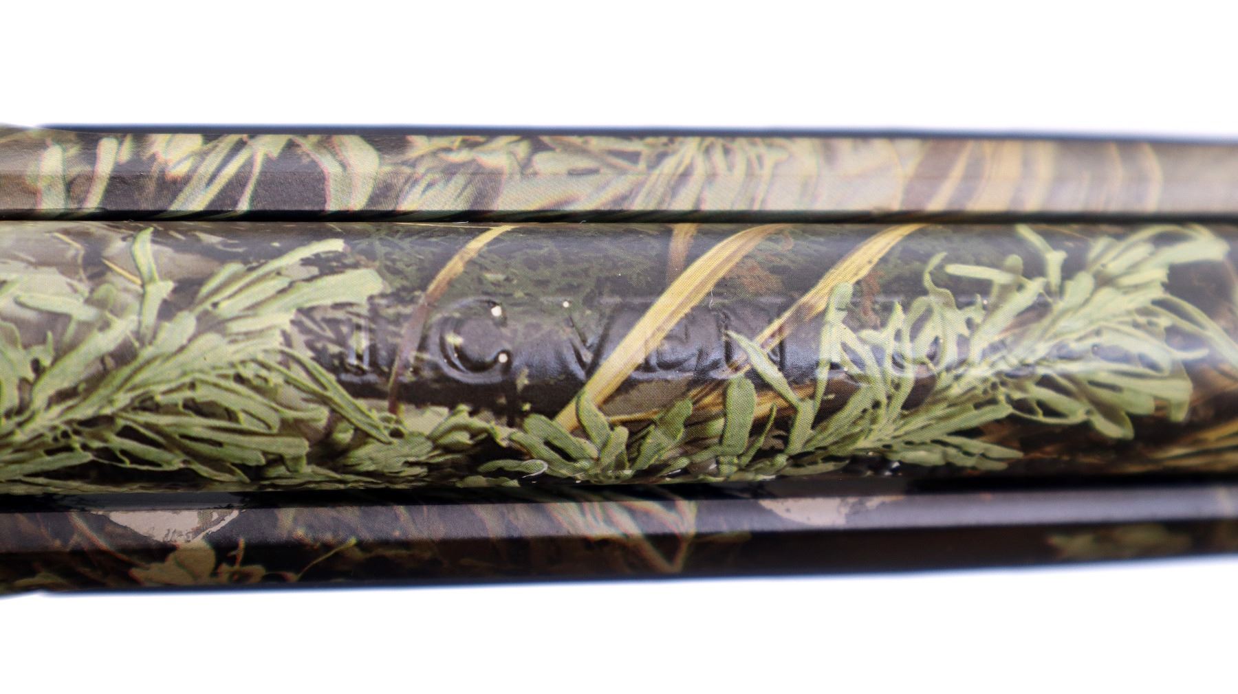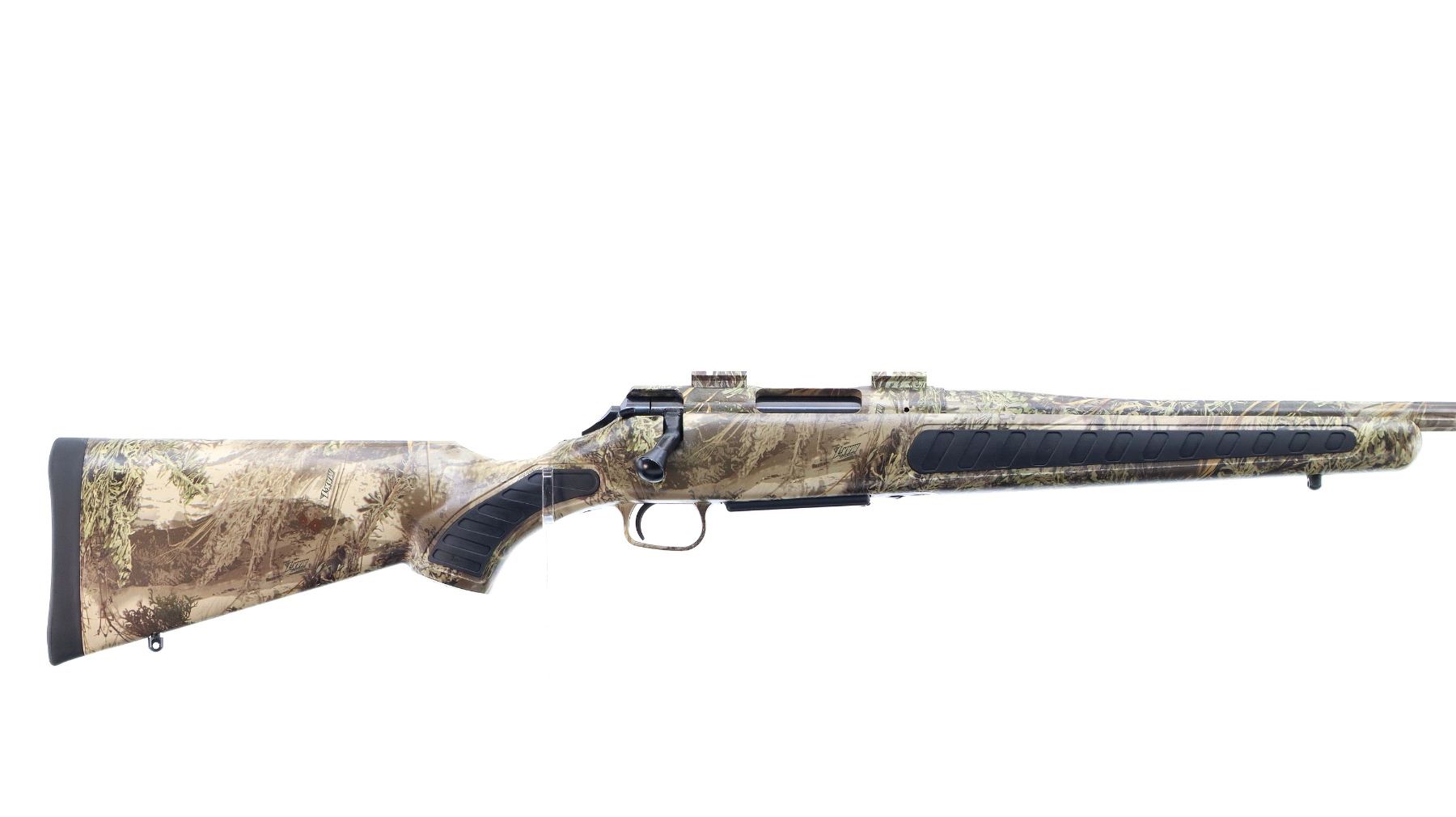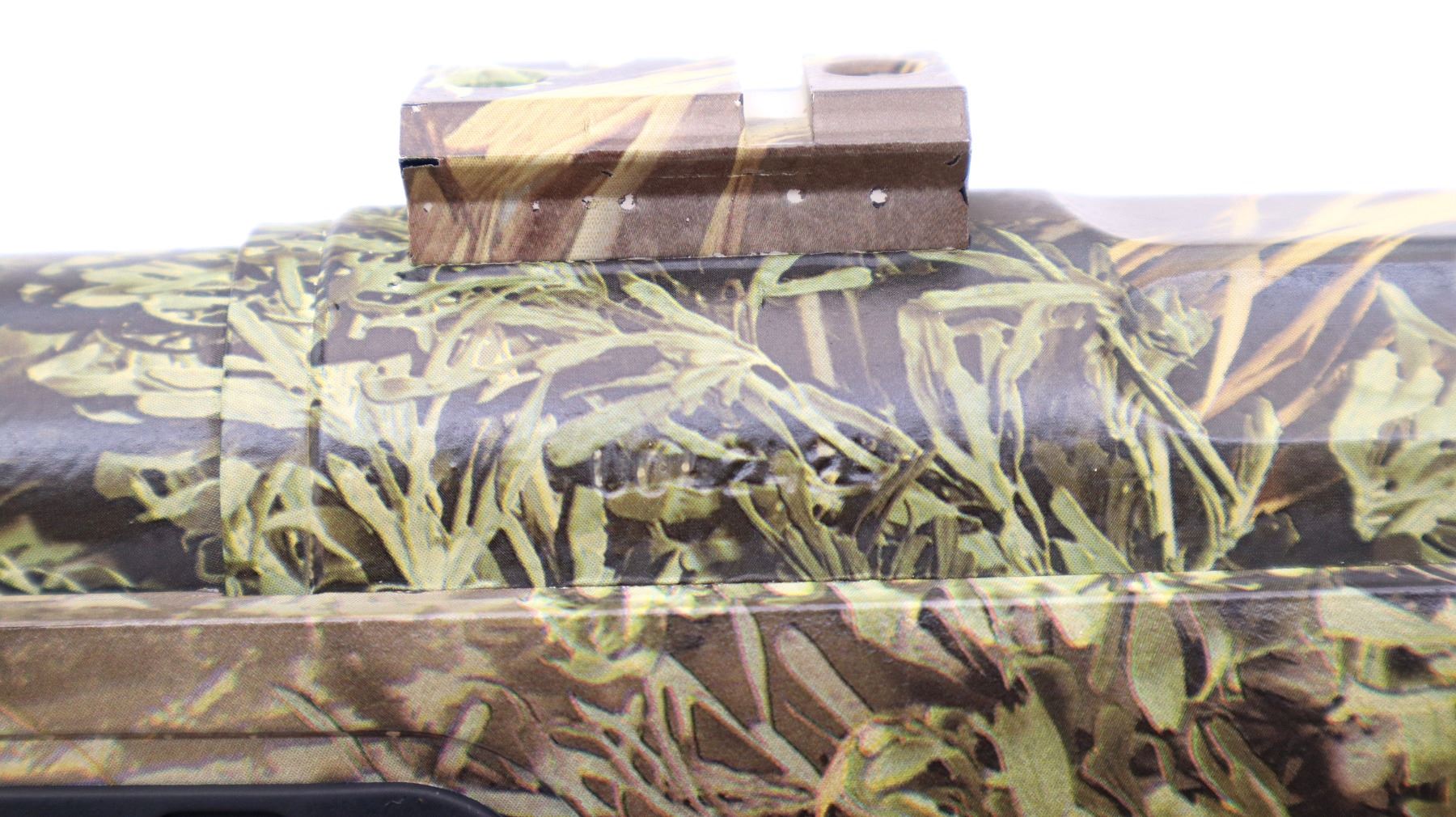 Main Description: No sights, Advantage Max I Camo Finish overall, fluted barrel with 5 R rifling, receiver drilled and tapped with two piece scope bases installed, tapered bolt knob. One piece synthetic stock, black rubber forearm and pistol grip panels, black rubber recoil pad, swivel studs.