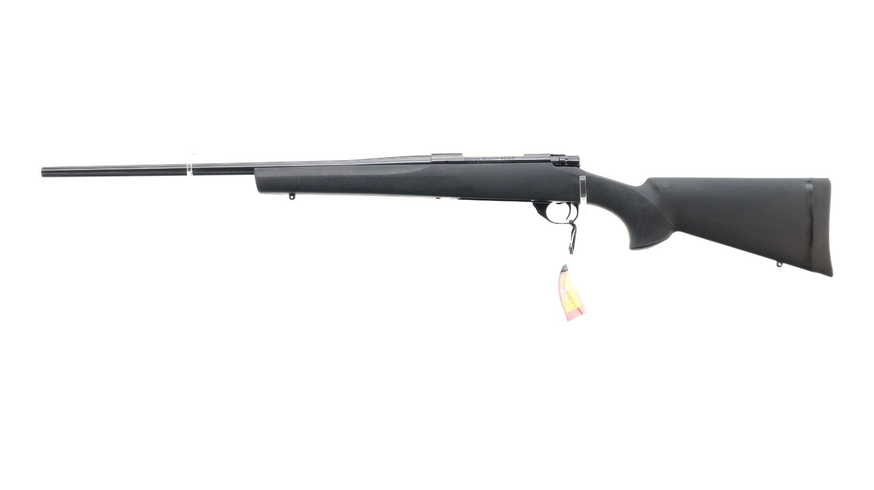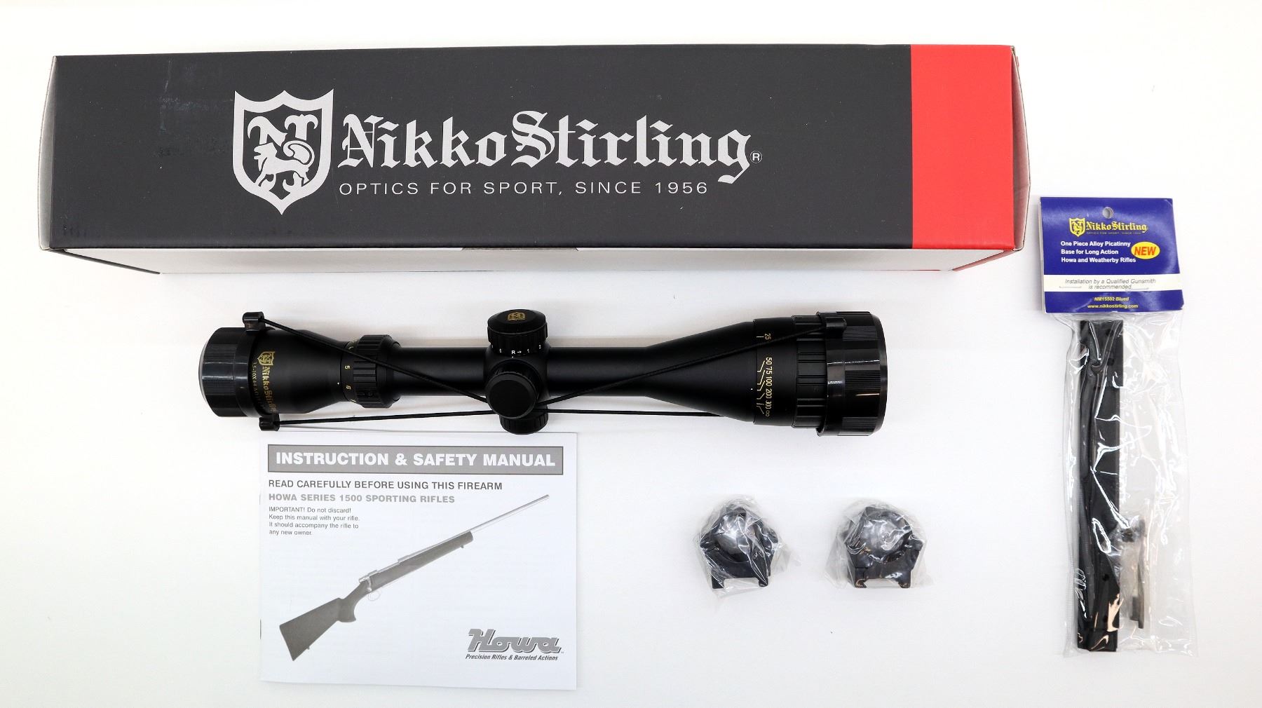 Main Description: No sights, blued finish, receiver drilled and tapped with plug screws installed, smooth bolt knob. One piece Hogue over mold black synthetic stock, textured forearm and pistol grip panels, black rubber recoil pad, hinged floor plate, swivel studs, retains factory hang tags. Accessories include: Niko Sterling Game King Side LRX 3.5-10 x 44 AO IR Scope, clear optics, range finding reticle, illuminated green and red that functions. One piece rail, one set of rings.