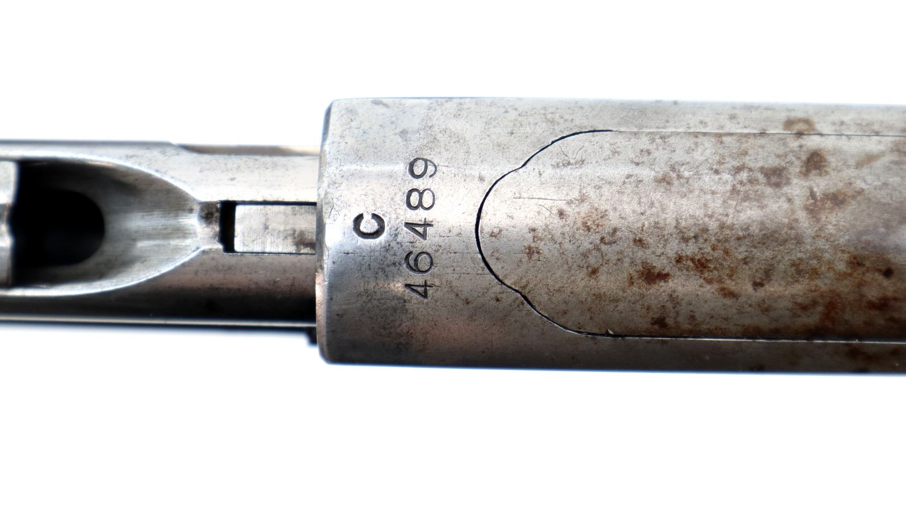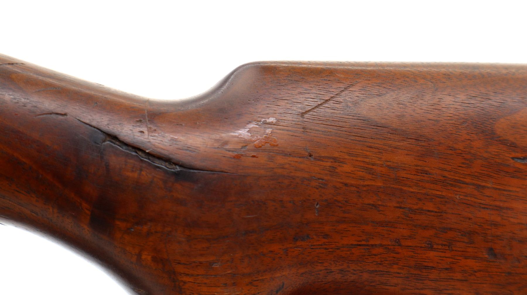 Main Description: This rifle has Crossed Flags with DCP on the barrel indicating Dominion of Canada Possibly used for Prison of War Guards. Blade front sight, original adjustable u notched rear sight. Two piece wood stocks, grooved forearm, pistol grip chipped and cracked behind receiver, checkered steel butt plate, full length magtube.