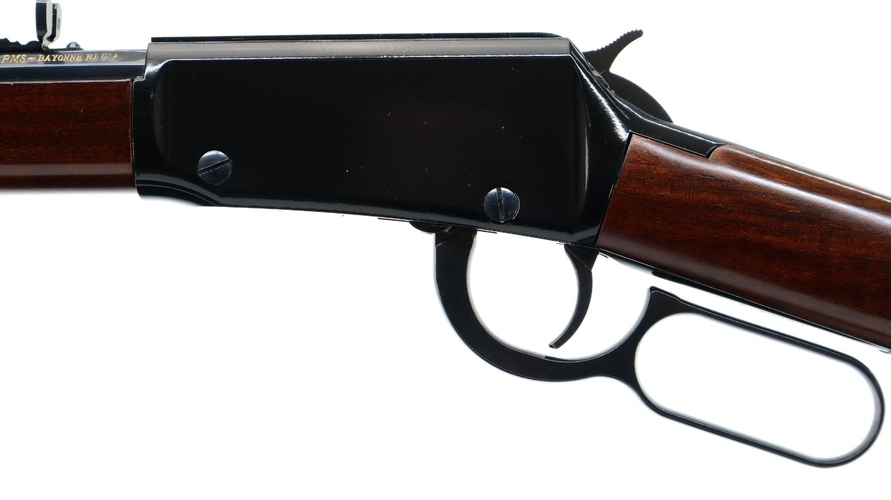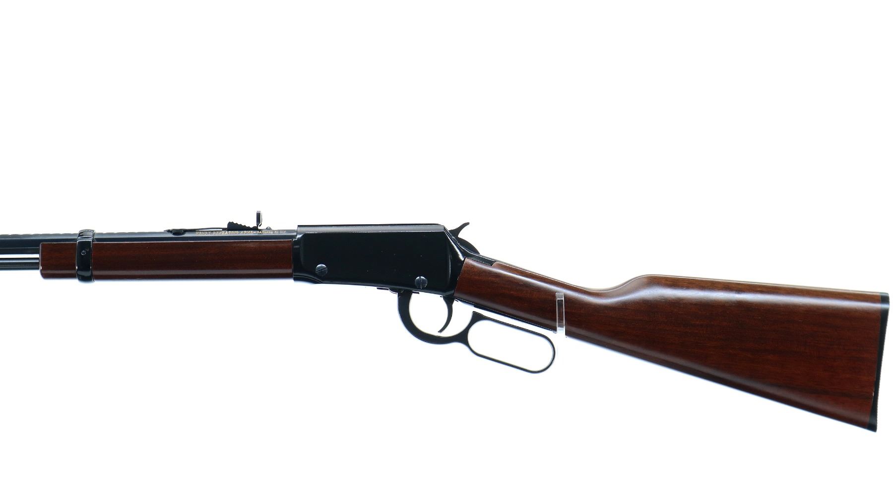 Main Description: Blade front sight, adjustable u notched rear sight, blued octagon barrel and full length magtube, grooved black alloy receiver, spur hammer. Two piece wood stocks, straight grip, checkered black polymer butt plate.