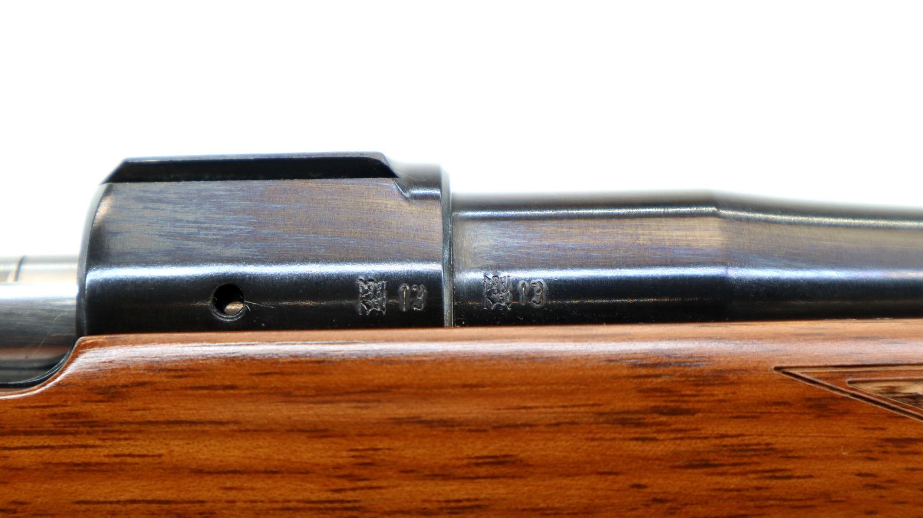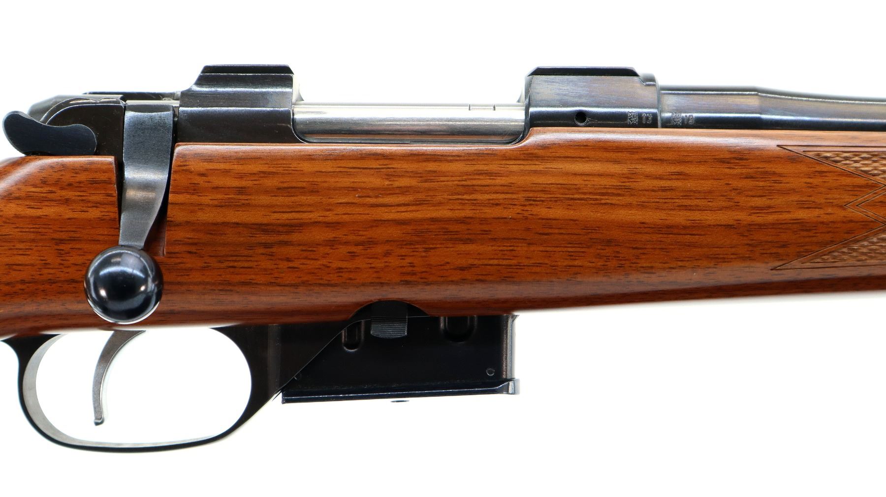Main Description: No sights, polish blued finish, receiver has integral scope bases, smooth bolt knob. One piece wood stock, checkered forearm and pistol grip, black rubber recoil pad, swivel studs.