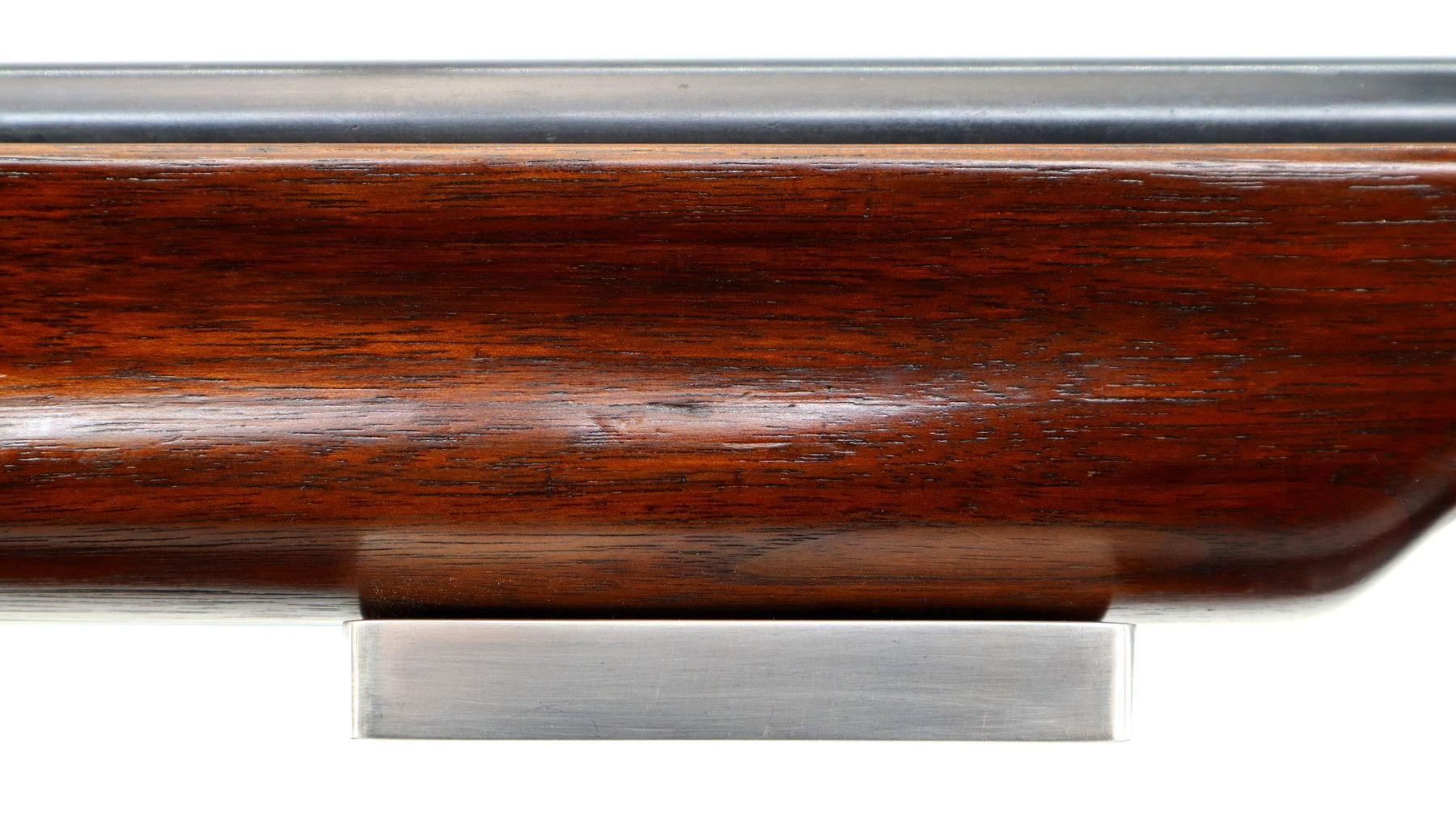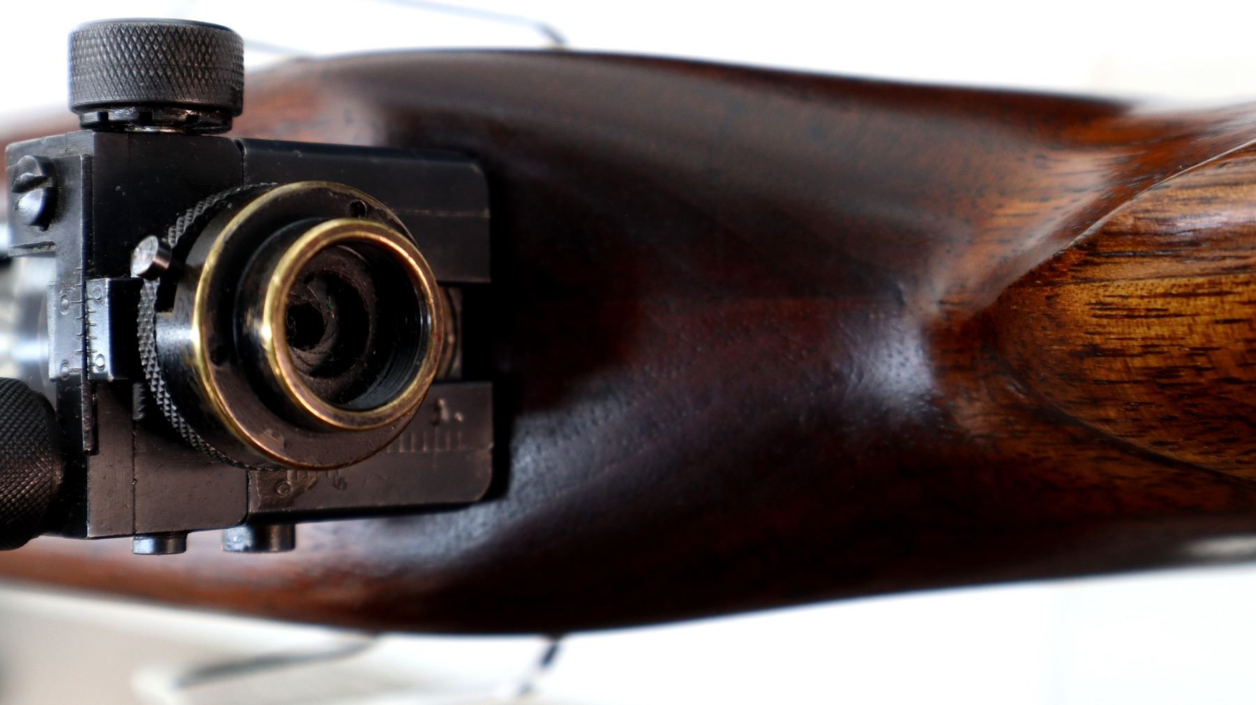 Main Description: Parker Hale globe front sight with insert, adjustable rear peep sight, blued finish, heavy barrel drilled and tapped in four spots with plug screws installed, note: two other spots are misaligned with plug screws installed. One piece custom target wood stock, finger grooved forearm, pistol grip, cheek rest, smooth flat chromed butt plate, 13.75" LOP, hooked opening lever, full length rail under forearm with large flat chromed plate.