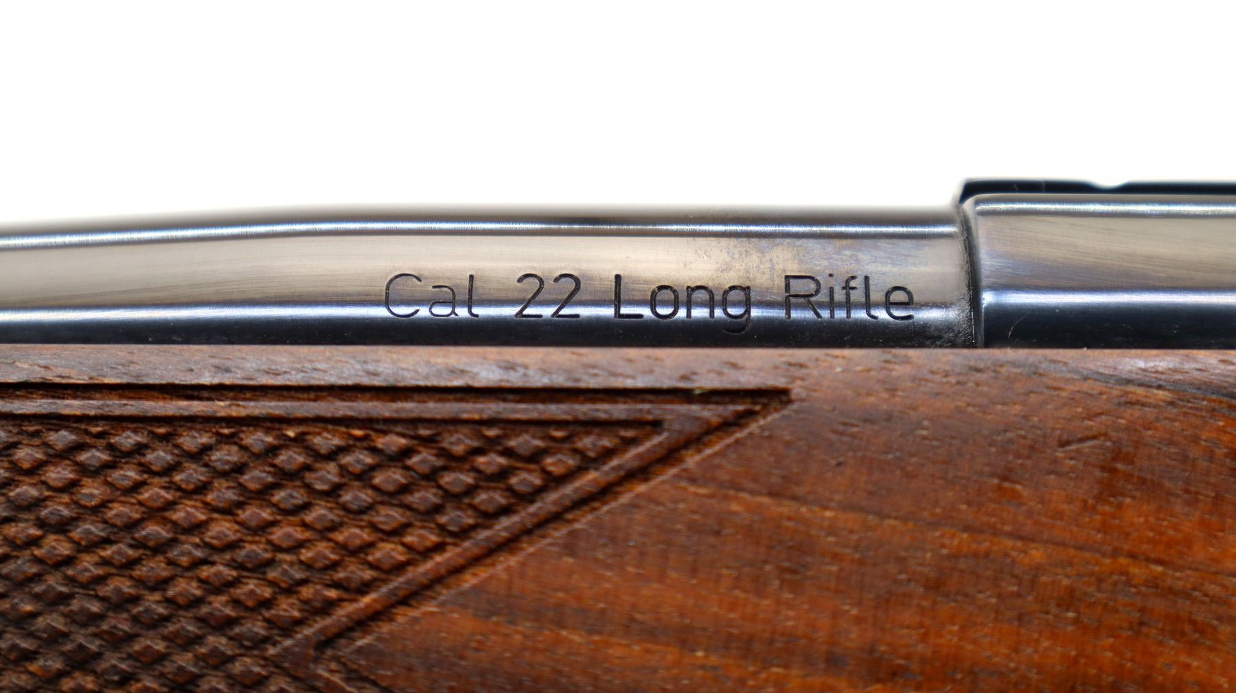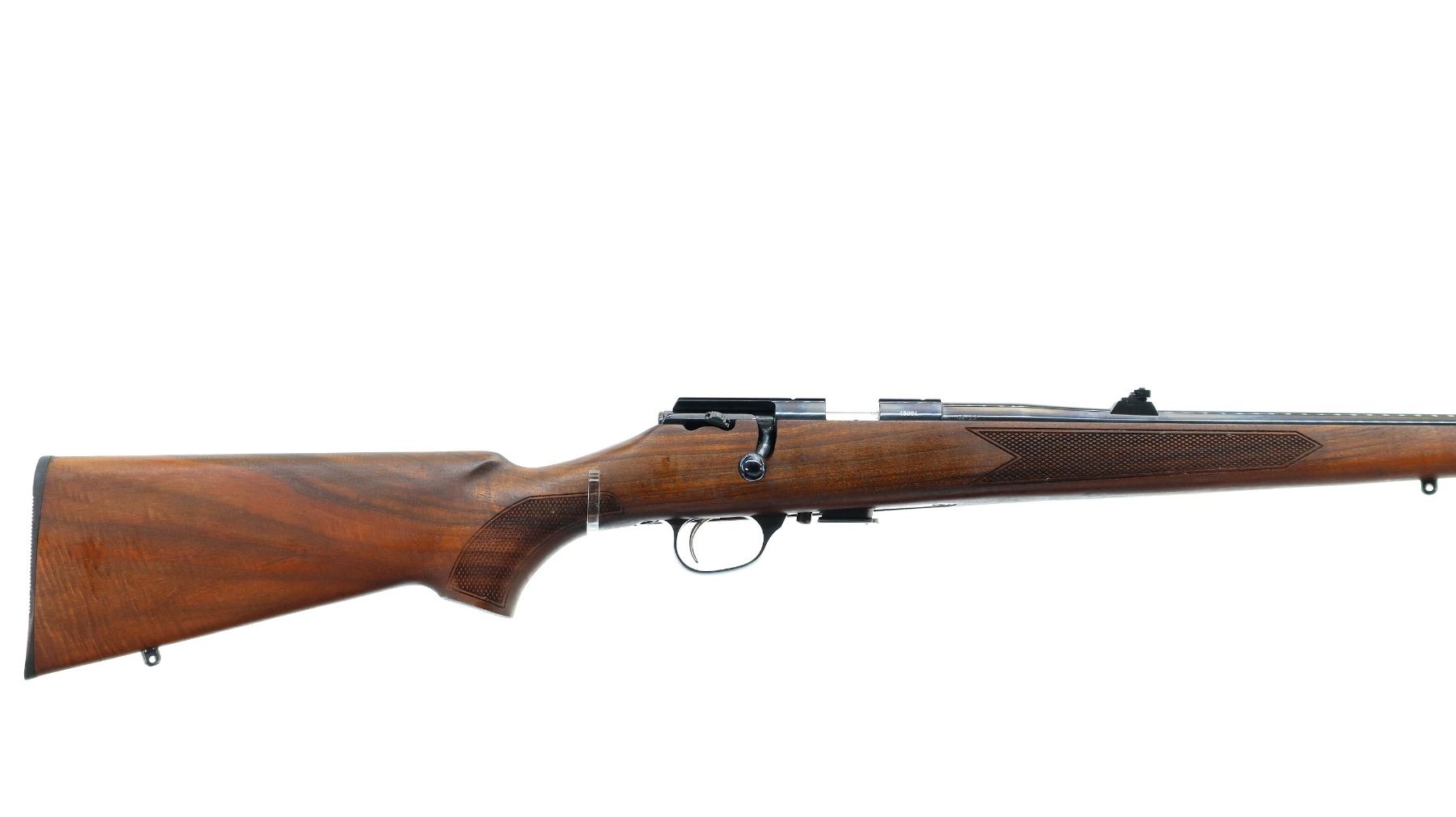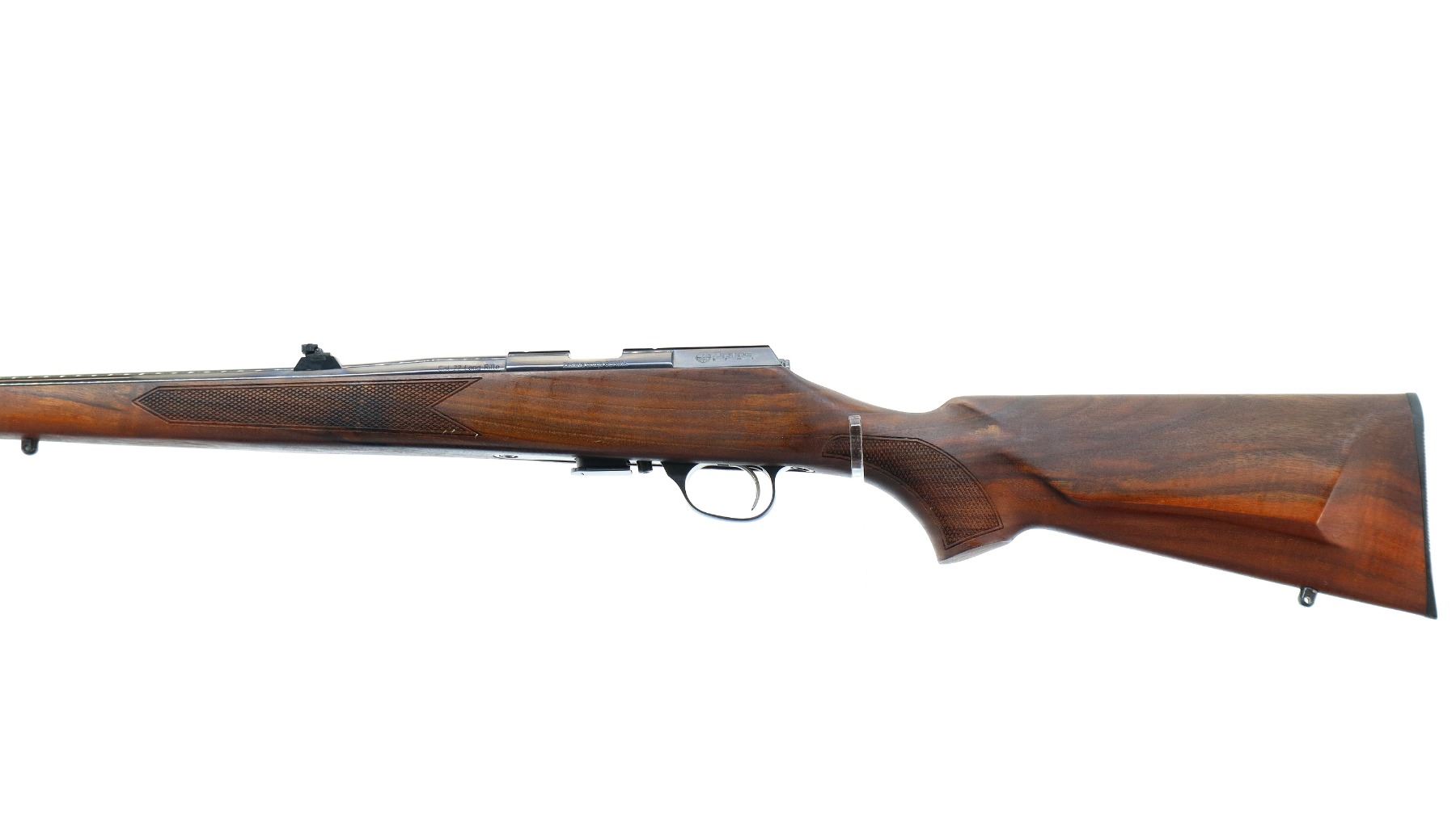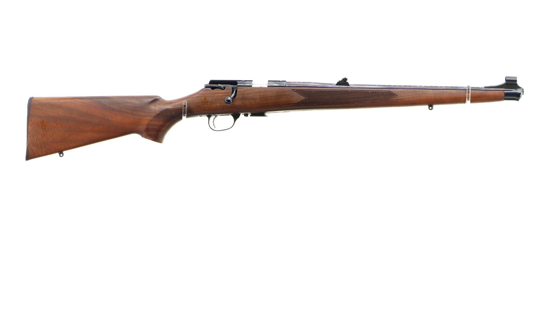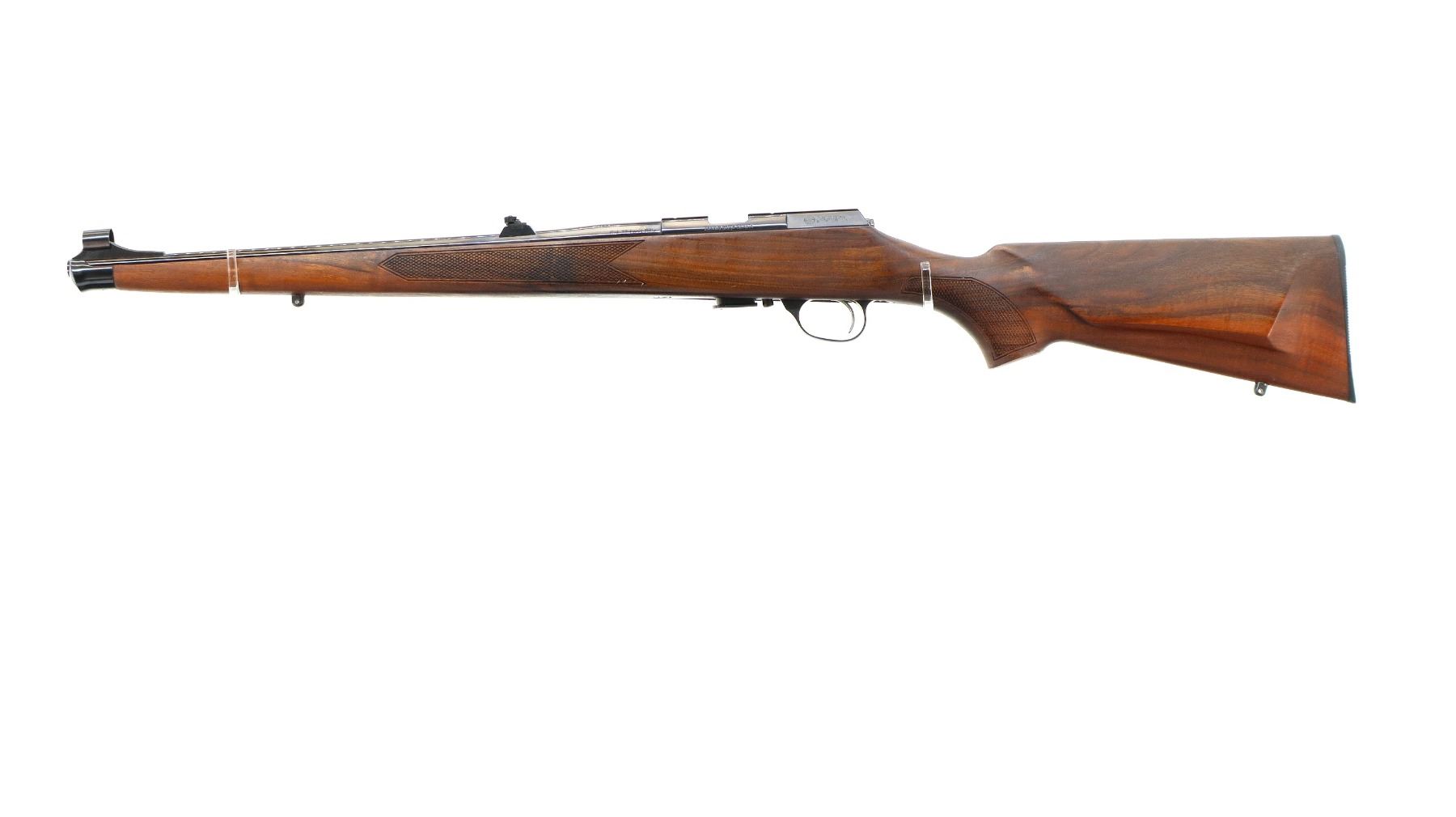 Main Description: Blade front sight with hood and ramp, adjustable folding u notched rear sight, blued finish, receiver grooved for scope mount, smooth bolt knob. One piece full Mannlicher stock, checkered forearm, pistol grip, cheek rest, grooved black polymer butt plate and steel nose cap.