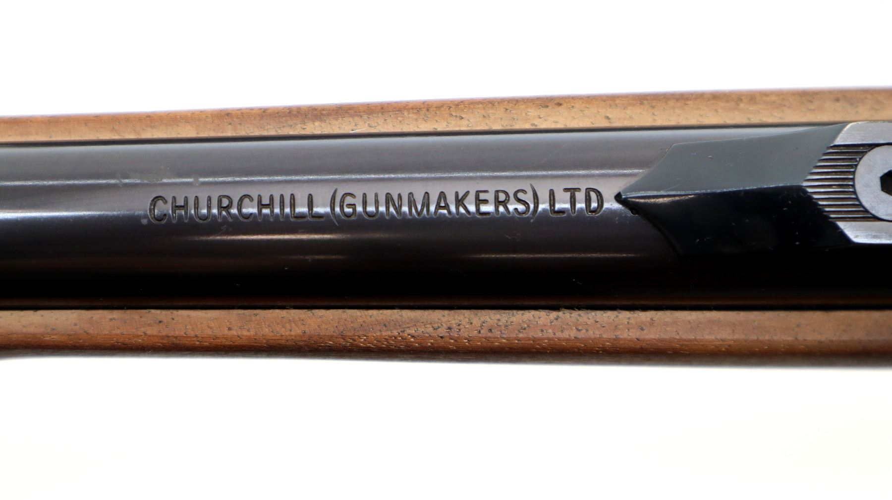 Main Description: Blade front sight with ramp, adjustable folding u notched rear sight, blued finish, barrel marked Churchill Gunmakers LTD, drilled and tapped with Ruger No 1 rib and stainless 1" rings, checkered spur hammer, lever is loose when action is not cocked. Two piece wood stocks, Schnabel forend tip, straight grip, black rubber recoil pad, 14.25" LOP, swivel studs.