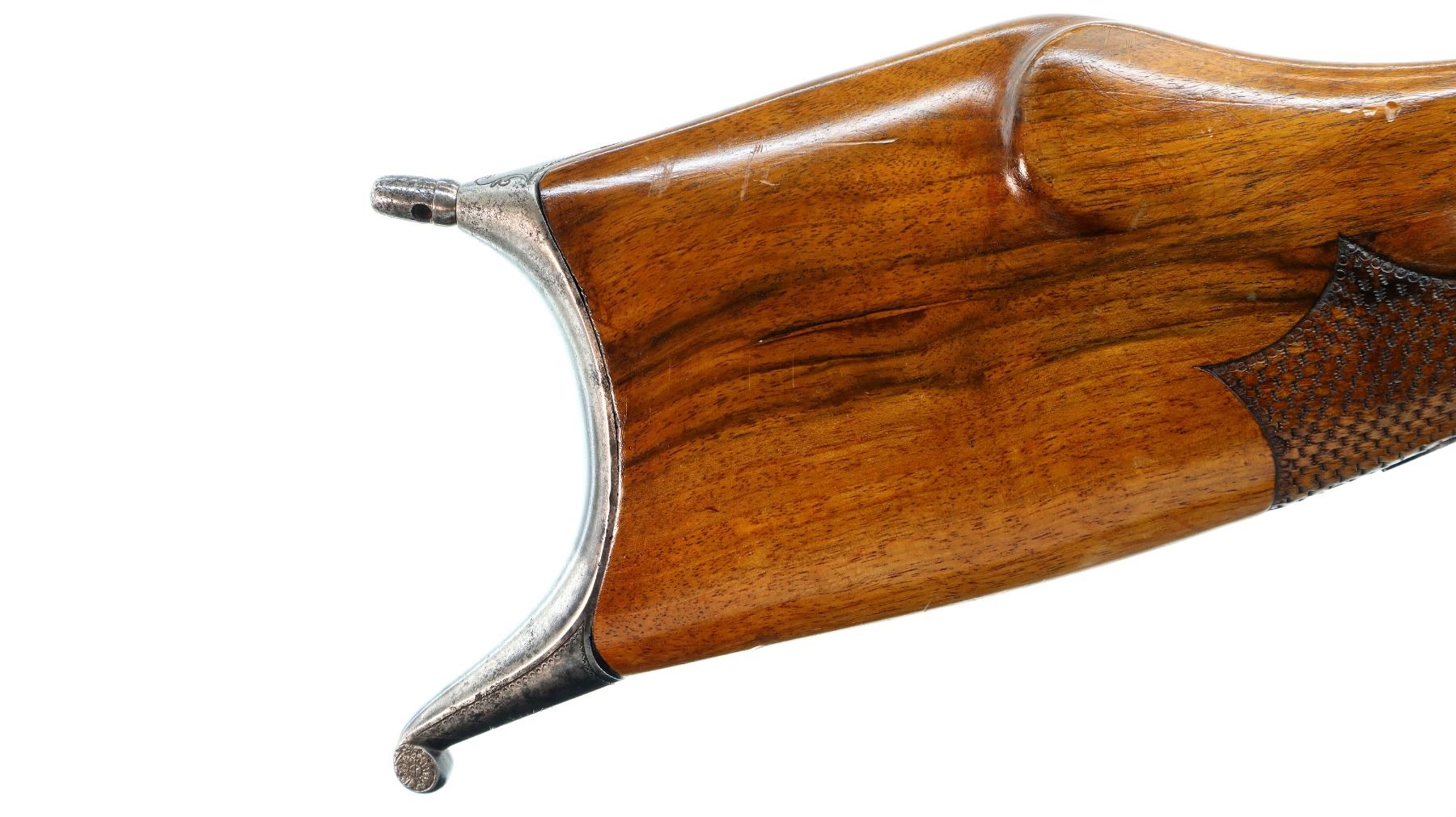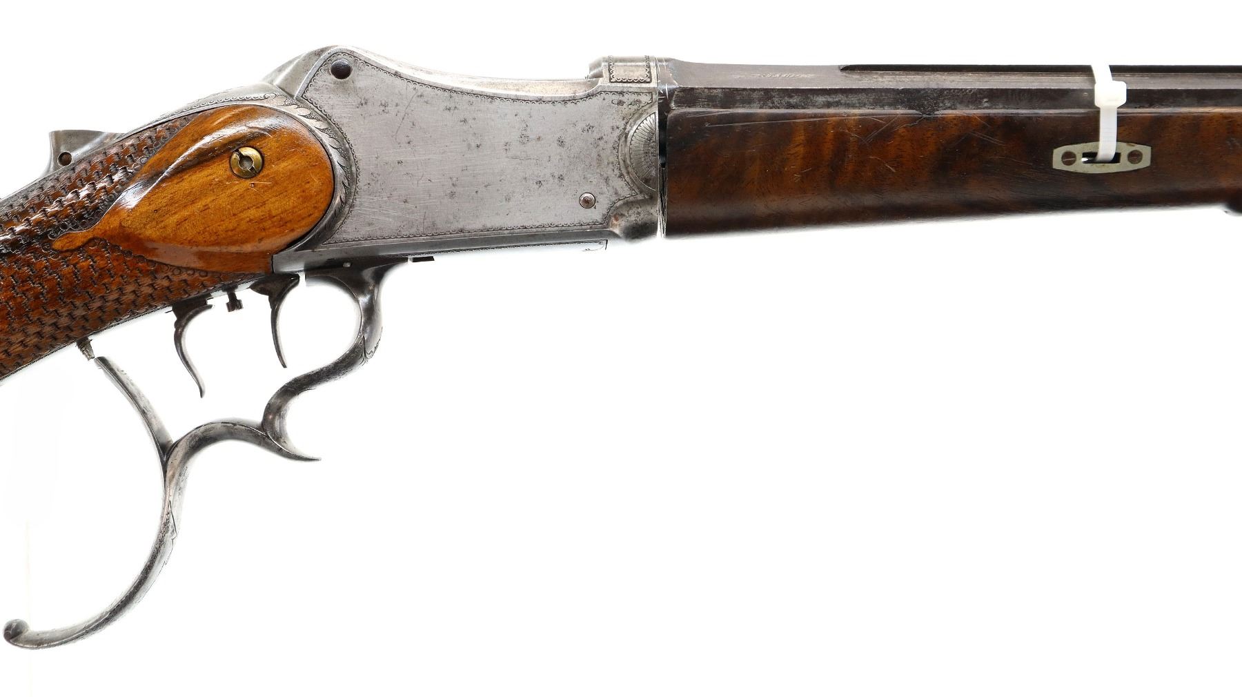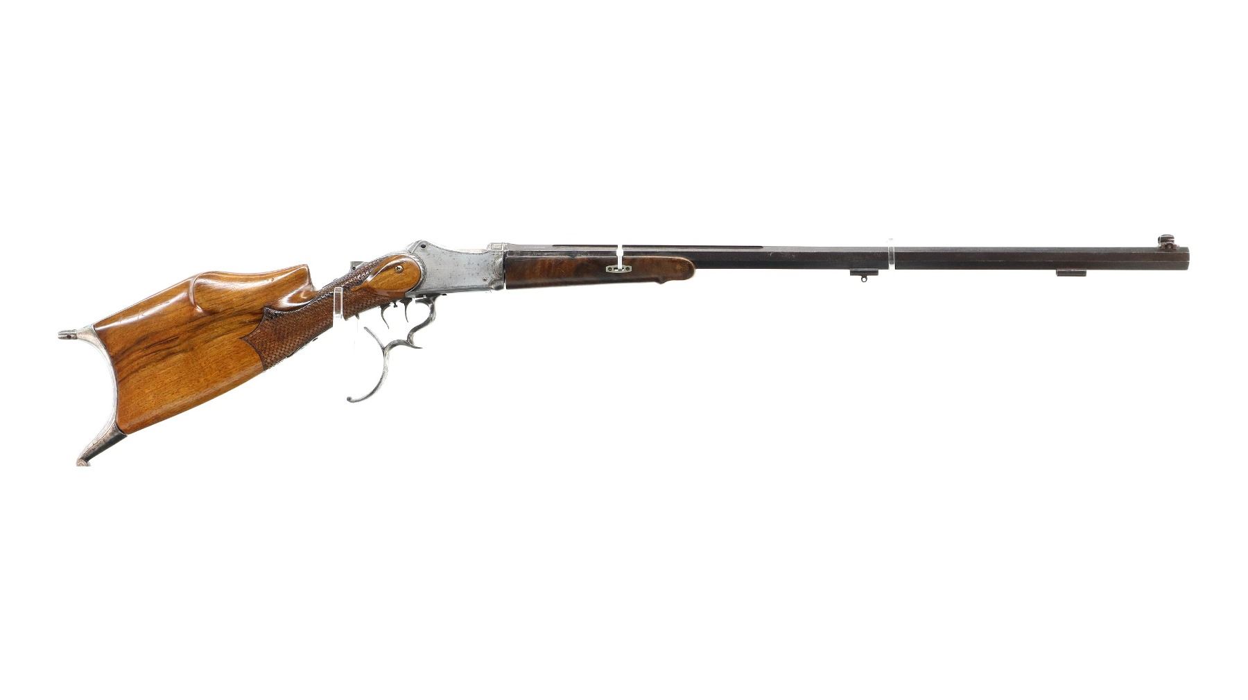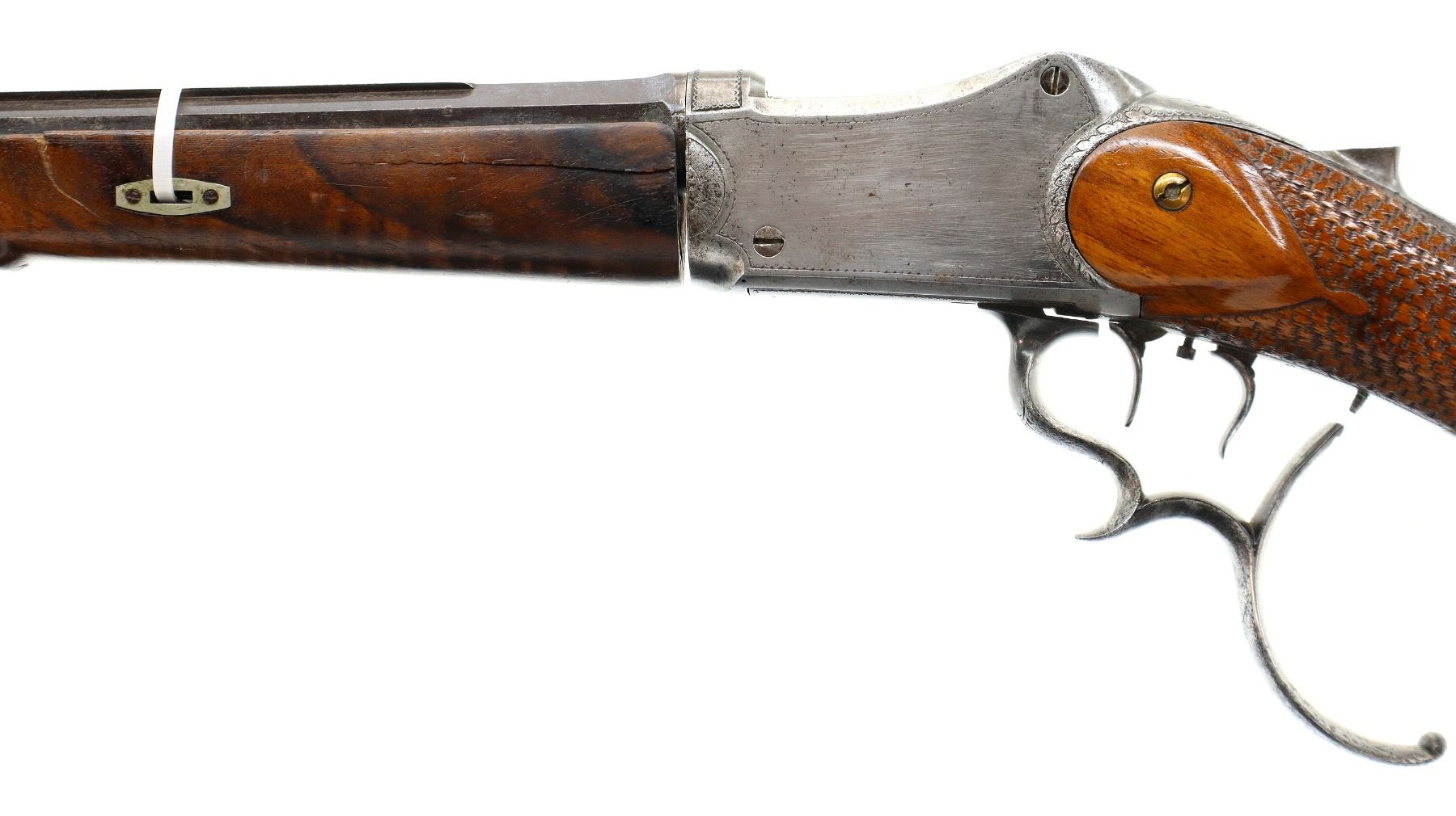 Main Description: Adjustable pin front sight with ears, missing both rear sight and rear tang peep sight, octagon barrel, engraved silver receiver, double set triggers, large finger rest trigger guard. Two piece wood stocks, forearm is chipped, cracked and repaired missing wedge. Basketweave straight grip, large cheek rest, hooked butt plate, 13.25" LOP, Missing lower tang screw and cleaning rod, front swivel stud only.