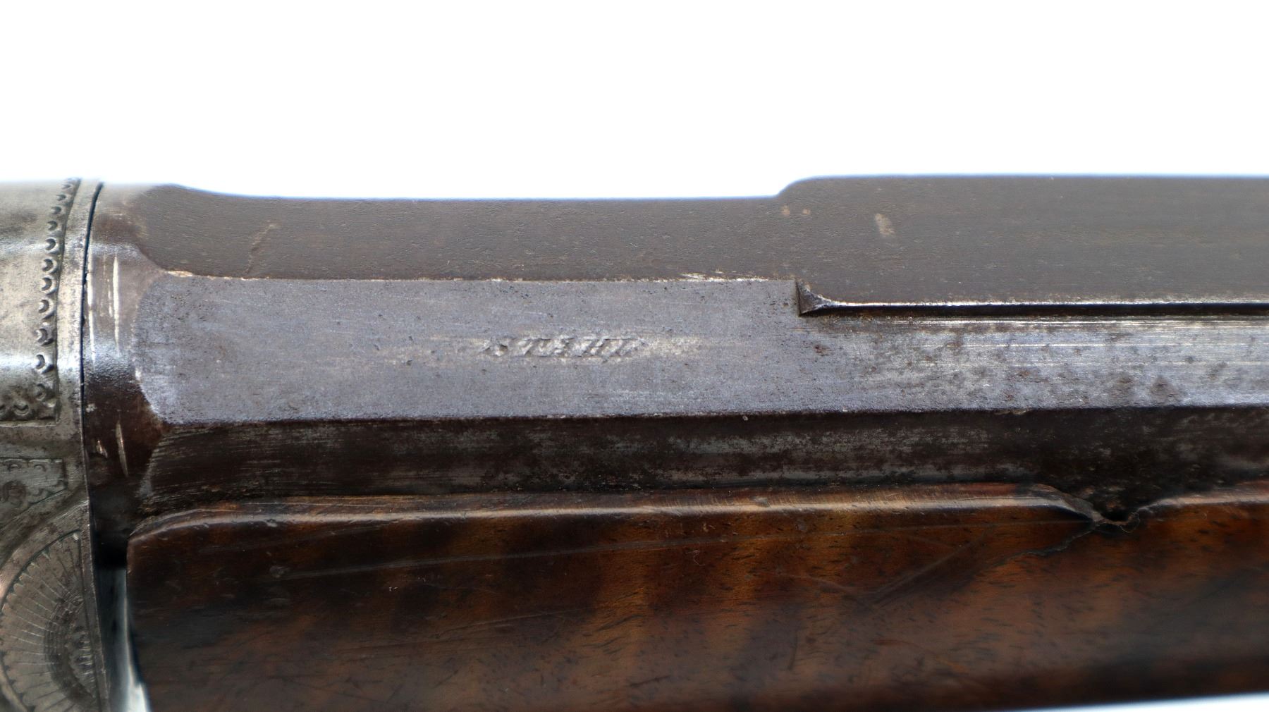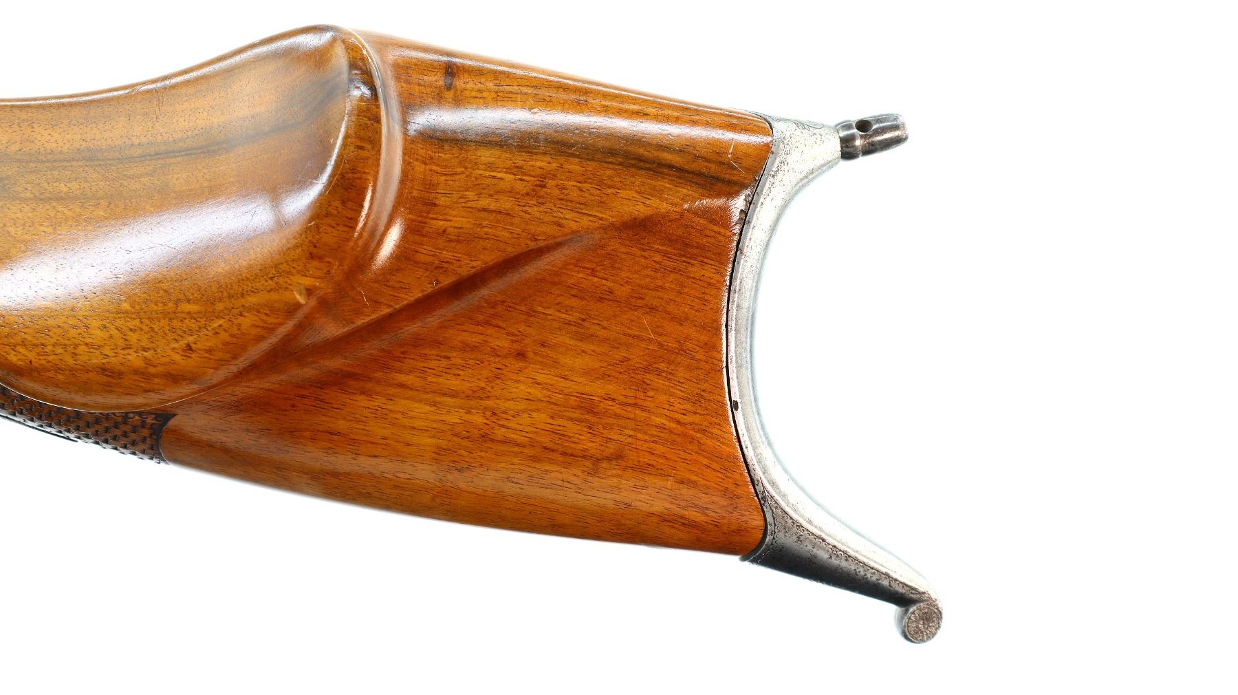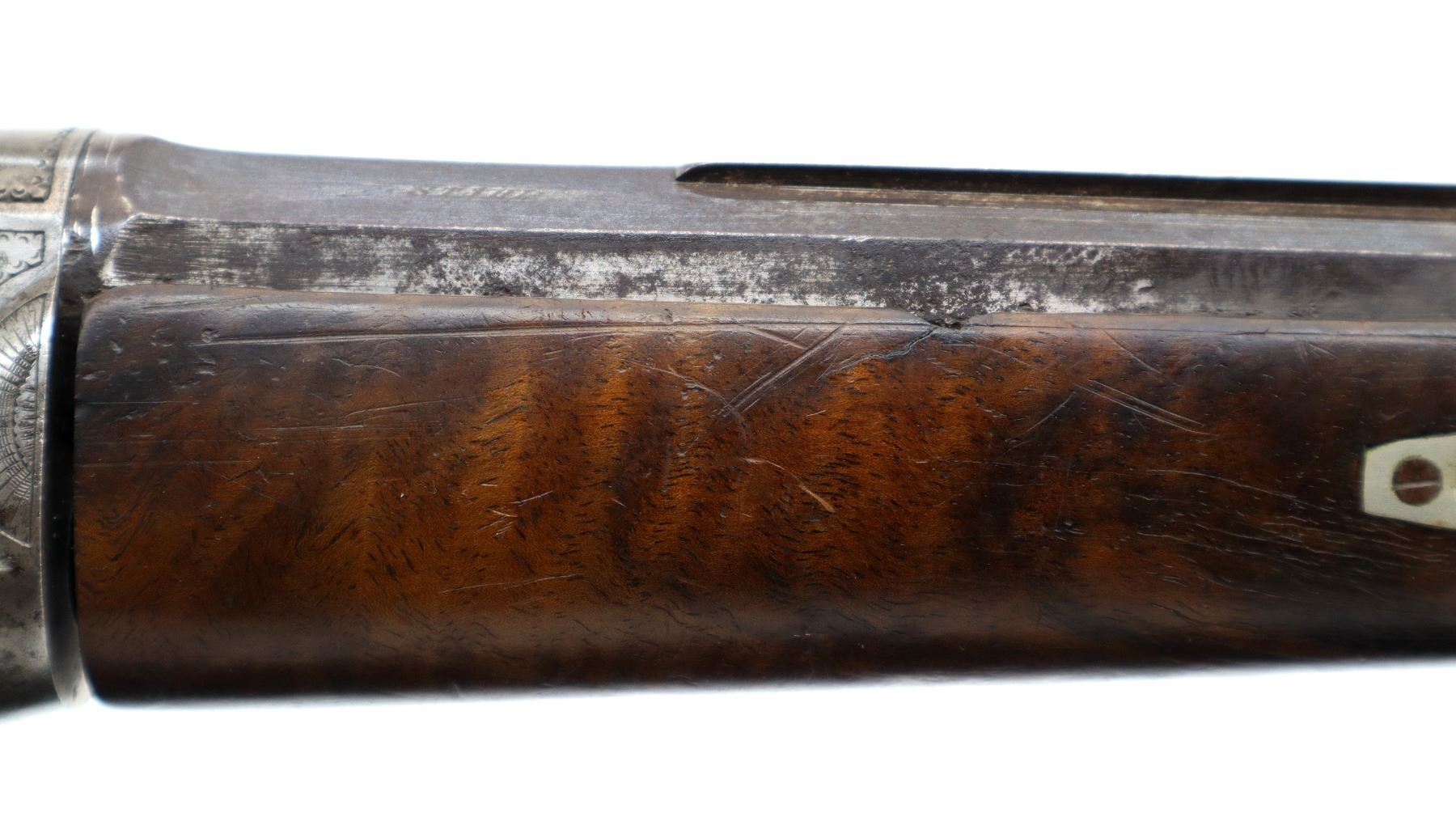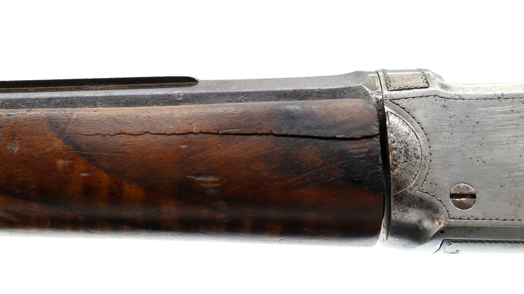Main Description: Adjustable pin front sight with ears, missing both rear sight and rear tang peep sight, octagon barrel, engraved silver receiver, double set triggers, large finger rest trigger guard. Two piece wood stocks, forearm is chipped, cracked and repaired missing wedge. Basketweave straight grip, large cheek rest, hooked butt plate, 13.25" LOP, Missing lower tang screw and cleaning rod, front swivel stud only.
