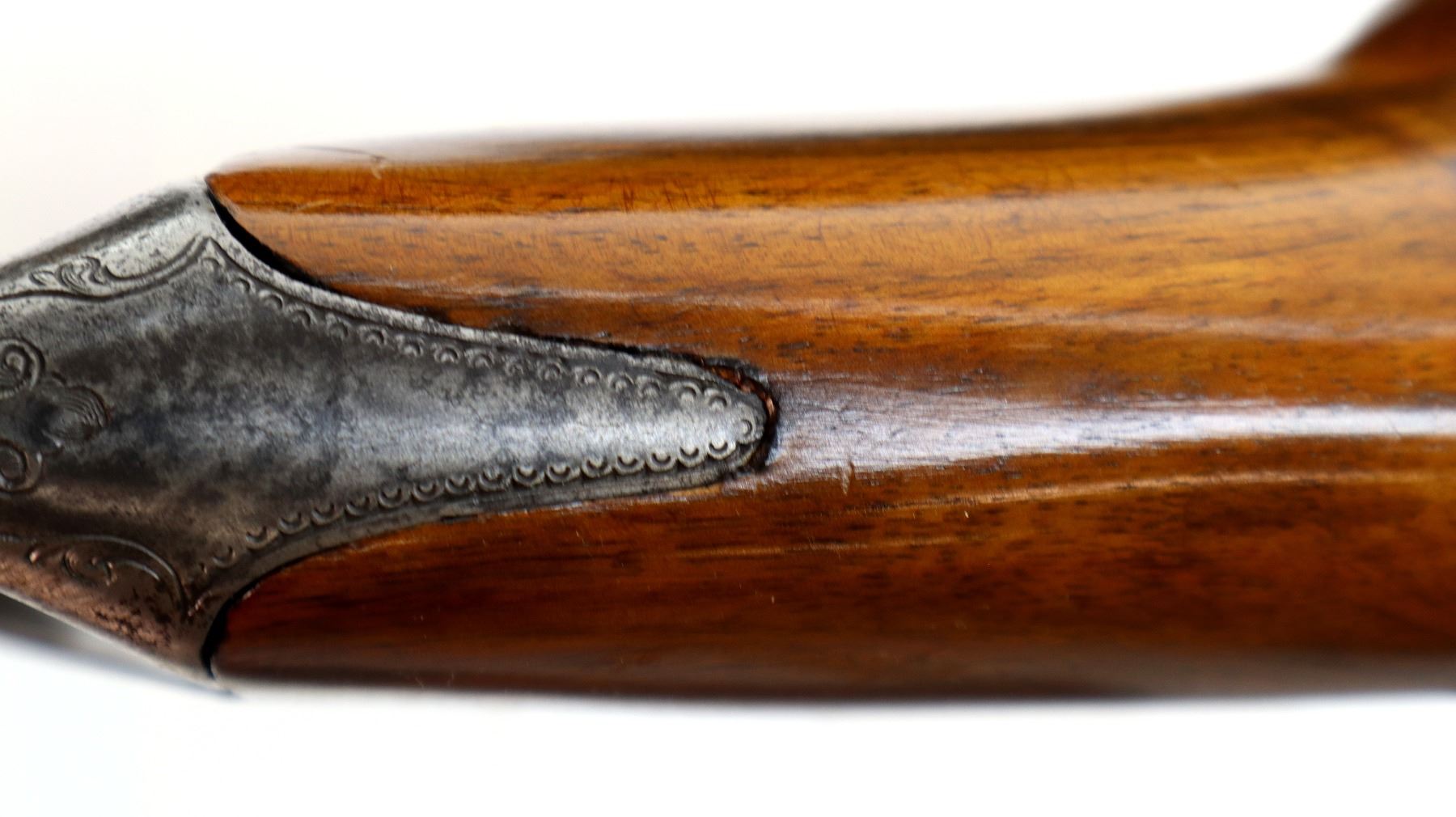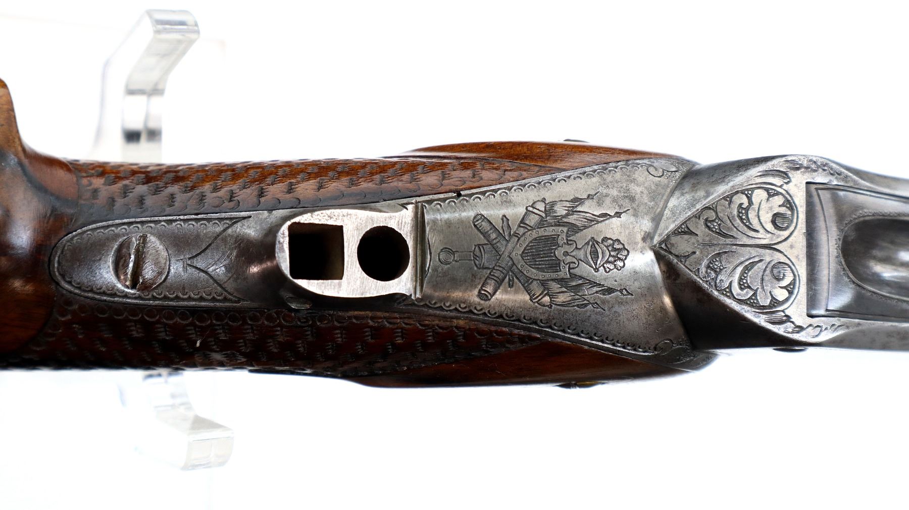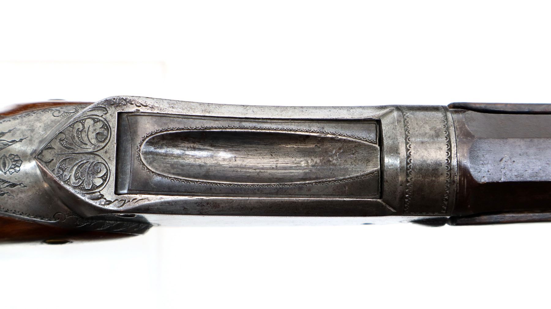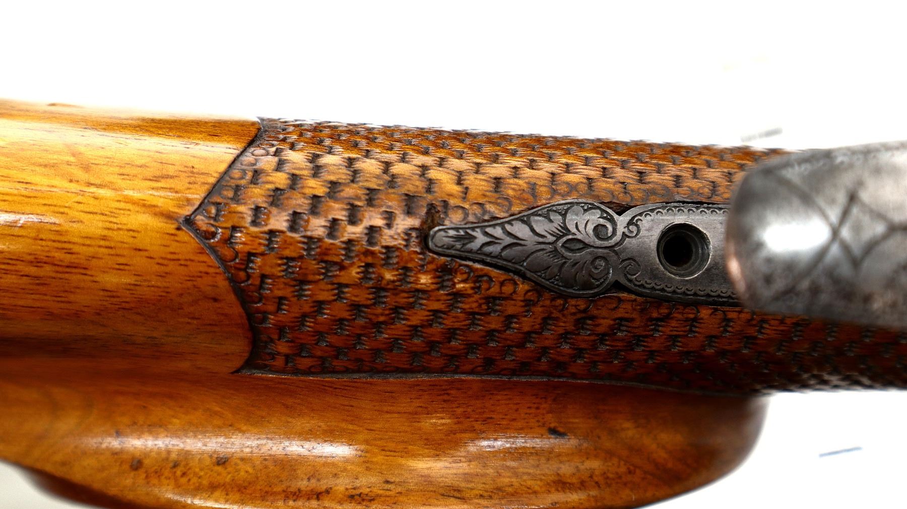 Main Description: Adjustable pin front sight with ears, missing both rear sight and rear tang peep sight, octagon barrel, engraved silver receiver, double set triggers, large finger rest trigger guard. Two piece wood stocks, forearm is chipped, cracked and repaired missing wedge. Basketweave straight grip, large cheek rest, hooked butt plate, 13.25" LOP, Missing lower tang screw and cleaning rod, front swivel stud only.