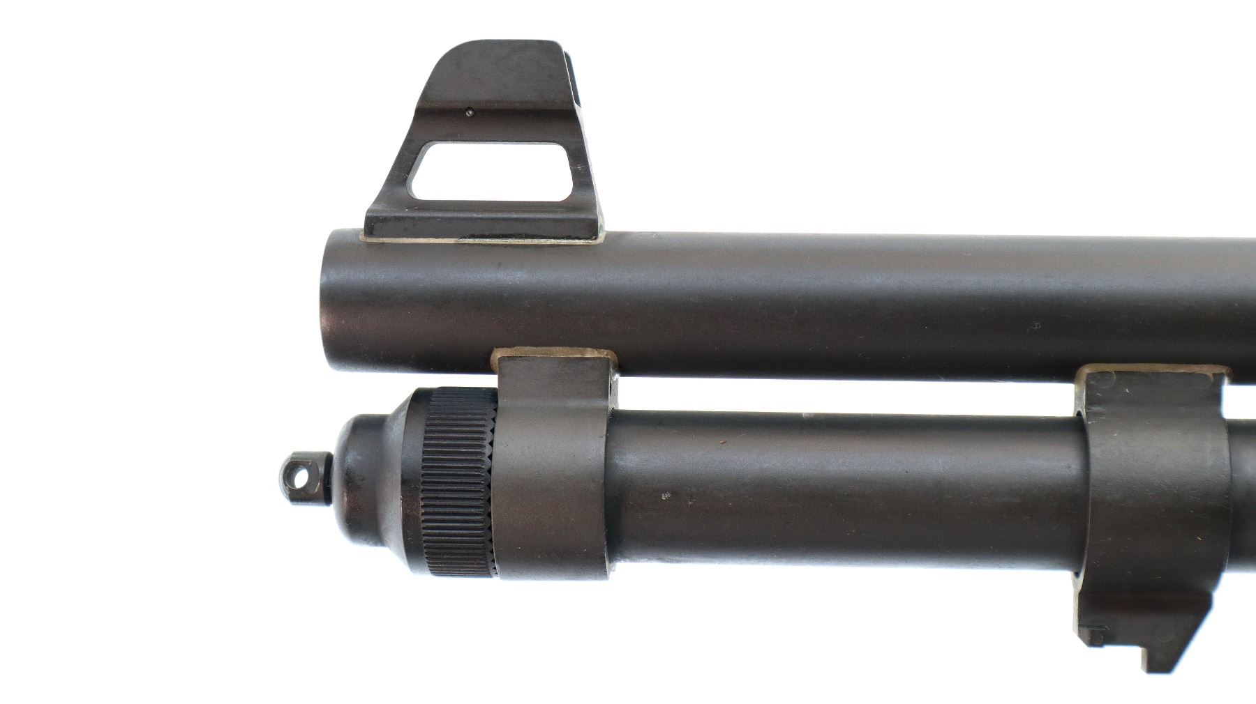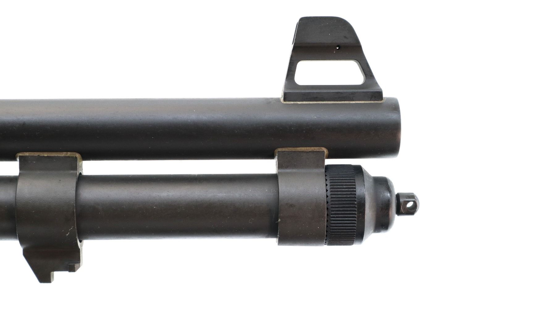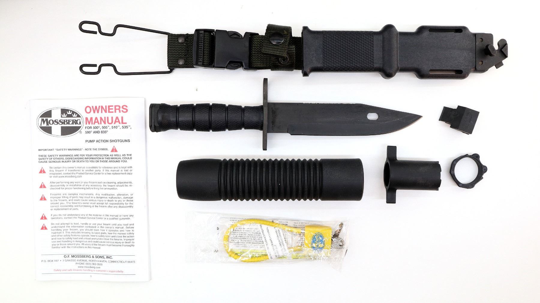 Main Description: Red fiber optic front bead with ears and ramp, adjustable rear peep sight with ears, Parkerized round barrel and full length magtube, black alloy receiver drilled and tapped with one piece rail, tang safety and four round side saddle. Two piece black synthetic stocks, ventilated MagPul forearm, textured pistol grip, black rubber recoil pad, bayonet lug, swivel studs. Accessories include: Original forearm with parts, Lock, Ontario Knife Co M9 bayonet with grooved black polymer grips, scabbard and belt loop.