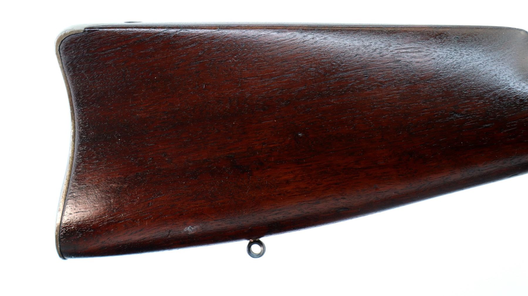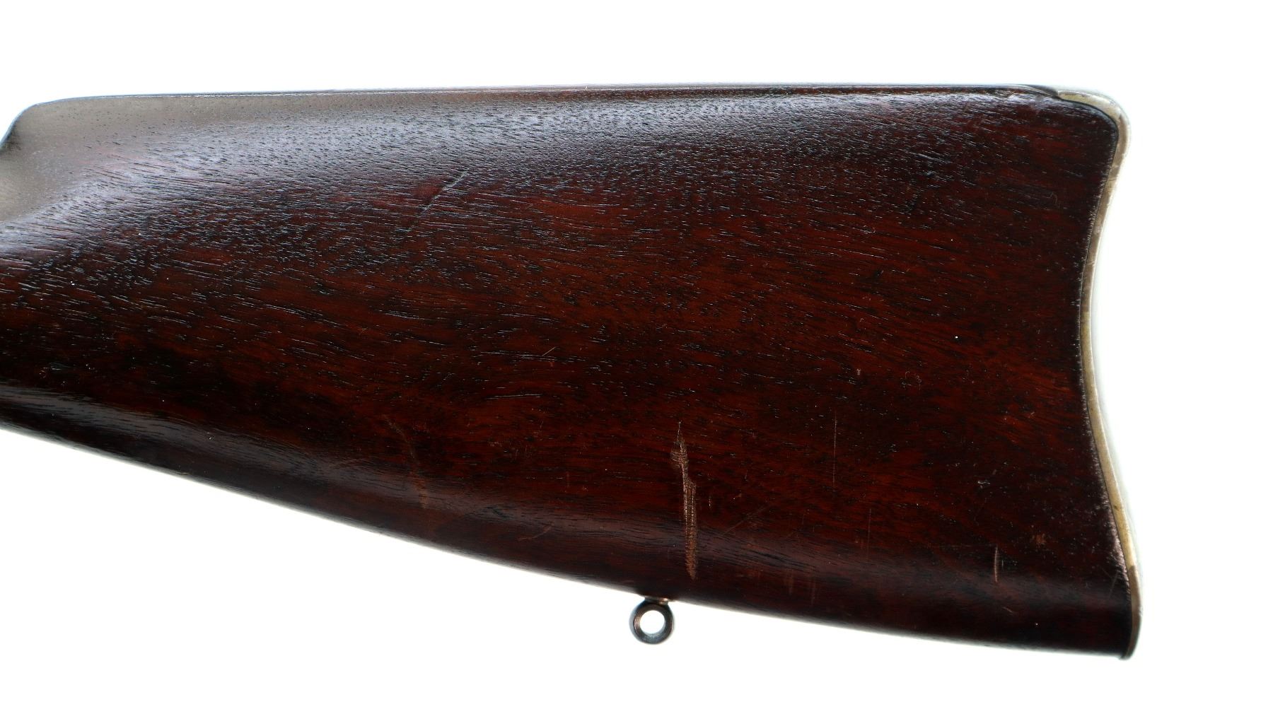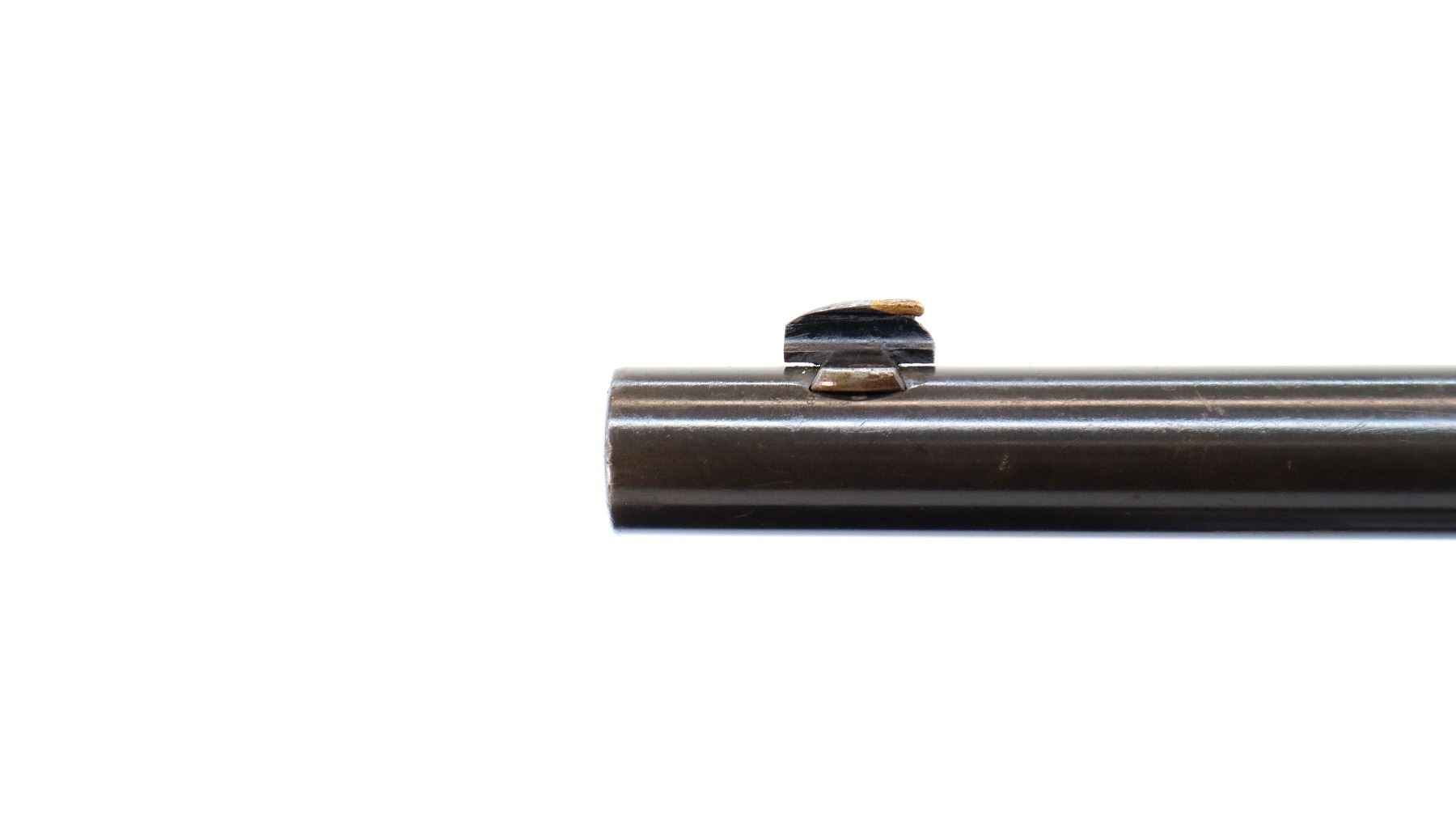 Main Description: Blade front sight, adjustable u notched rear sight, blued finish, cocking indicator, tang drilled and tapped with plug screws installed, saddle ring and stud on left side of receiver. Two piece wood stocks, Schnabel forend tip, straight grip cracked behind receiver, smooth curved steel butt plate, stock chipped at heel, swivel studs.