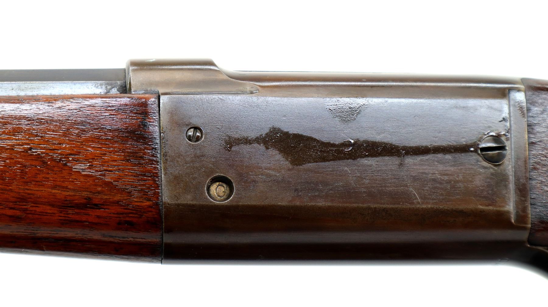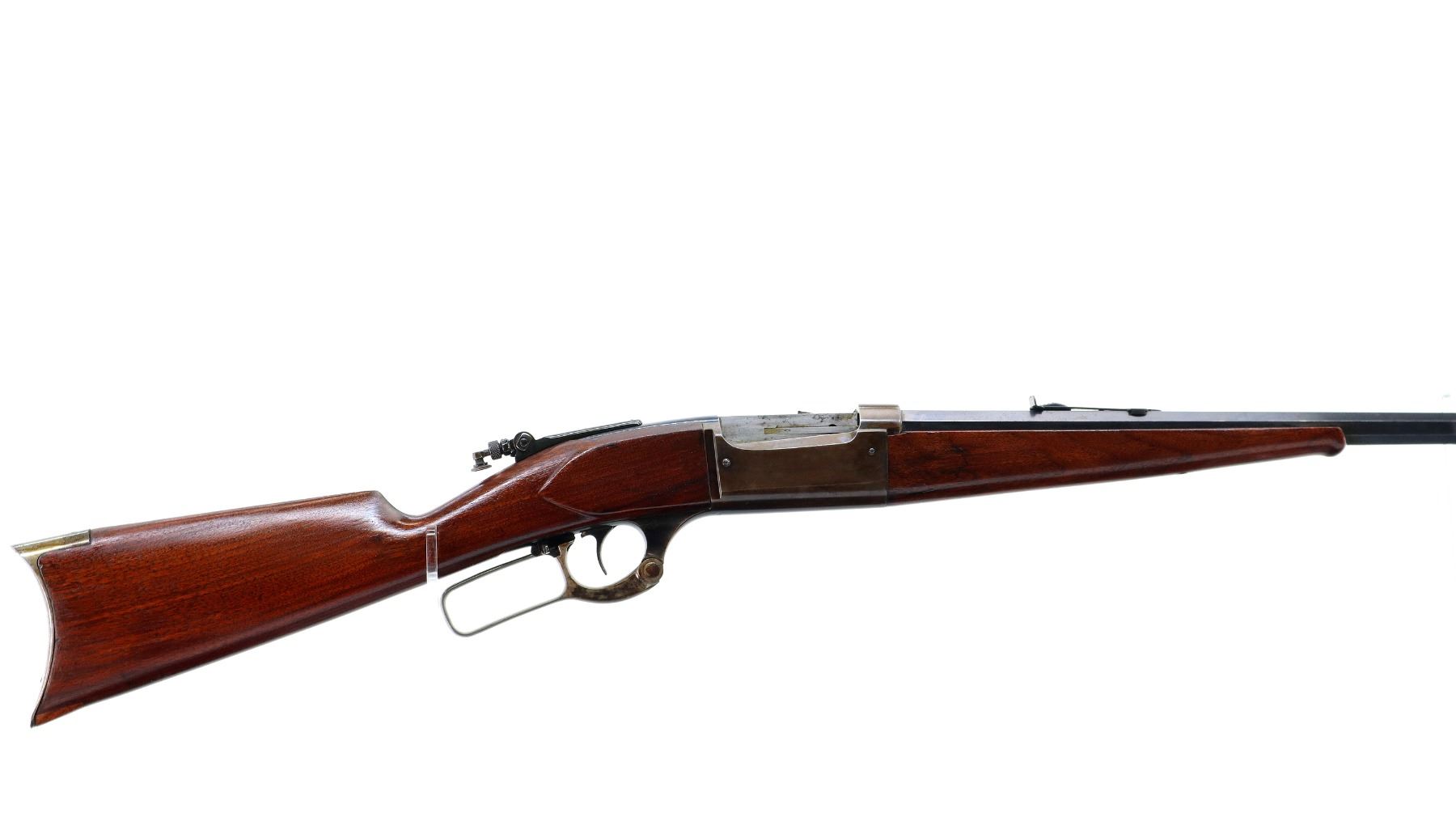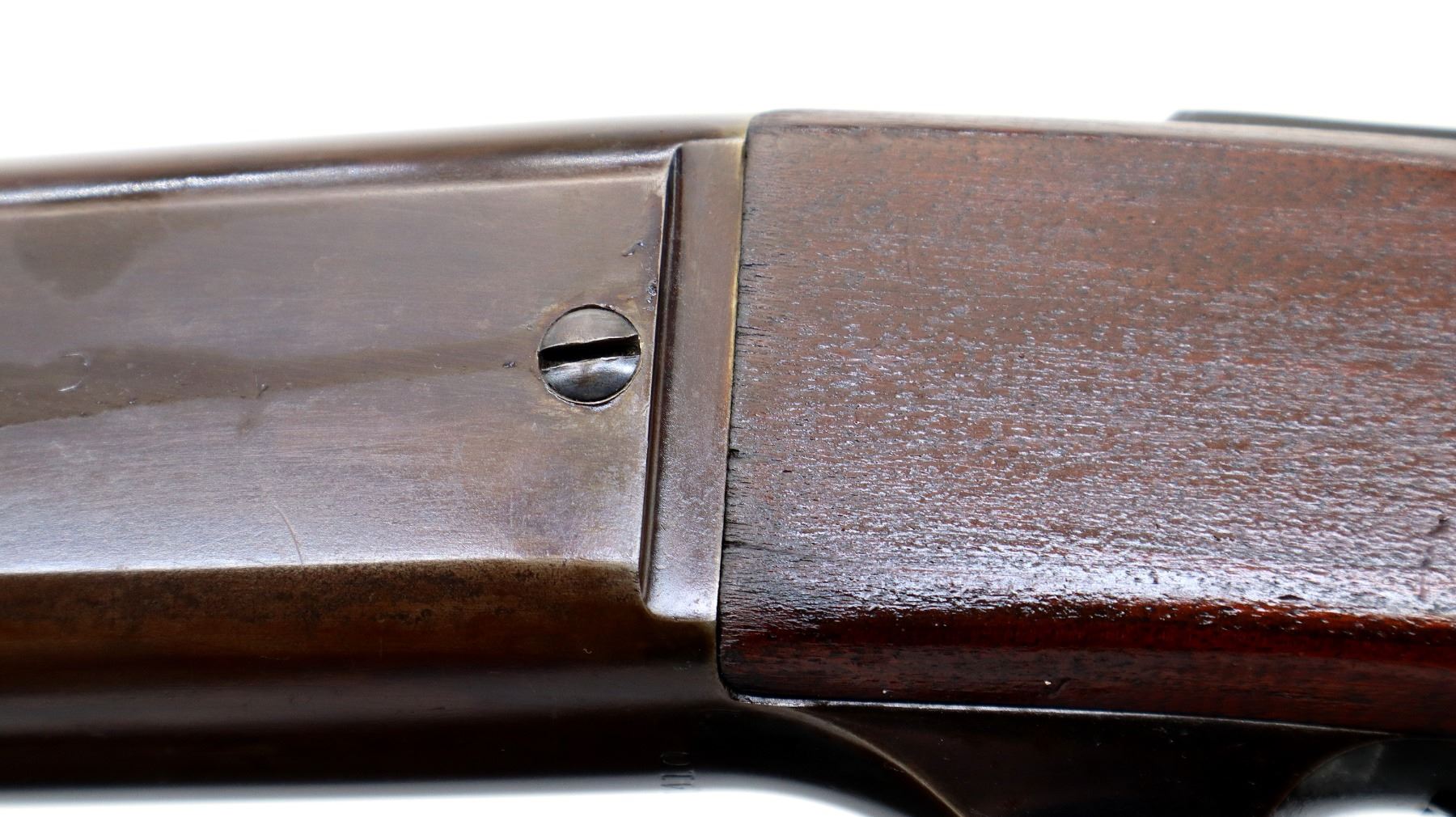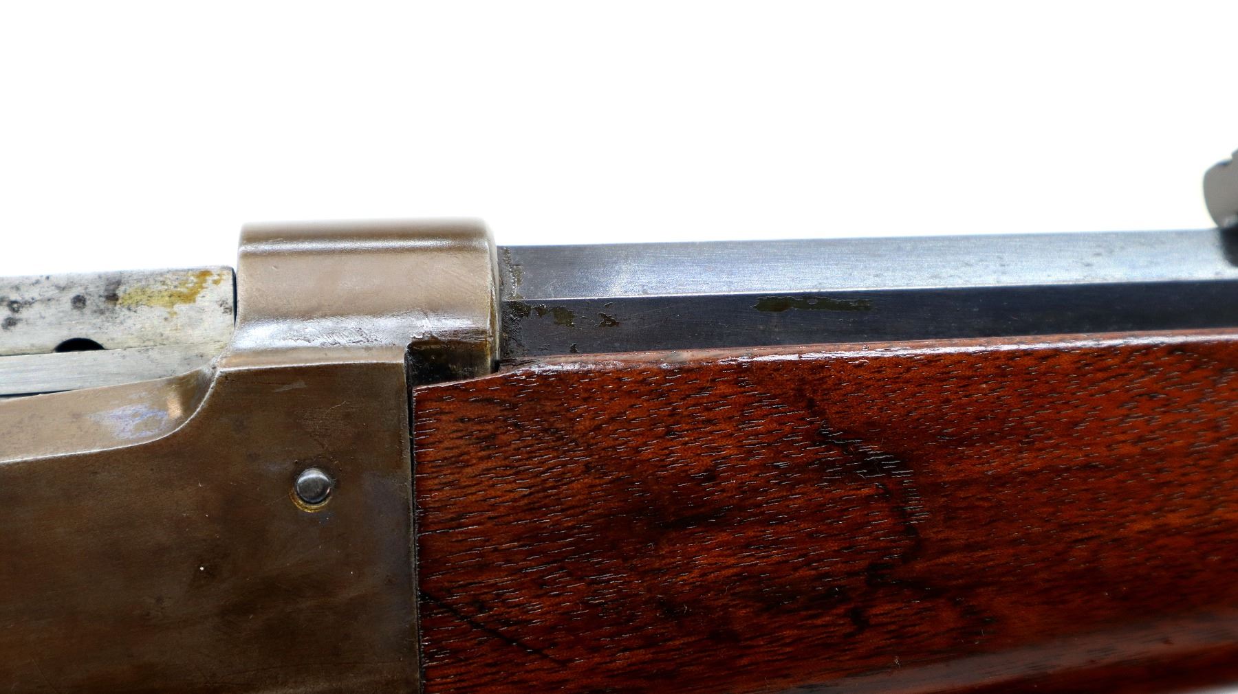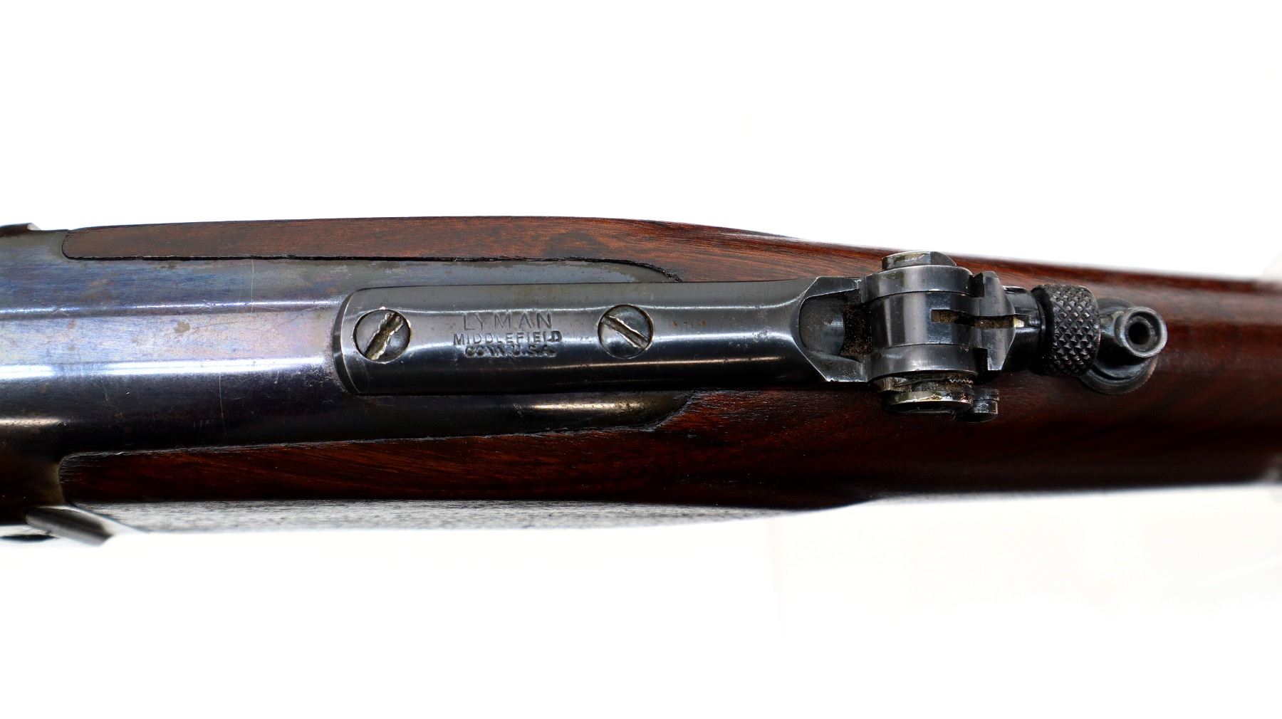 Main Description: Folding blade front sight with hood and pin on second side, adjustable u notched rear sight, blued finish, tapered octagon barrel, square cocking indicator, tang drilled and tapped with vintage adjustable Lyman peep sight installed. Two piece wood stocks, Schnabel forend tip, straight grip, stock cracked behind upper tang, smooth curved steel butt plate, stock repaired at toe, colour case hardened lever.