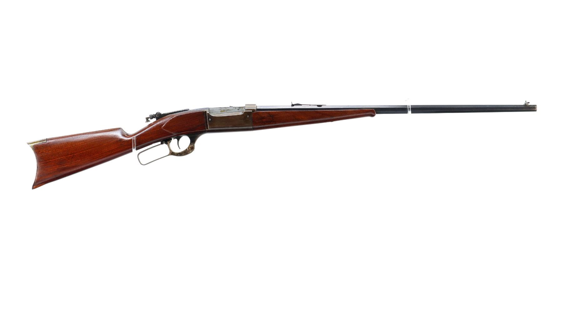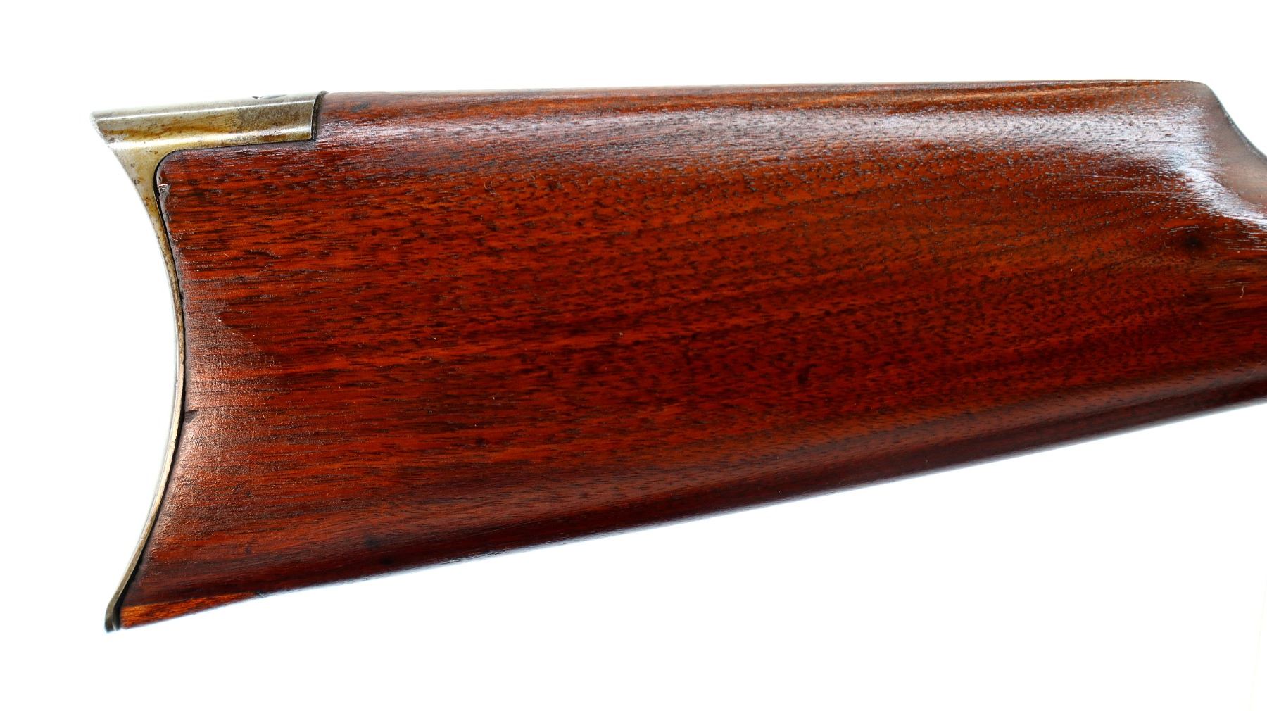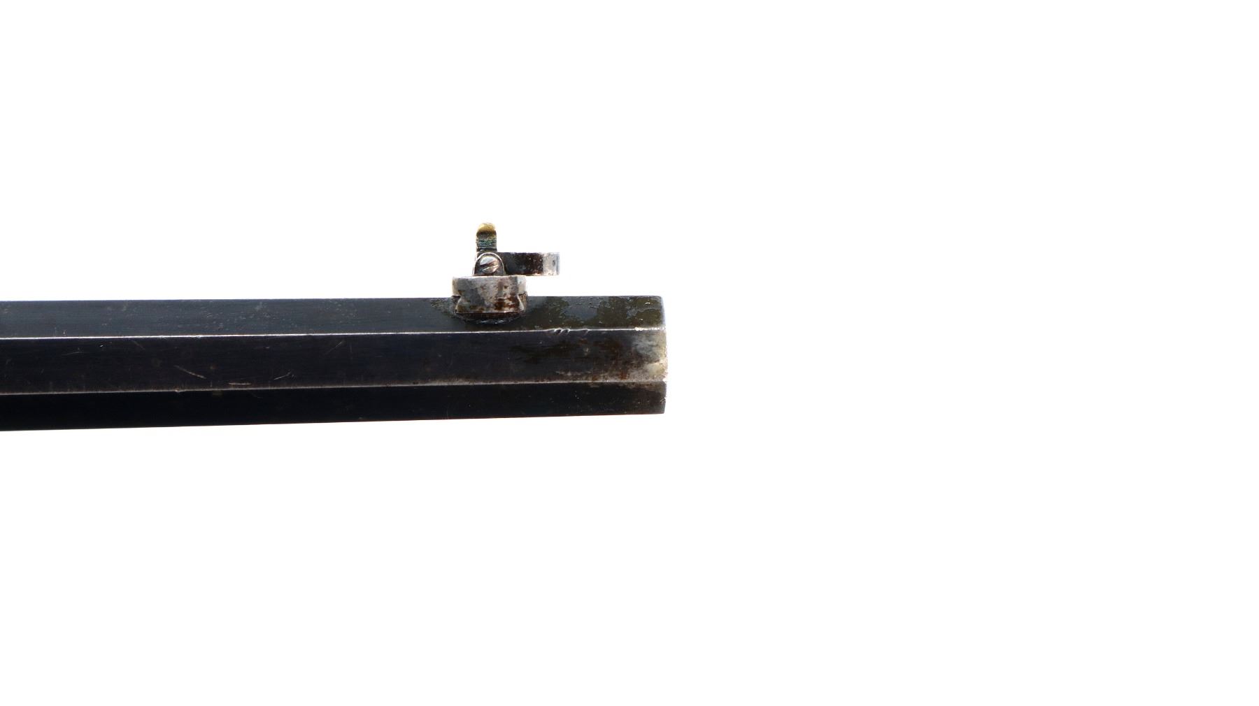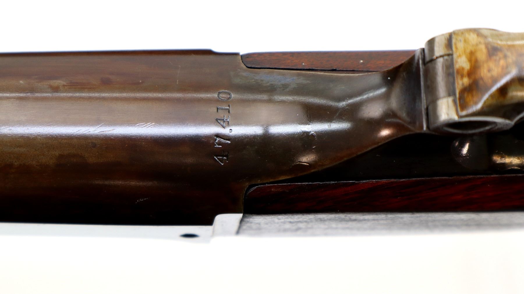 Main Description: Folding blade front sight with hood and pin on second side, adjustable u notched rear sight, blued finish, tapered octagon barrel, square cocking indicator, tang drilled and tapped with vintage adjustable Lyman peep sight installed. Two piece wood stocks, Schnabel forend tip, straight grip, stock cracked behind upper tang, smooth curved steel butt plate, stock repaired at toe, colour case hardened lever.