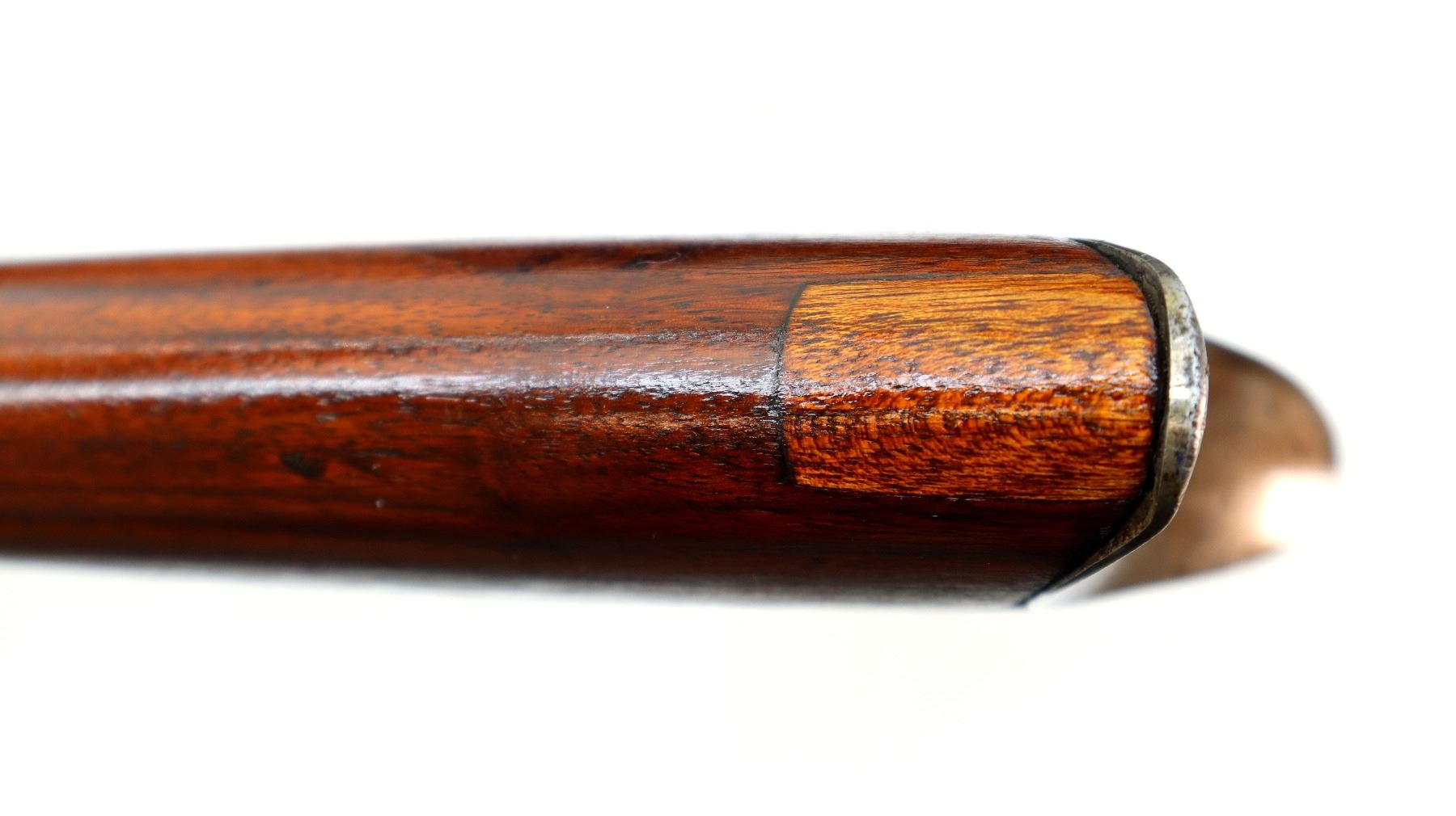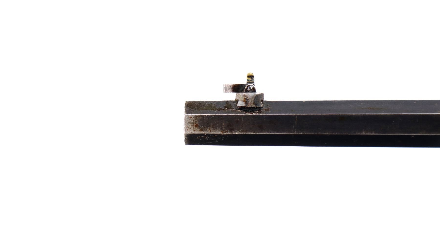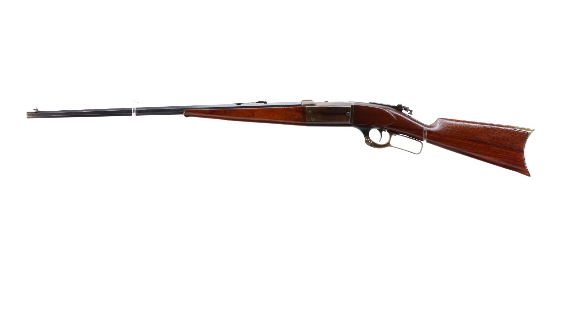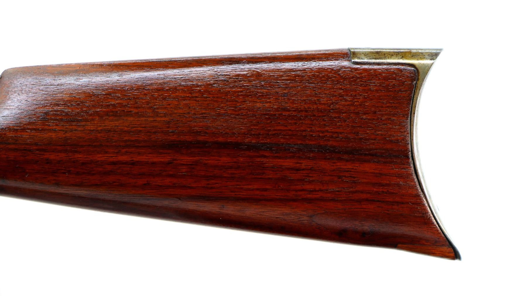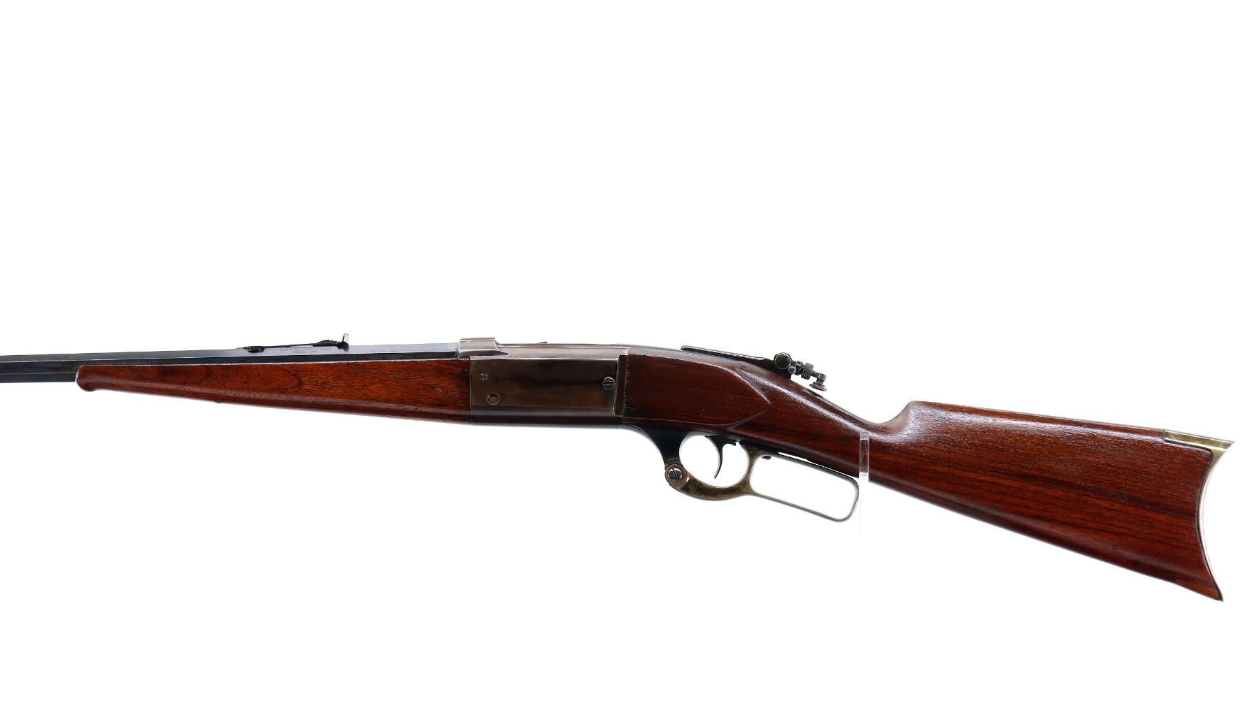 Main Description: Folding blade front sight with hood and pin on second side, adjustable u notched rear sight, blued finish, tapered octagon barrel, square cocking indicator, tang drilled and tapped with vintage adjustable Lyman peep sight installed. Two piece wood stocks, Schnabel forend tip, straight grip, stock cracked behind upper tang, smooth curved steel butt plate, stock repaired at toe, colour case hardened lever.