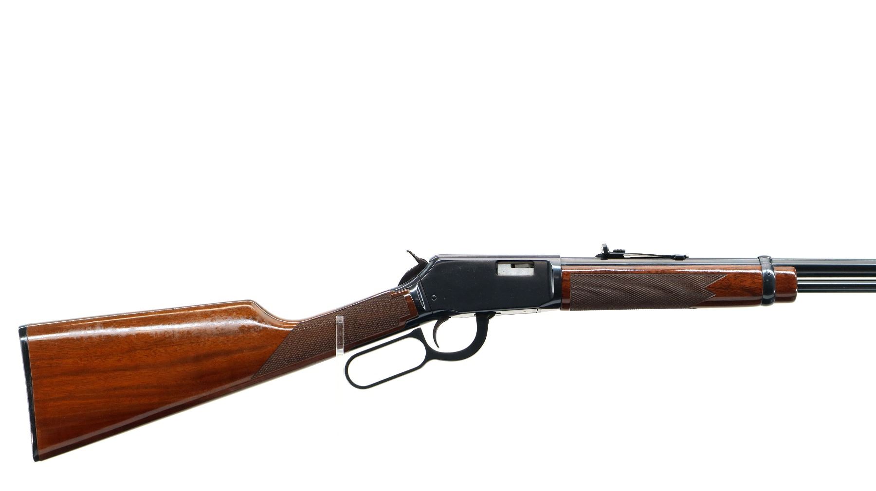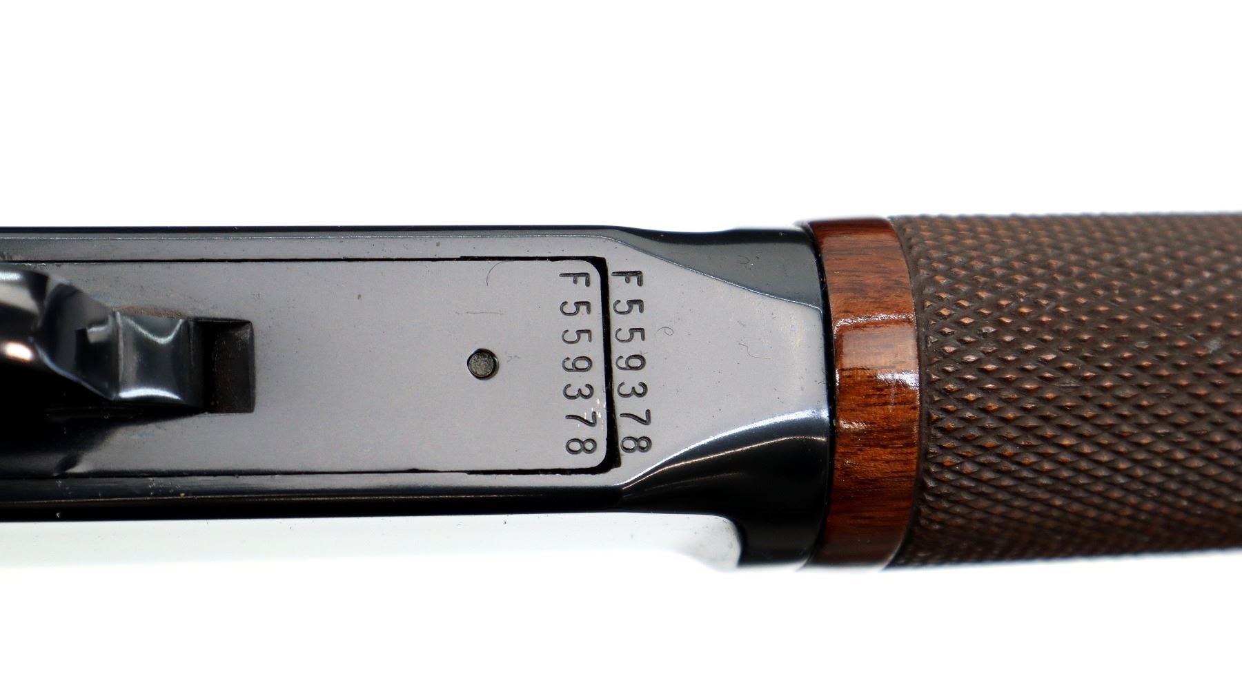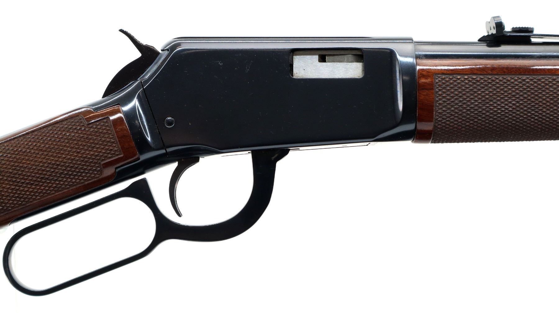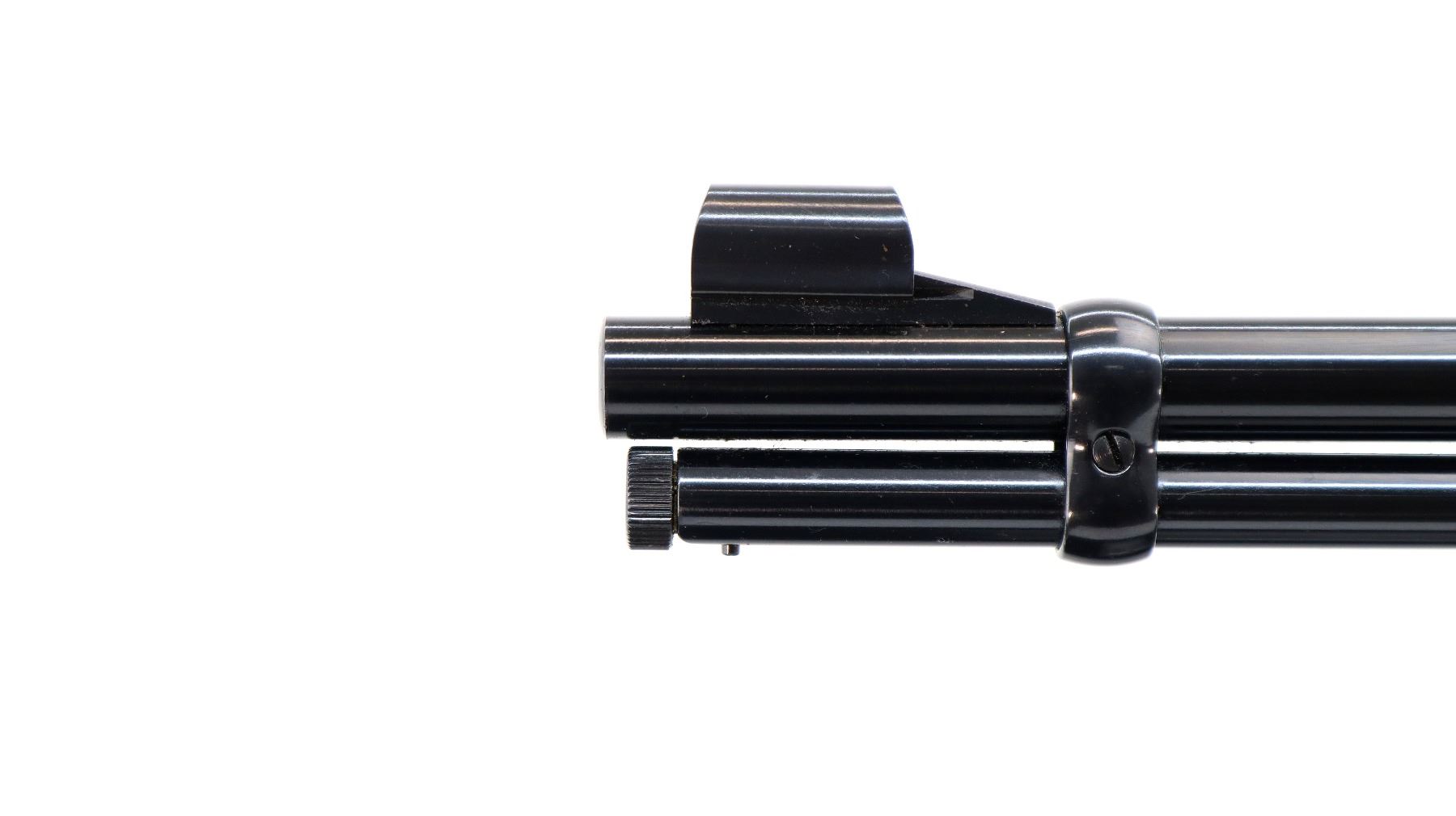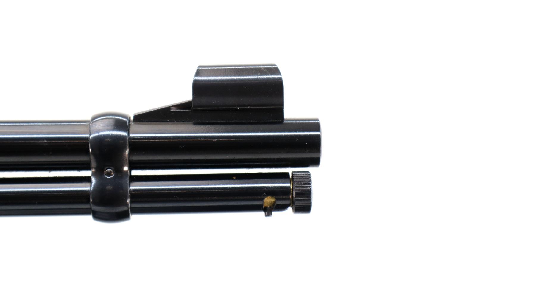 Main Description: Blade front sight with hood and ramp, adjustable u notched rear sight, polish blued finish, grooved receiver and spur hammer. Two piece wood stocks, checkered forearm, straight grip and black polymer butt plate. Full length magtube.