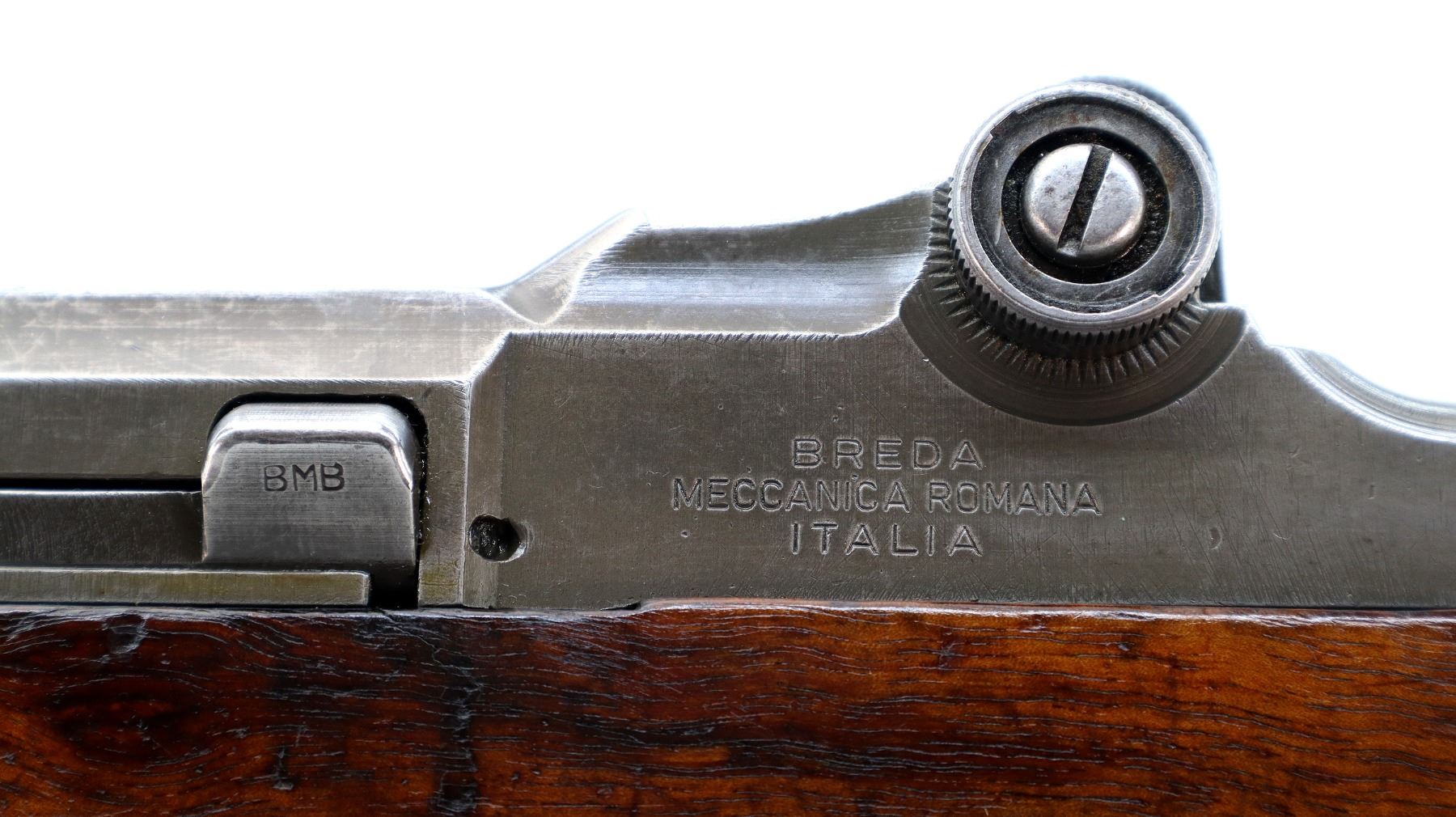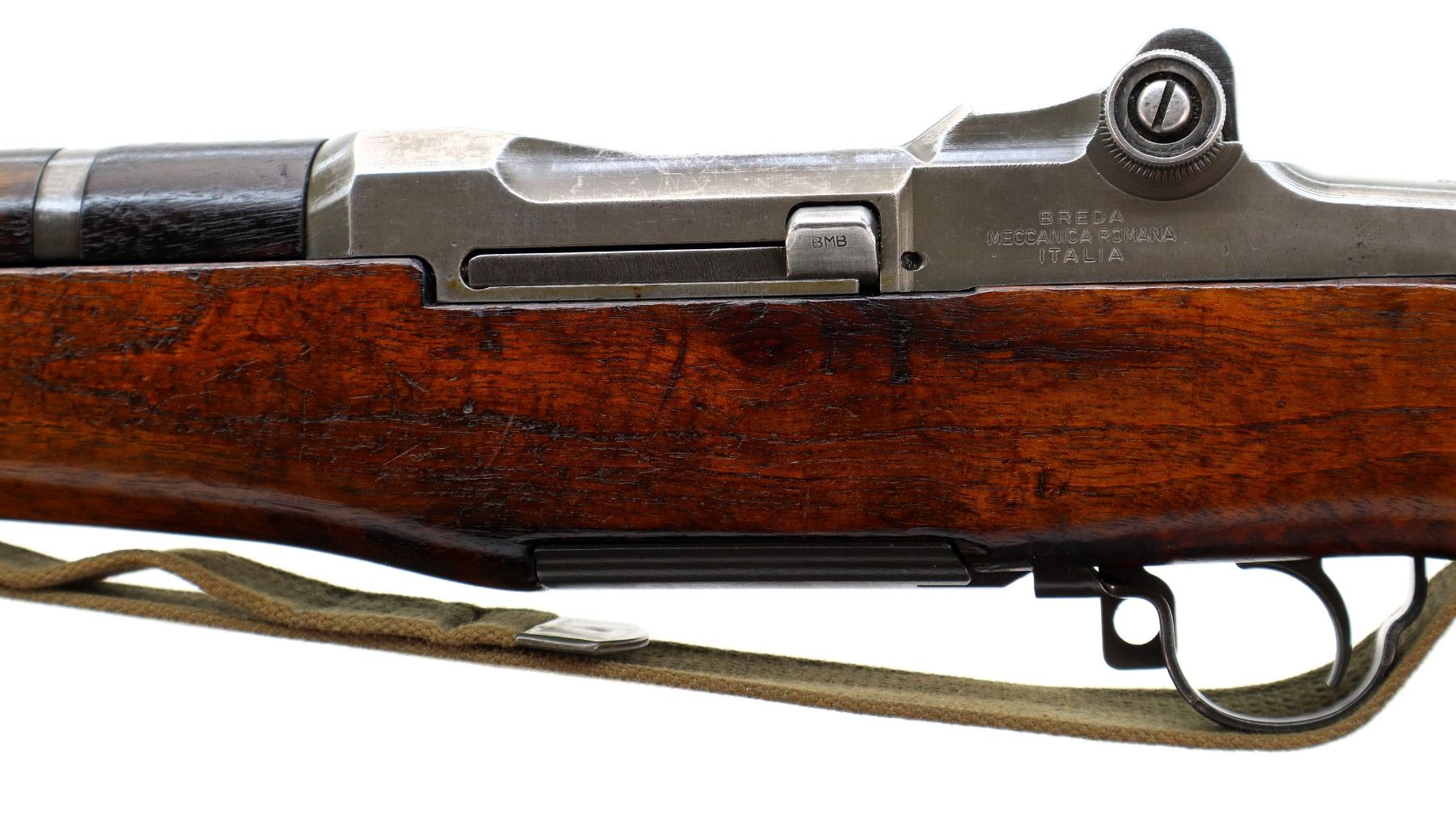 Main Description: Receiver manufactured by Breda Italy, parts have various markings. Blade front sight with ears and ramp, adjustable rear peep sight, parkerized metal finish, barrel marked BSID.71, 11955. Three piece full military wood stocks, pistol grip, checkered steel butt plate with trap, stamped trigger guard, sling swivels with canvas military sling, stacking swivel, bayonet lug.