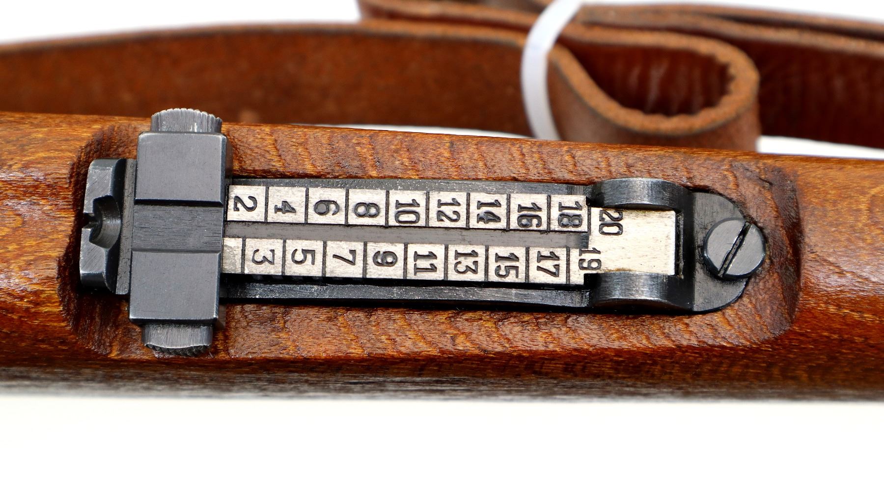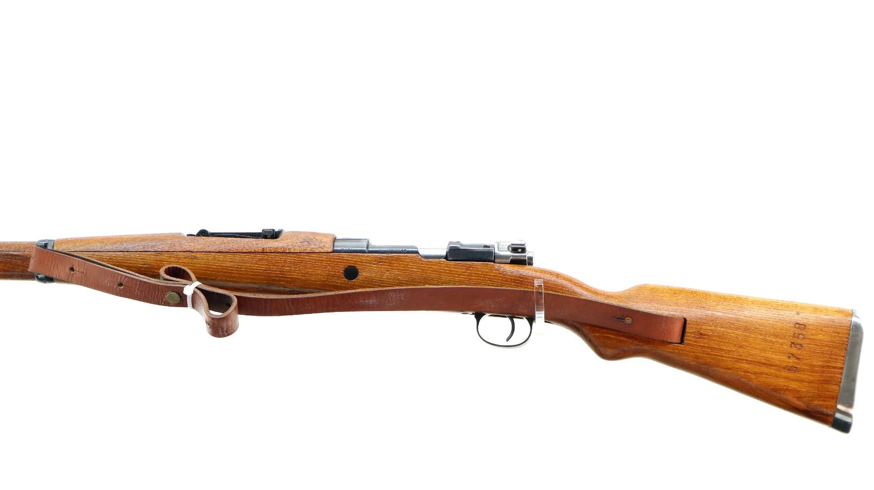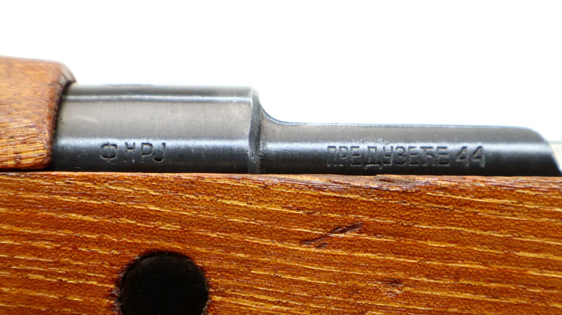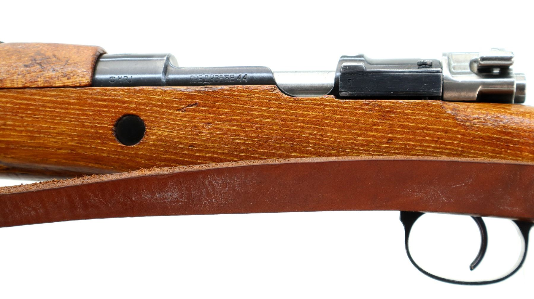 Main Description: Manufactured by Prejudice 44, visible numbers match. Barley corn front sight with hood and ramp, adjustable u notched rear sight, blued finish, receiver ring has Yugoslav crest, silver bolt with turned down handle. Two piece full military wood stocks, pistol grip, smooth cupped steel butt plate, rear slot front swivel with brown leather military sling. Cleaning rod and bayonet lug.
