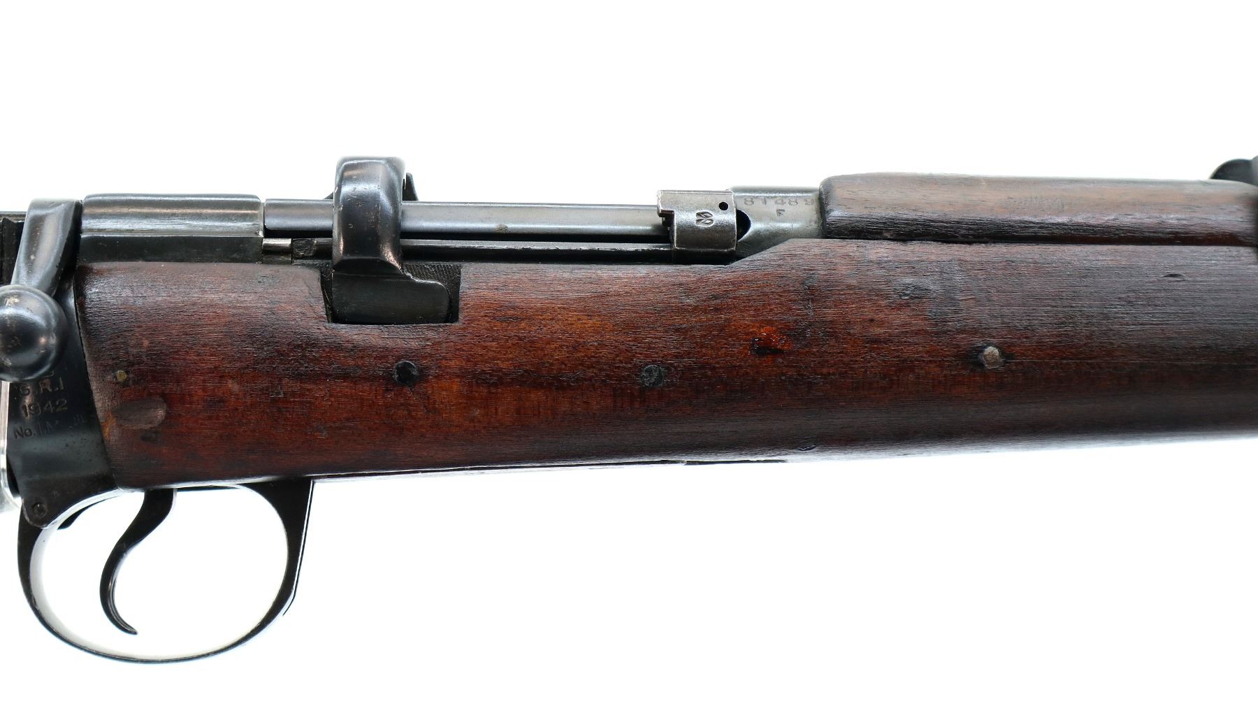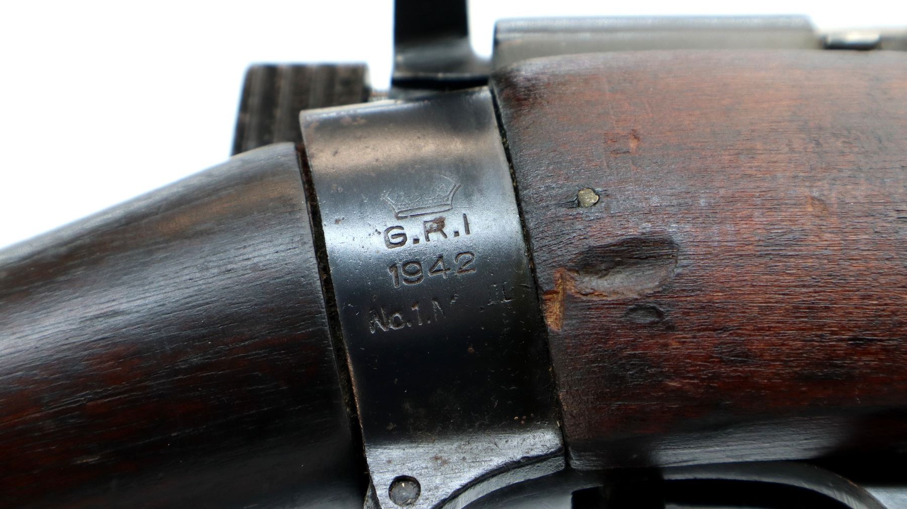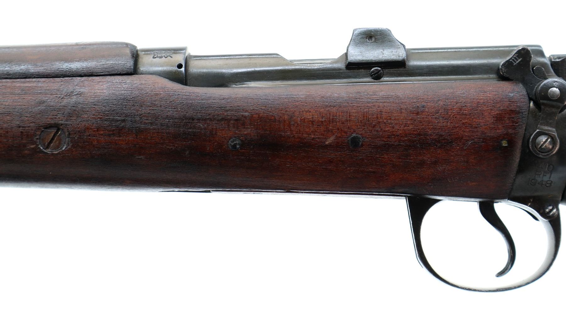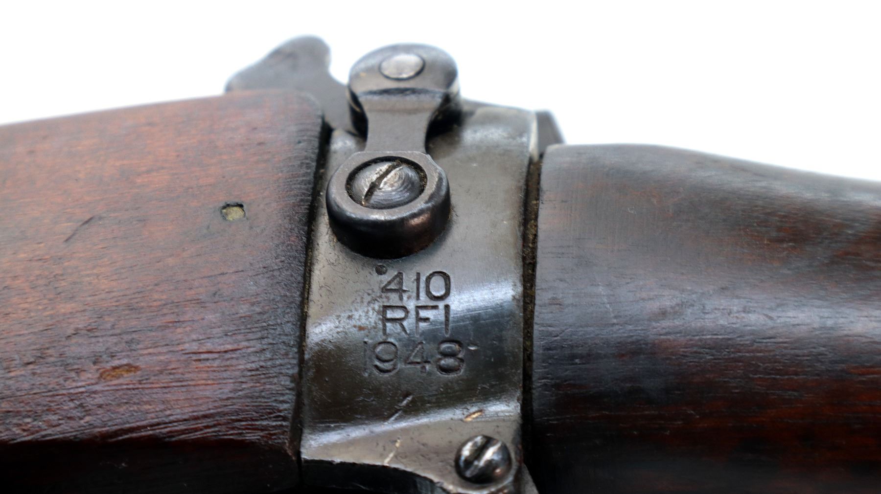 Main Description: Manufactured by GRI 1942, visible serial numbers match, converted by RFI to 410 1948. Blade front sight with ears and ramp, adjustable u notched rear sight with ears, blued finish. Four piece full military wood stocks, front handguard is chipped and cracked, forearm has Ishapore screw, pistol grip, smooth brass butt plate with trap, wood stock disk, arsenal repairs at heel and toe, sling and stacking swivels, bayonet lug.