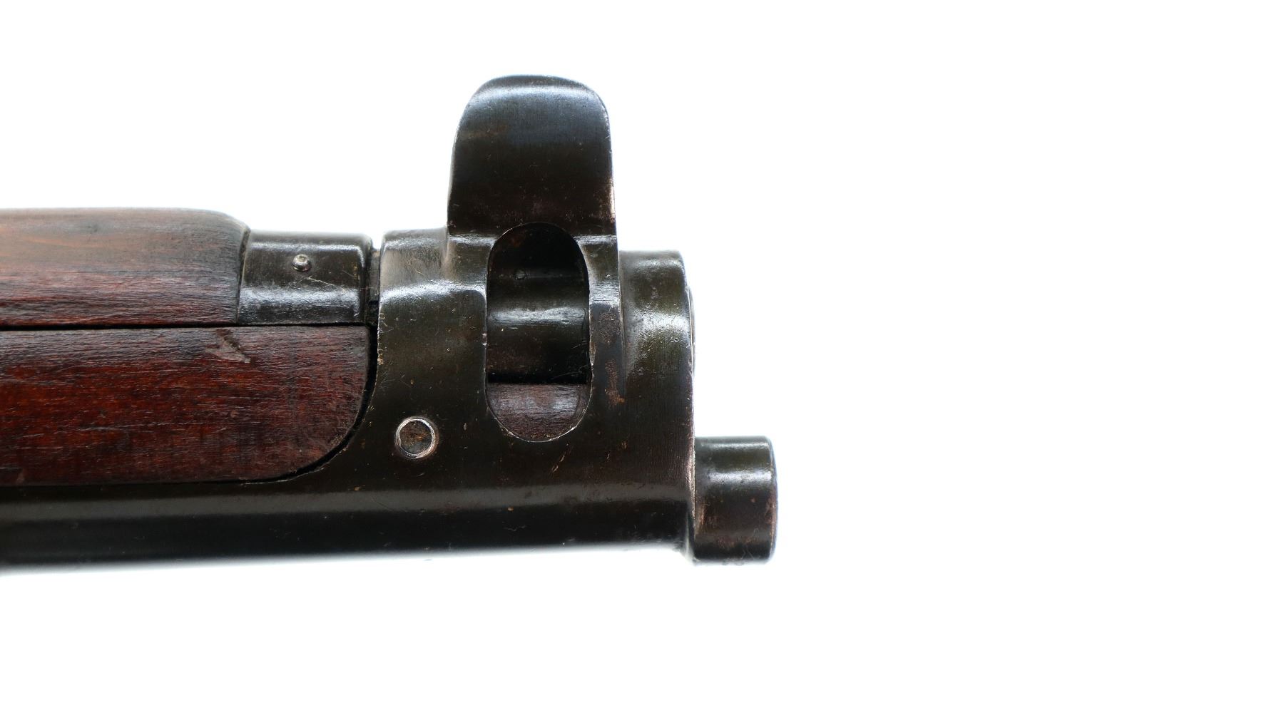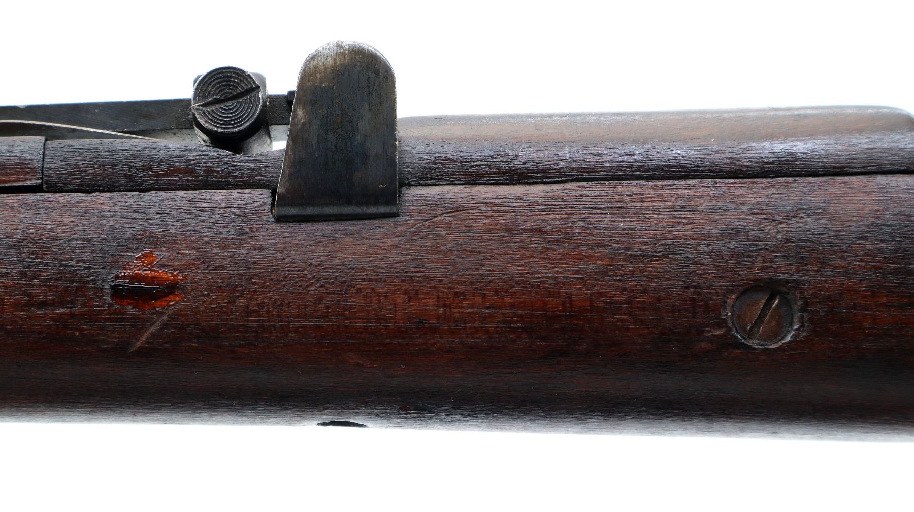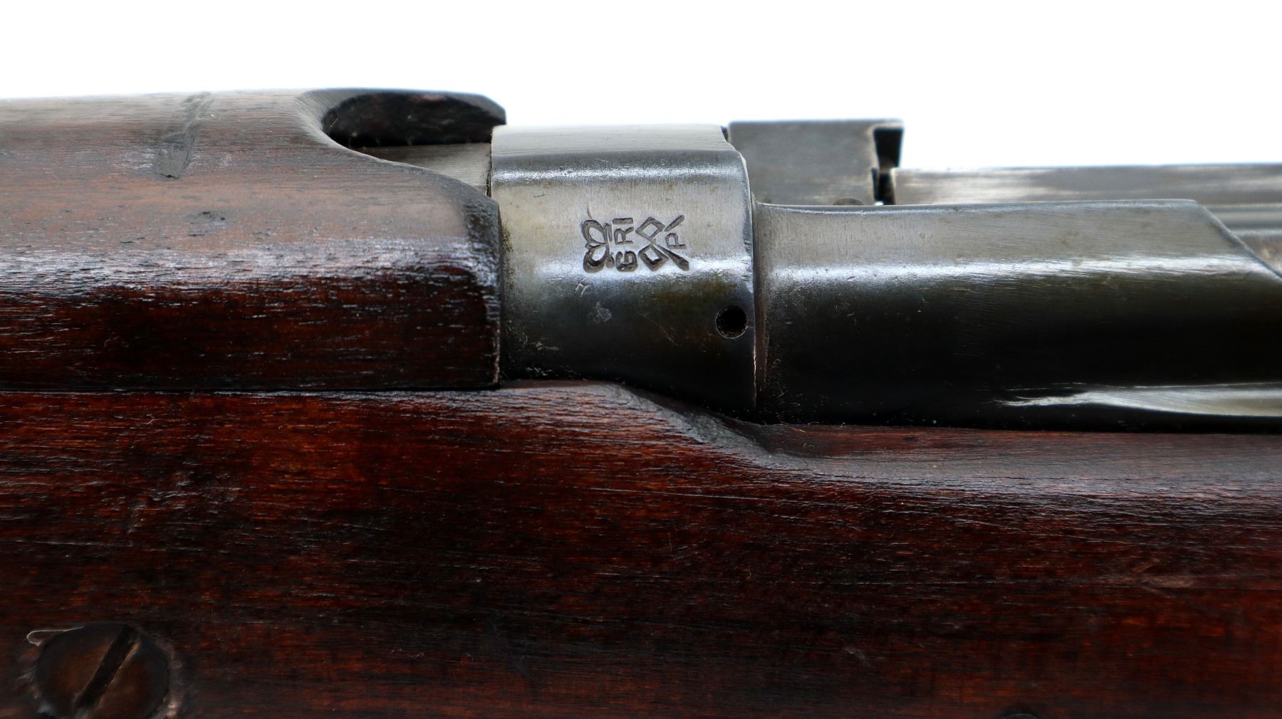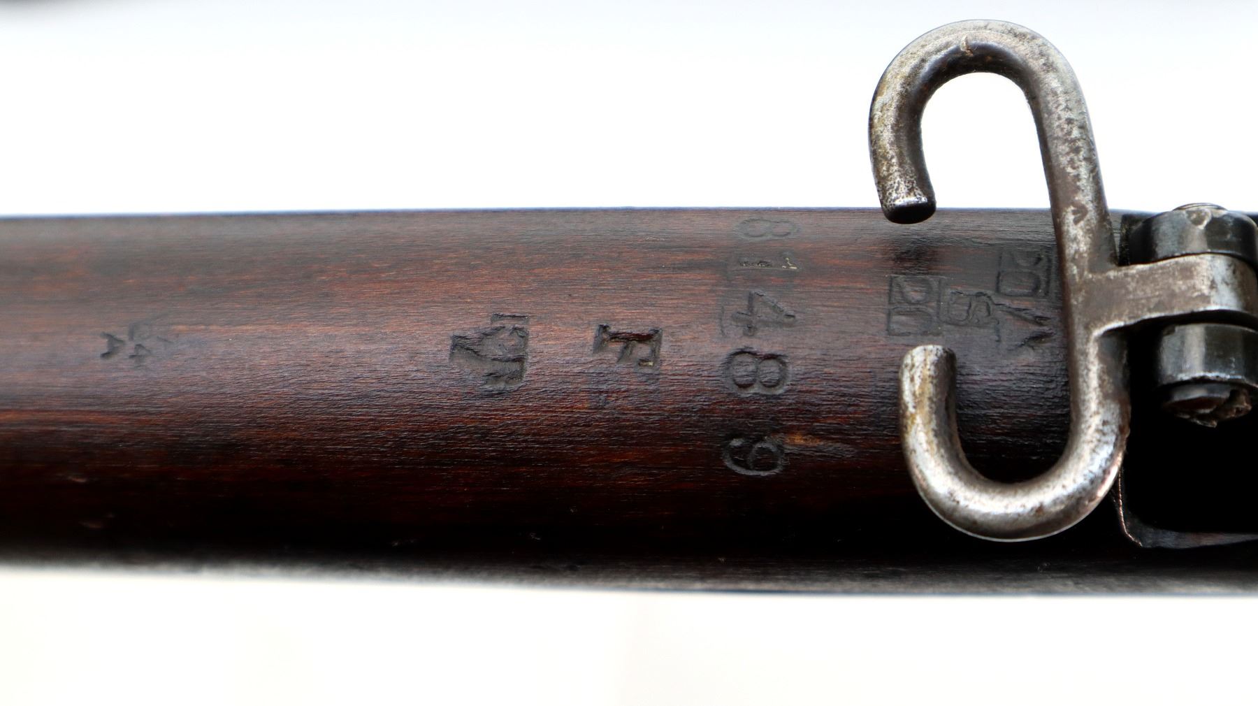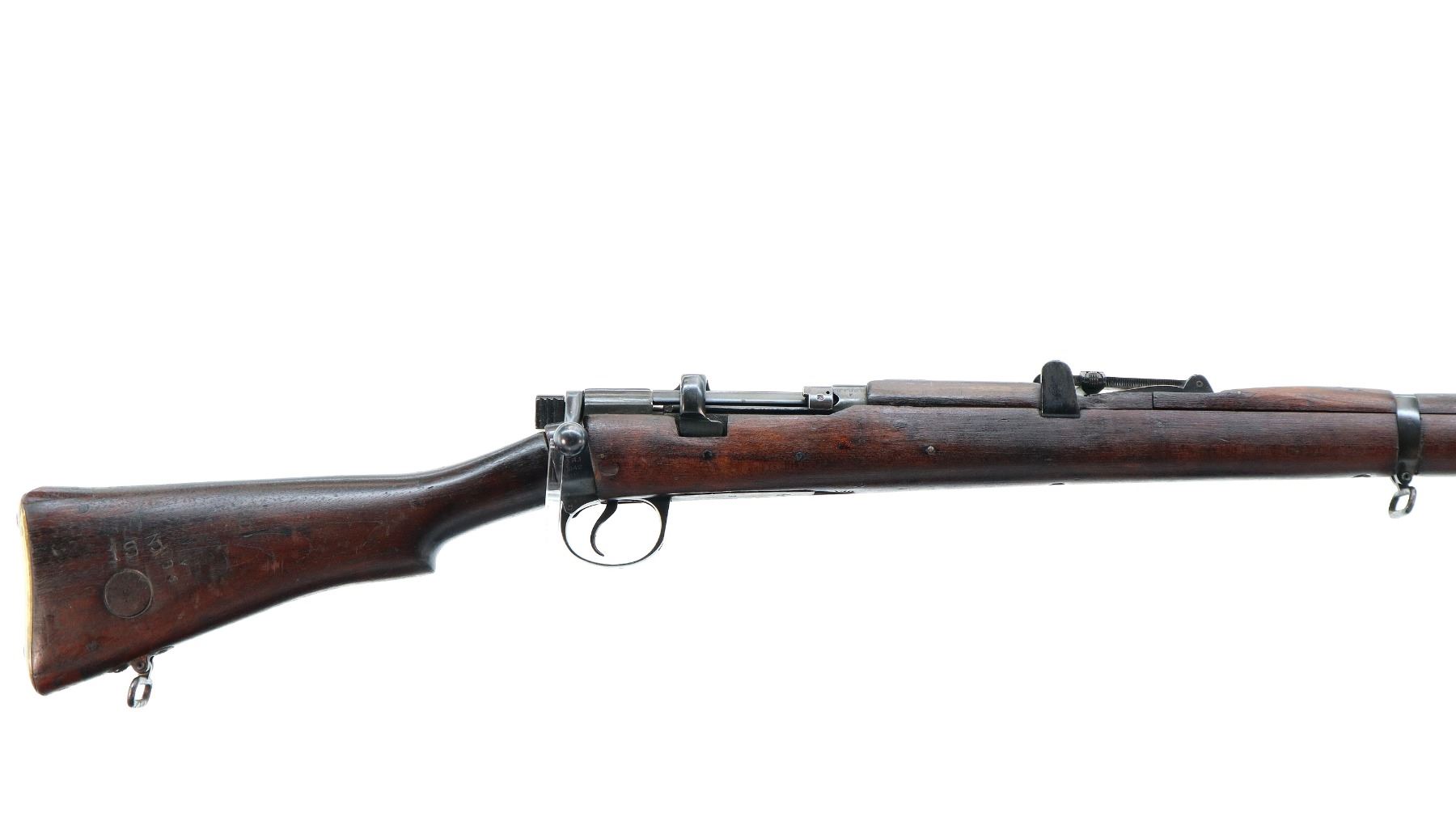 Main Description: Manufactured by GRI 1942, visible serial numbers match, converted by RFI to 410 1948. Blade front sight with ears and ramp, adjustable u notched rear sight with ears, blued finish. Four piece full military wood stocks, front handguard is chipped and cracked, forearm has Ishapore screw, pistol grip, smooth brass butt plate with trap, wood stock disk, arsenal repairs at heel and toe, sling and stacking swivels, bayonet lug.