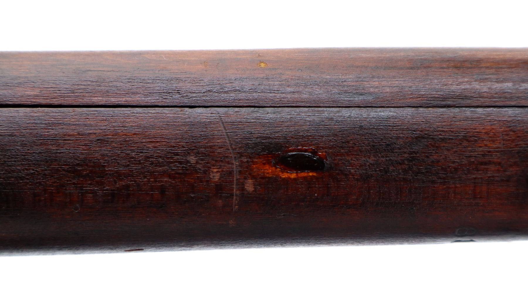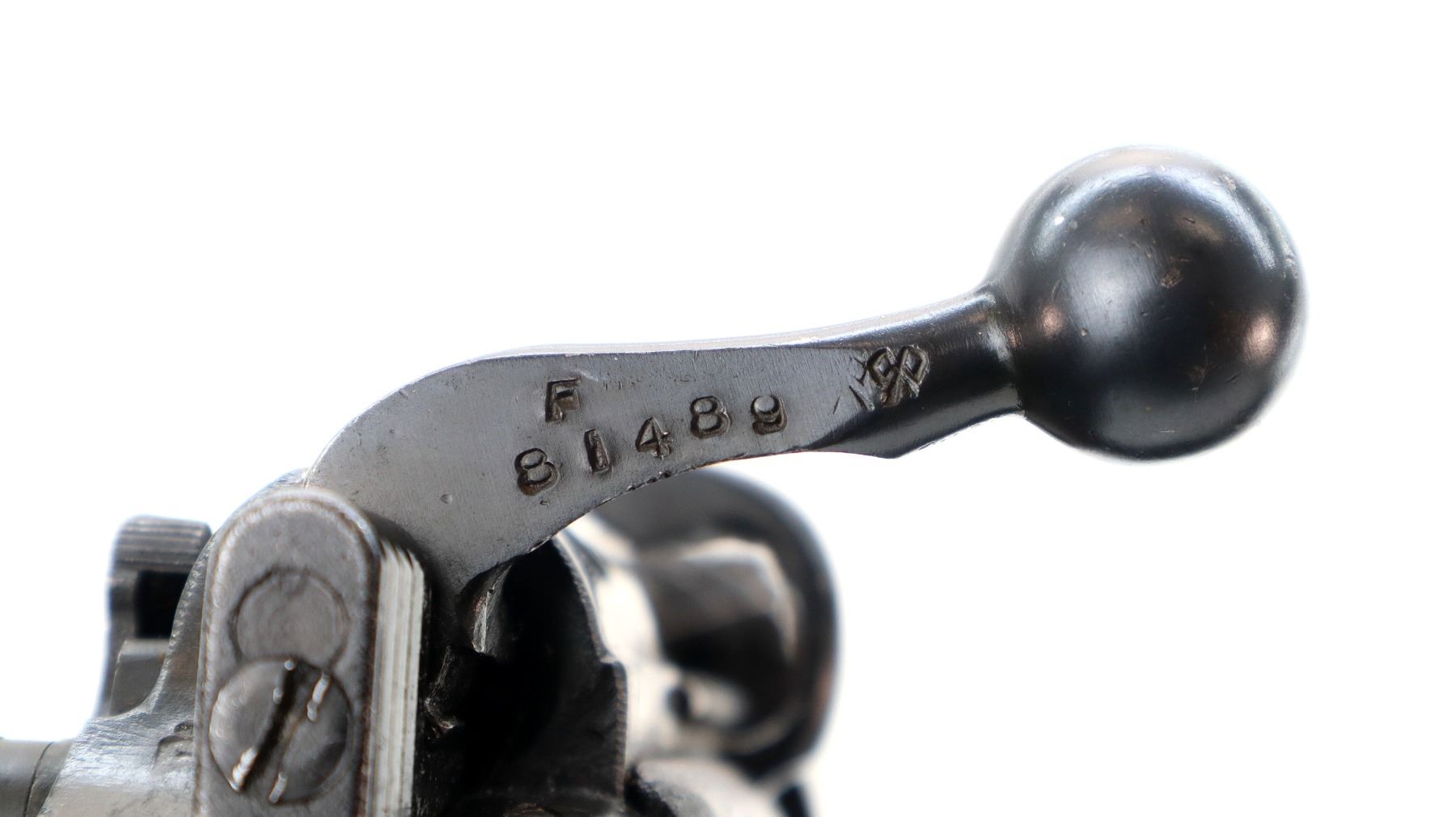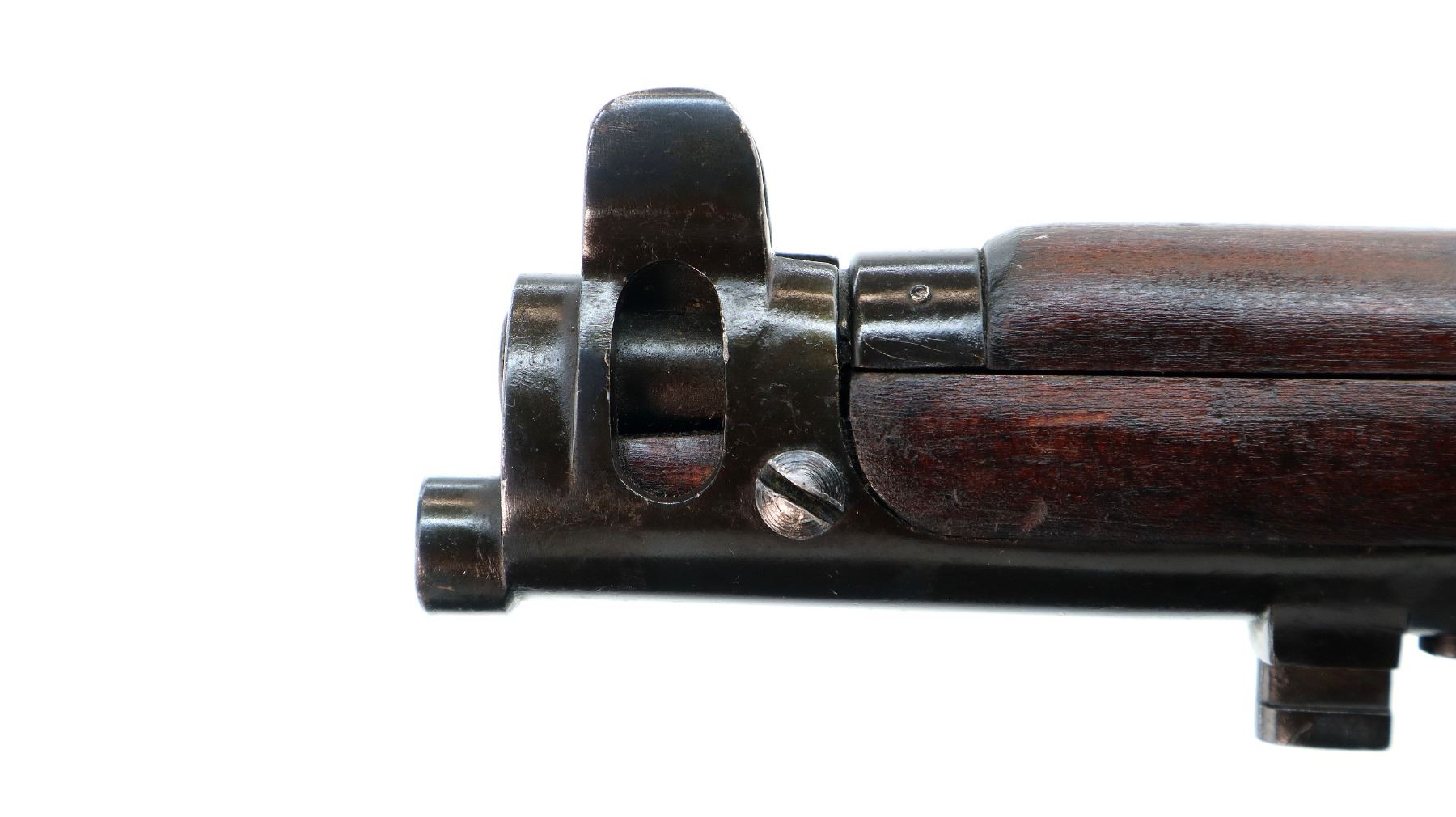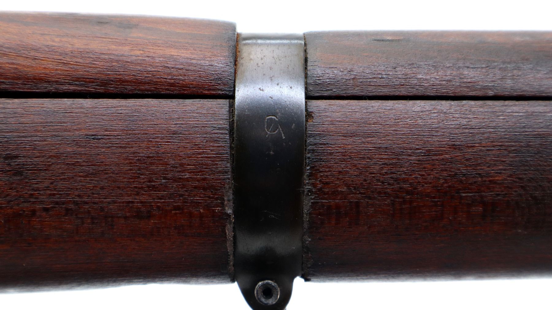 Main Description: Manufactured by GRI 1942, visible serial numbers match, converted by RFI to 410 1948. Blade front sight with ears and ramp, adjustable u notched rear sight with ears, blued finish. Four piece full military wood stocks, front handguard is chipped and cracked, forearm has Ishapore screw, pistol grip, smooth brass butt plate with trap, wood stock disk, arsenal repairs at heel and toe, sling and stacking swivels, bayonet lug.