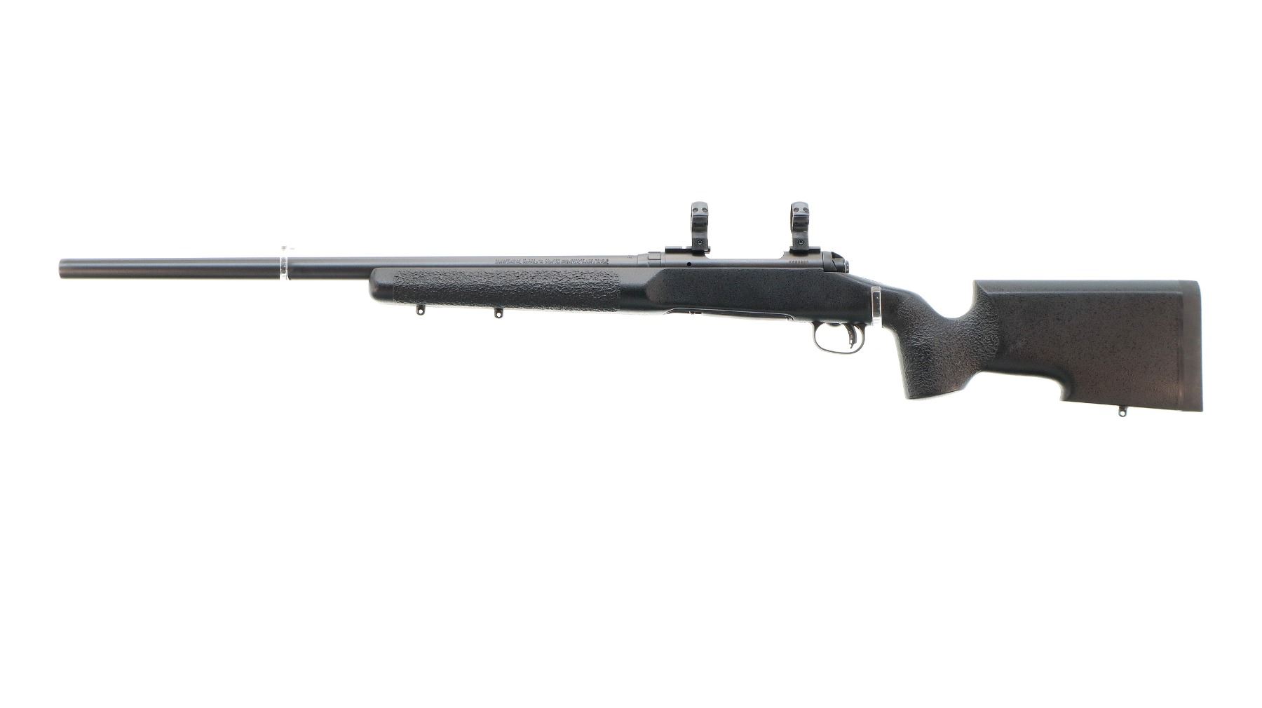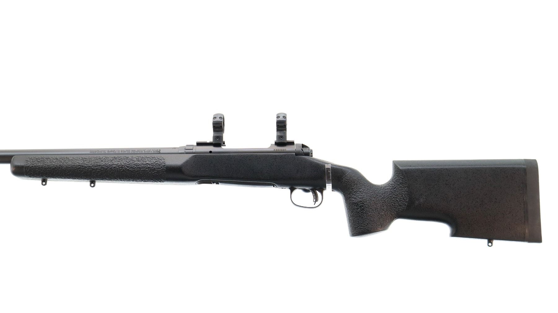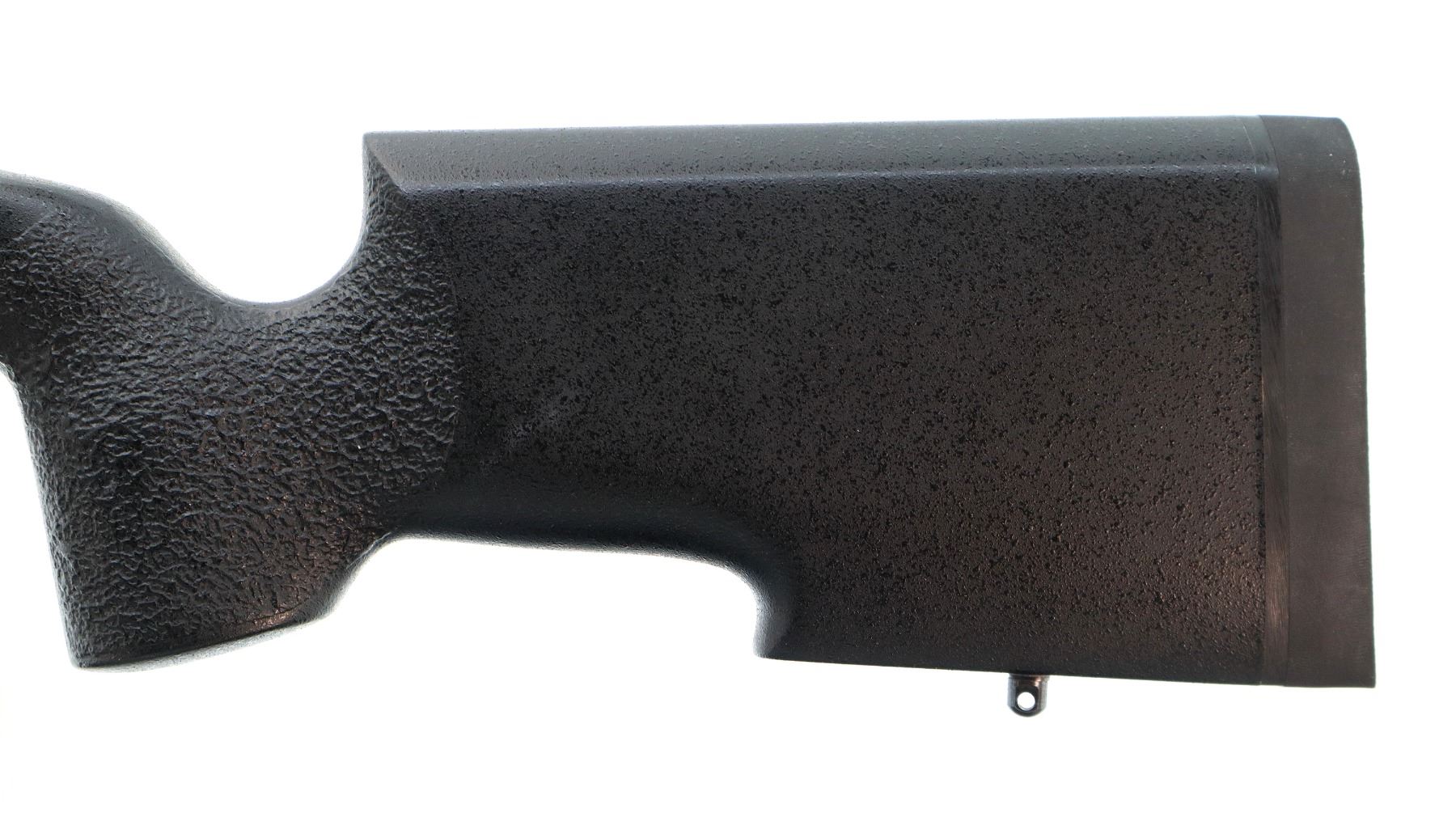 Main Description: No sights, Parkerized metal finish, heavy barrel, receiver drilled and tapped with two piece bases and 30mm rings installed, large bolt knob, tang safety. One piece black fiberglass tactical stock, textured wide forearm, thumb rest pistol grip, black rubber recoil pad, hooked butt, accu trigger, 3 swivel studs.