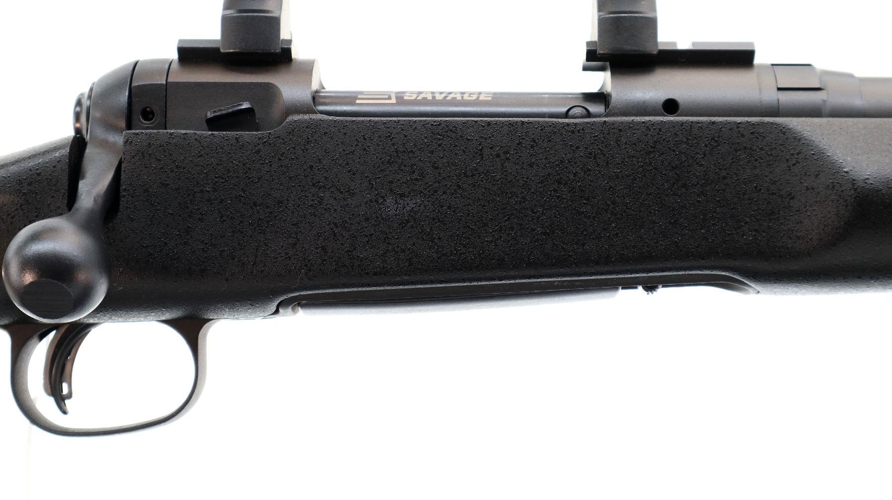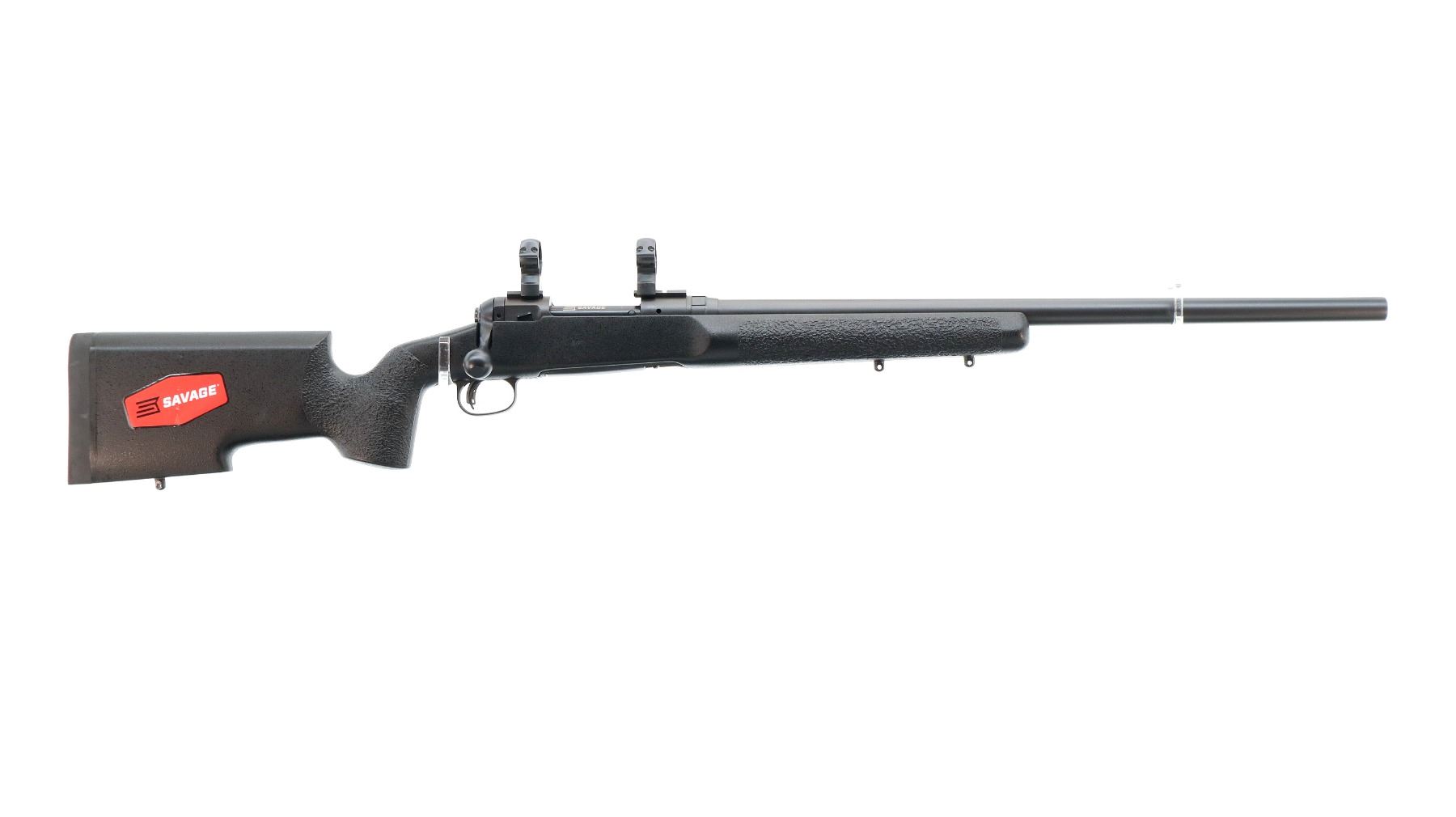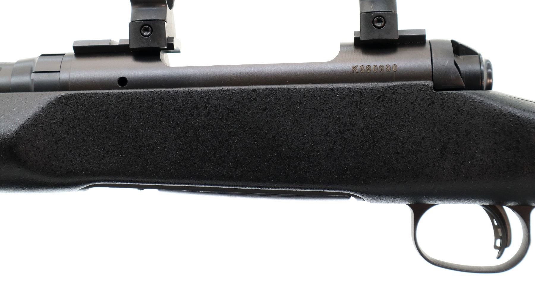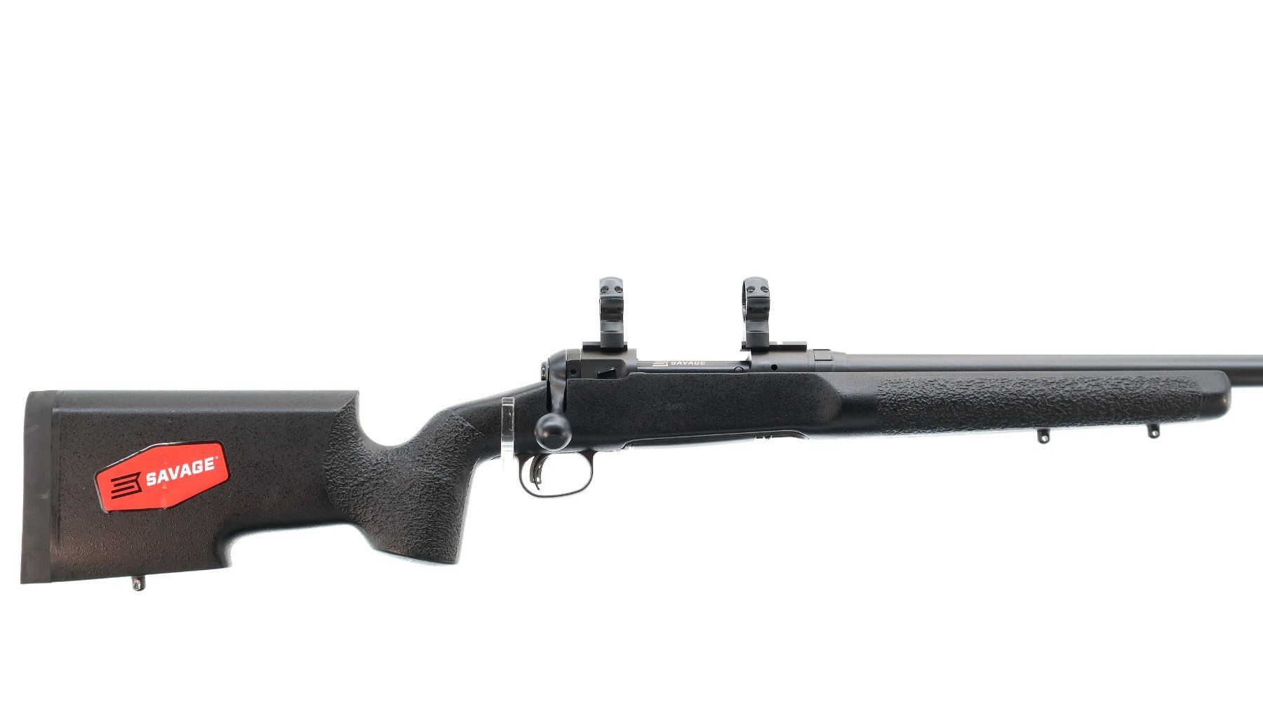 Main Description: No sights, Parkerized metal finish, heavy barrel, receiver drilled and tapped with two piece bases and 30mm rings installed, large bolt knob, tang safety. One piece black fiberglass tactical stock, textured wide forearm, thumb rest pistol grip, black rubber recoil pad, hooked butt, accu trigger, 3 swivel studs.