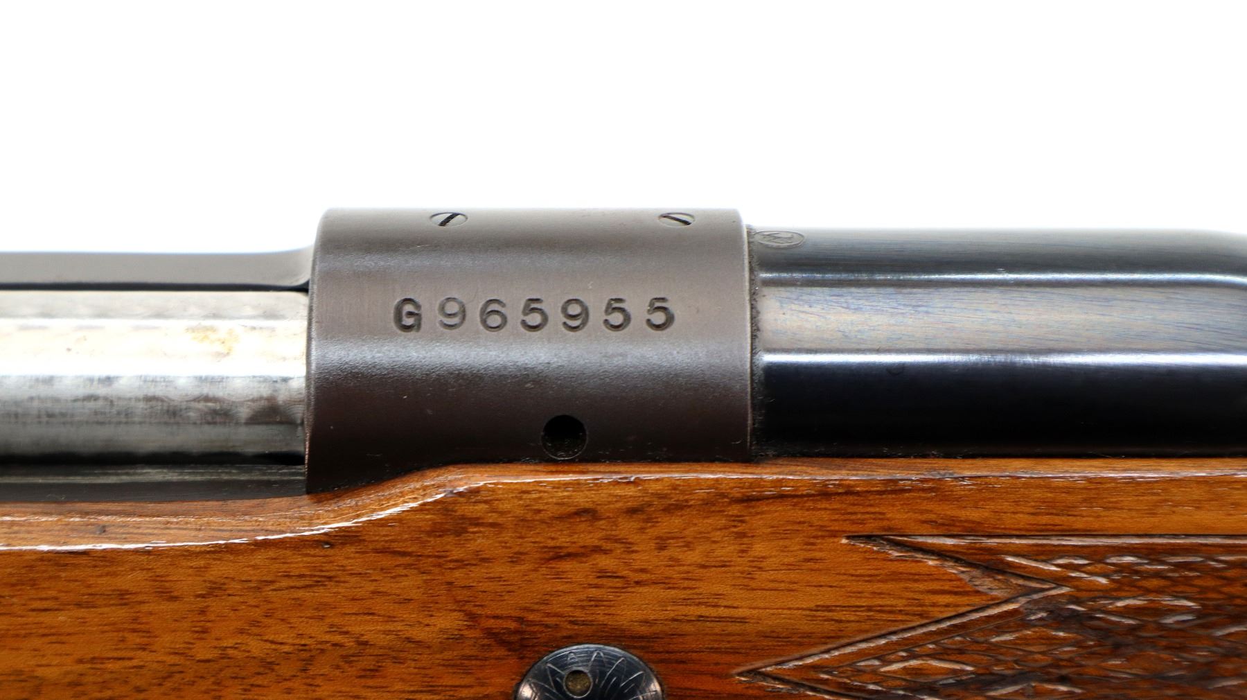 Main Description: Manufactured 1970. Blade front sight with hood and ramp, adjustable u notched rear sight, polish blued barrel, Satin finish receiver drilled and tapped with plug screws installed, jeweled bolt with smooth knob. One piece wood stock, checkered forearm and pistol grip, cheek rest, red vented rubber recoil, 13.5" LOP, steel grip cap, hinged floor plate, sling swivels.