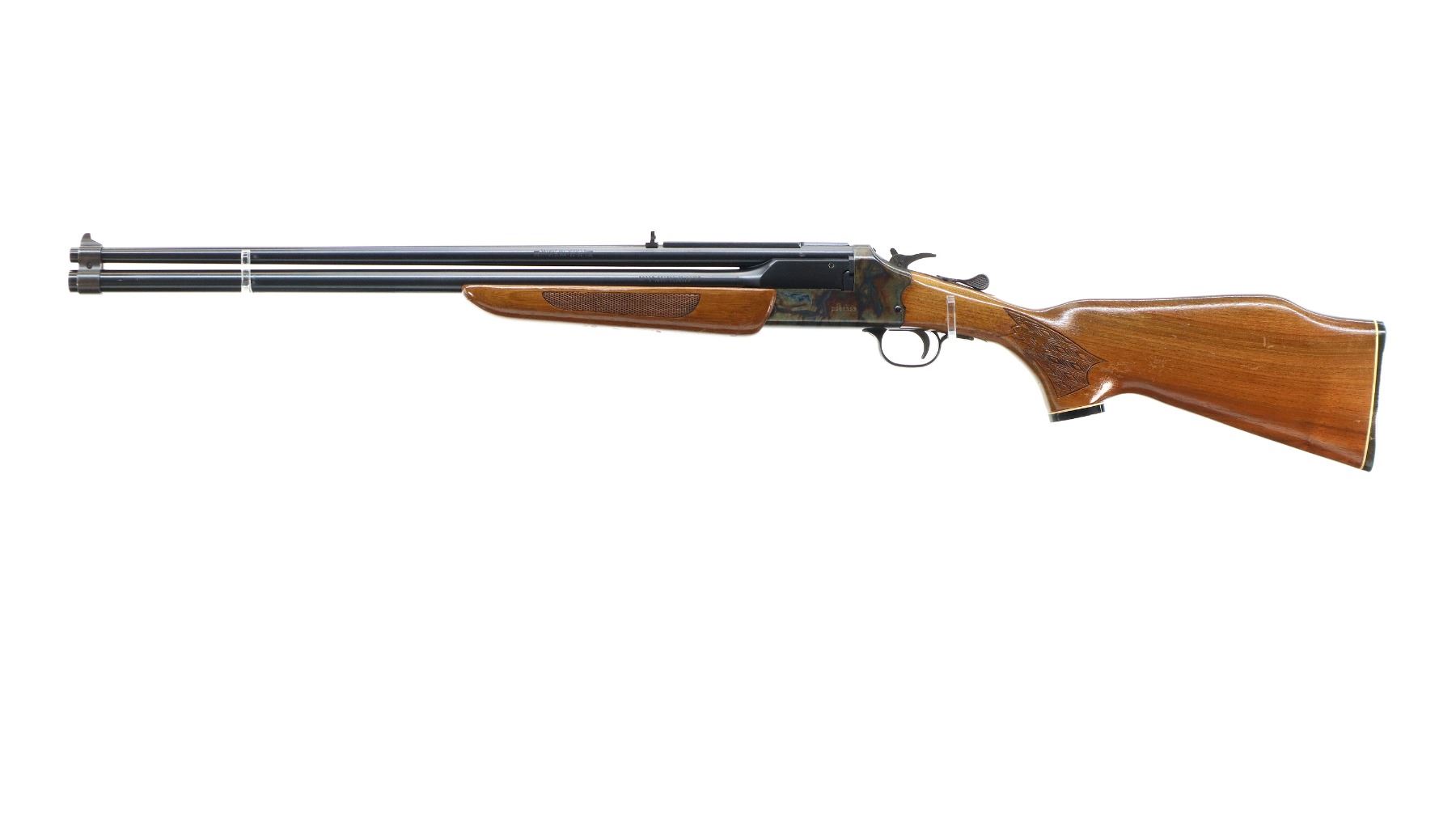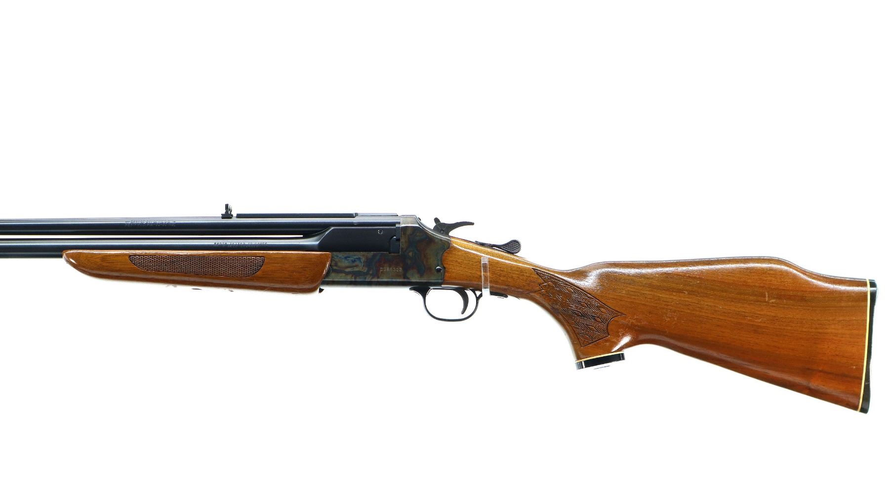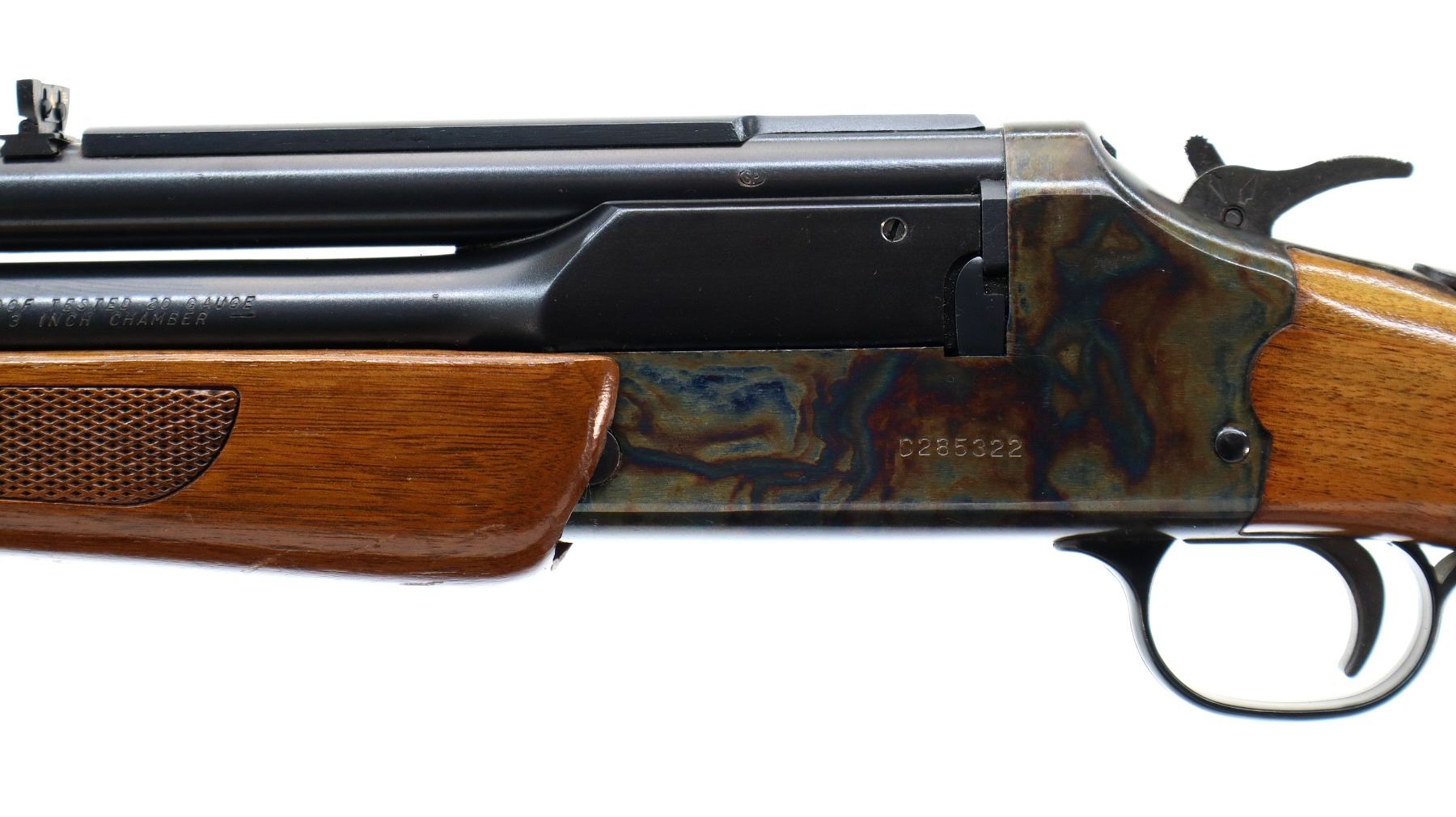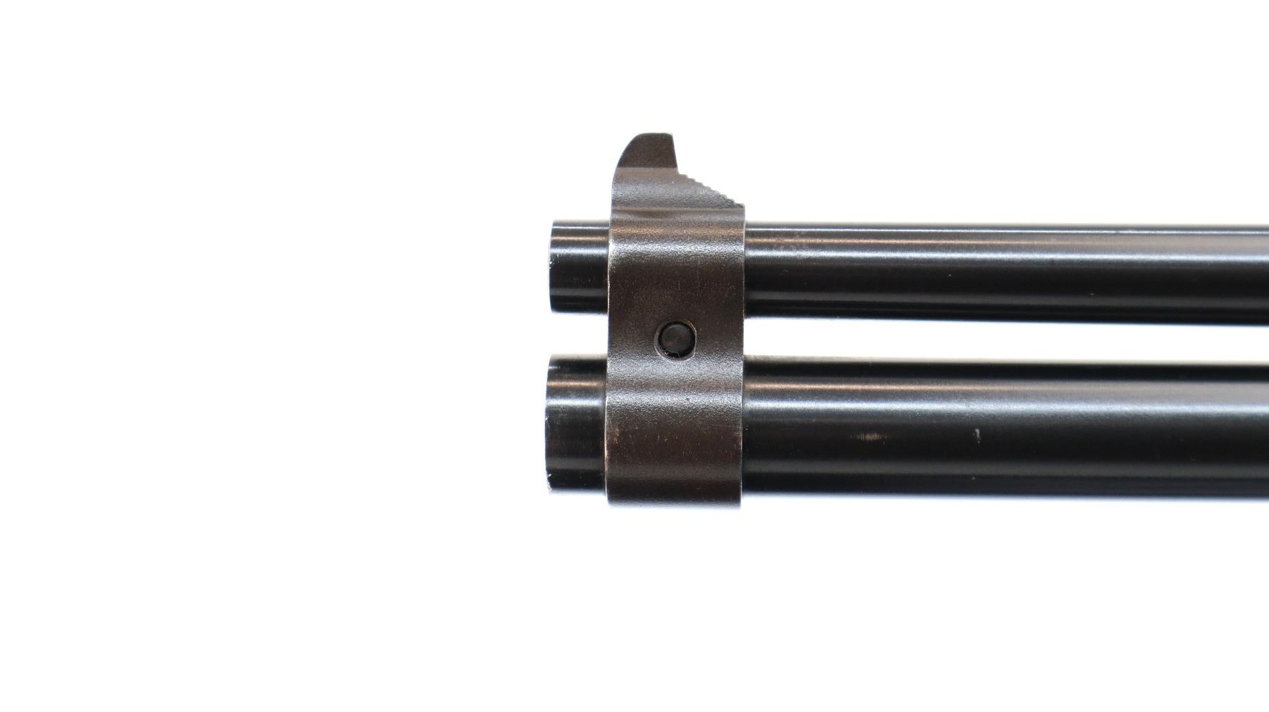 Main Description: Blade front sight with ramp, adjustable folding u notched rear sight, blued barrels with rib drilled and tapped with plug screws installed, colour case hardened receiver, grooved spur hammer with barrel selector. Two piece wood stocks, cracked behind receiver both sides, checkered forearm and pistol grip, raised comb, grooved black polymer butt plate, grip cap,