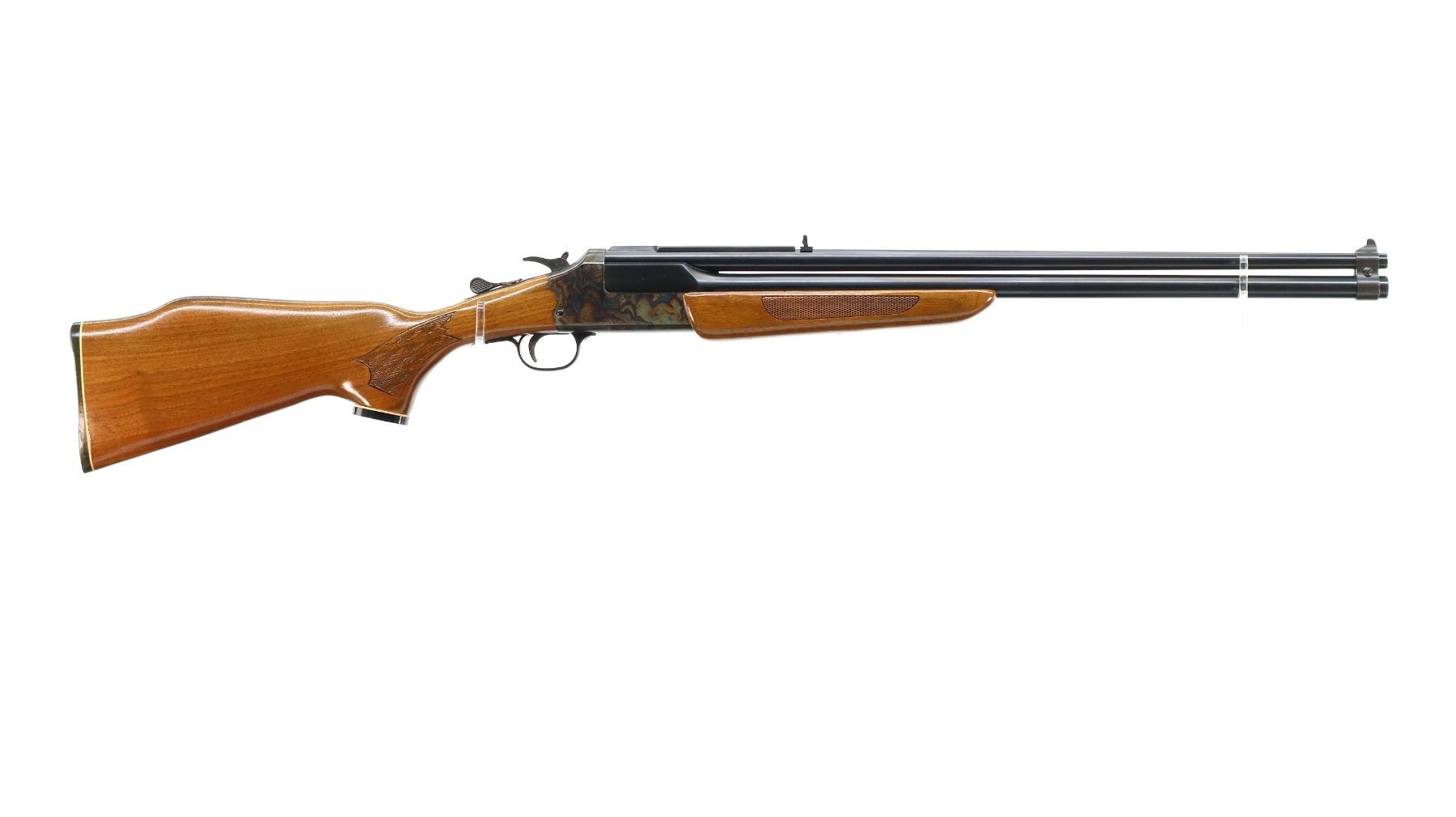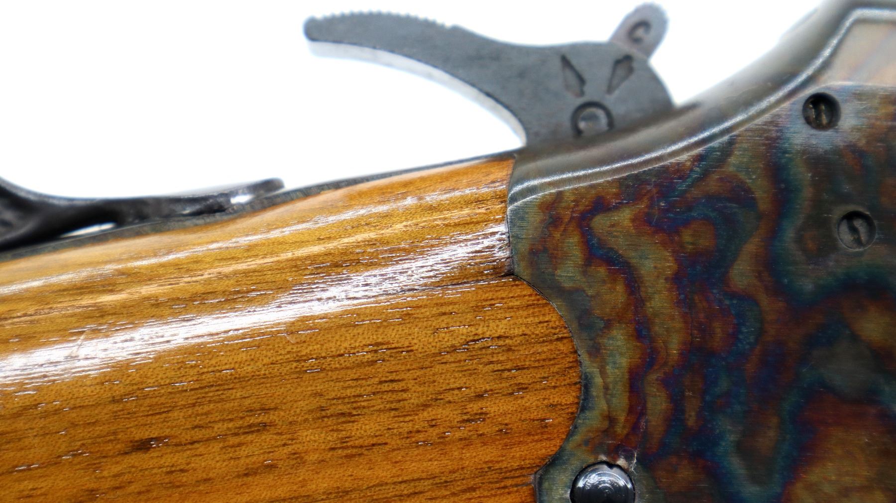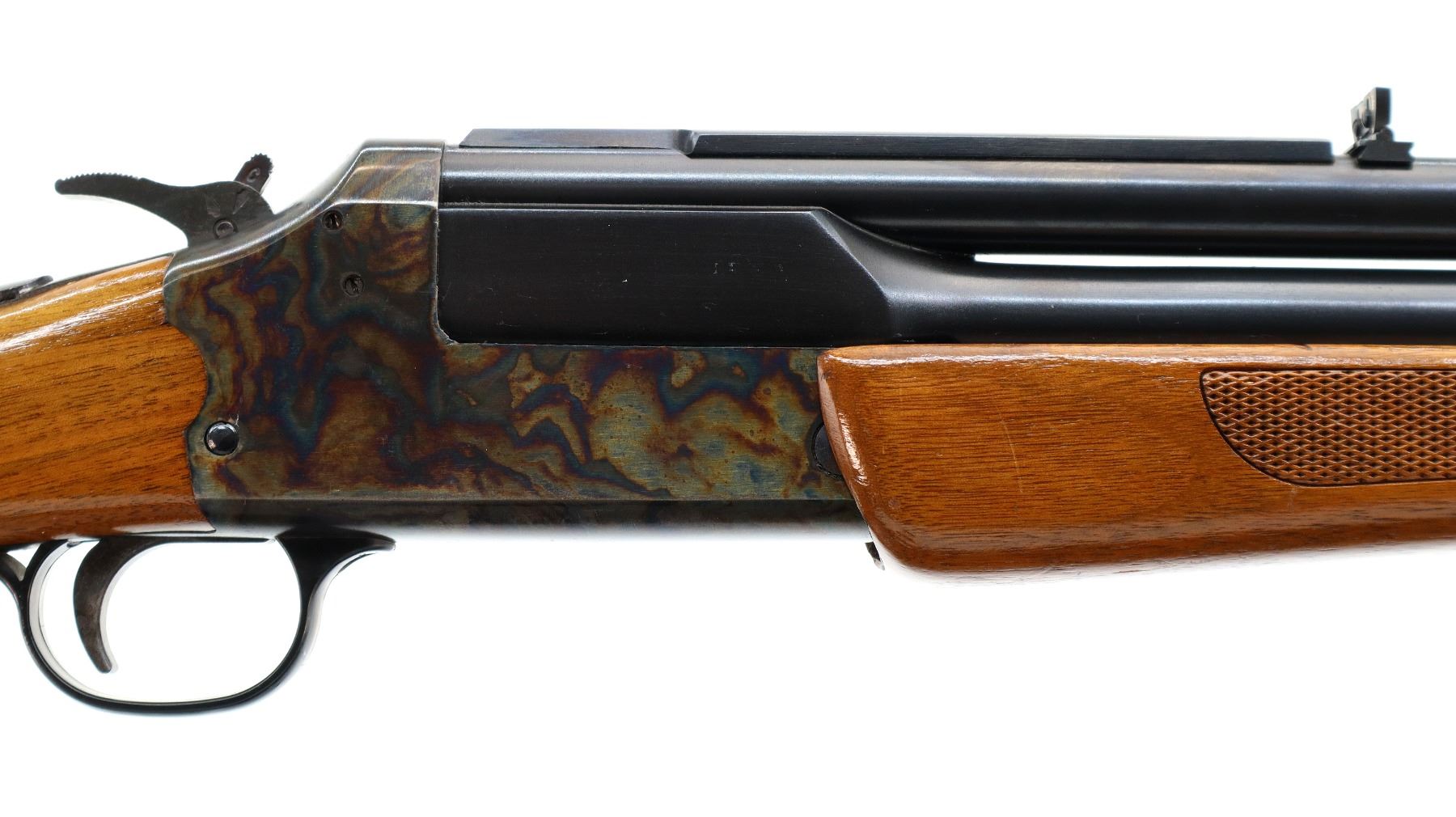 Main Description: Blade front sight with ramp, adjustable folding u notched rear sight, blued barrels with rib drilled and tapped with plug screws installed, colour case hardened receiver, grooved spur hammer with barrel selector. Two piece wood stocks, cracked behind receiver both sides, checkered forearm and pistol grip, raised comb, grooved black polymer butt plate, grip cap,