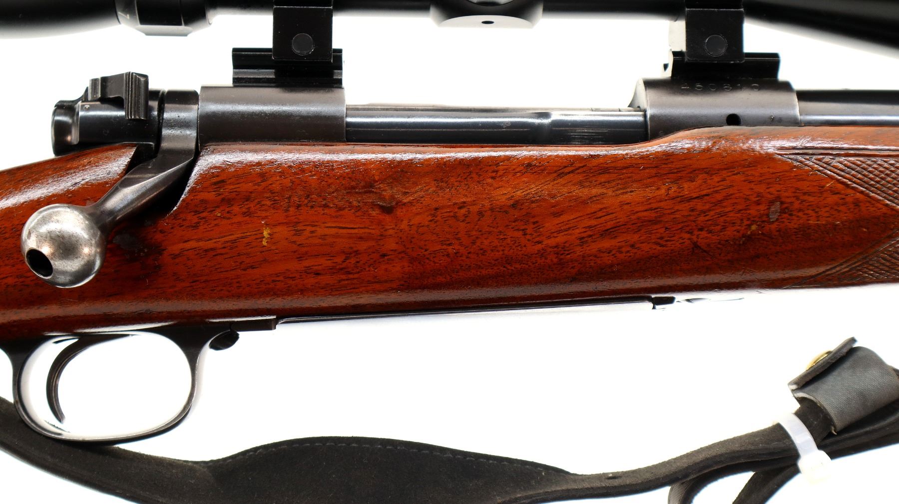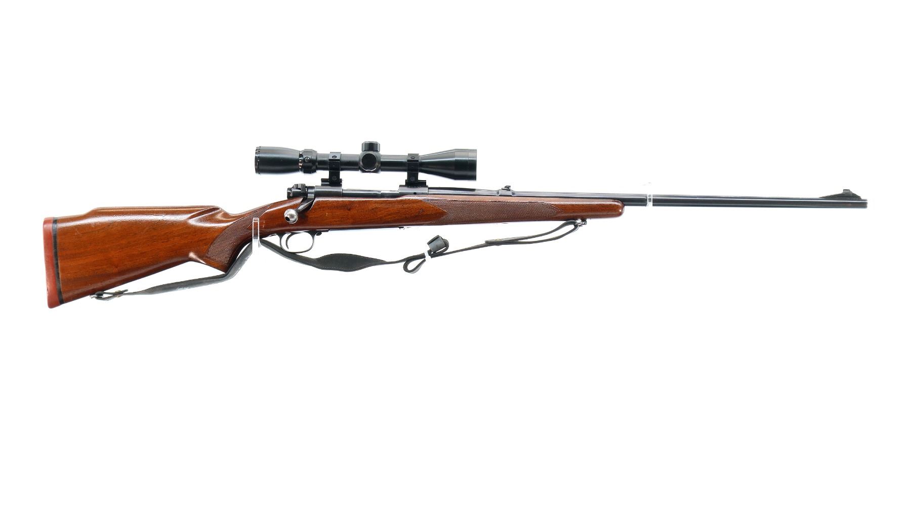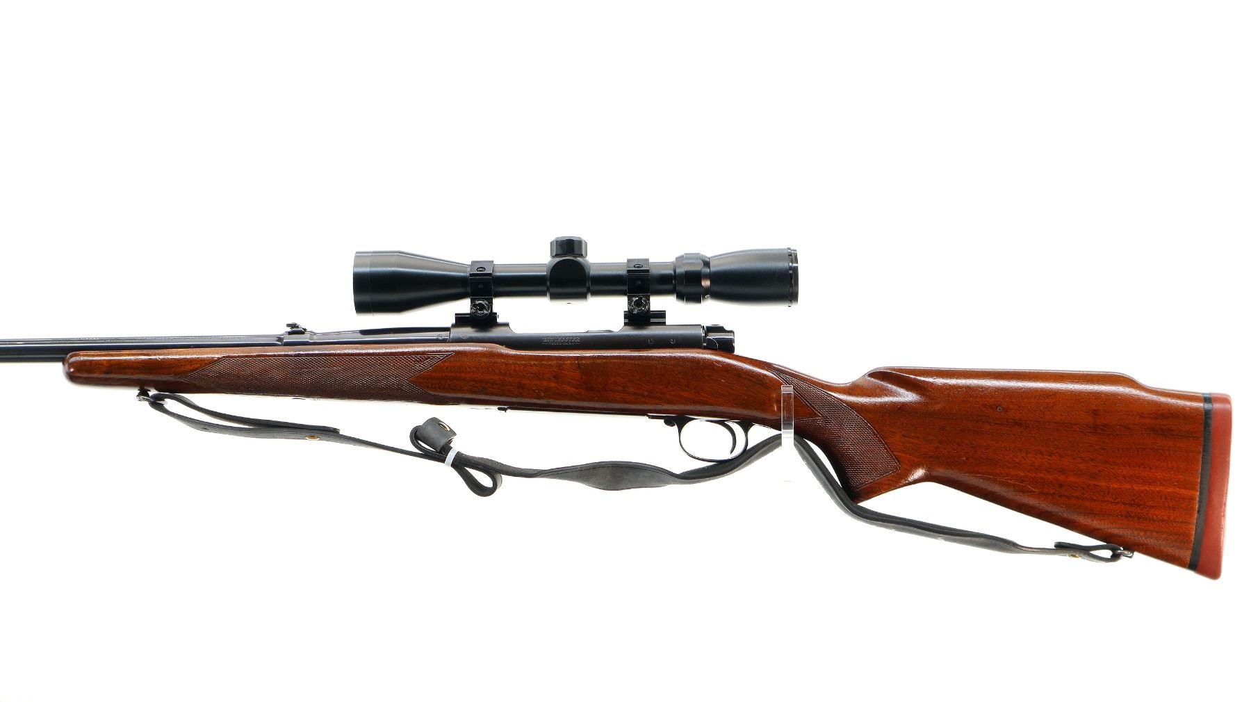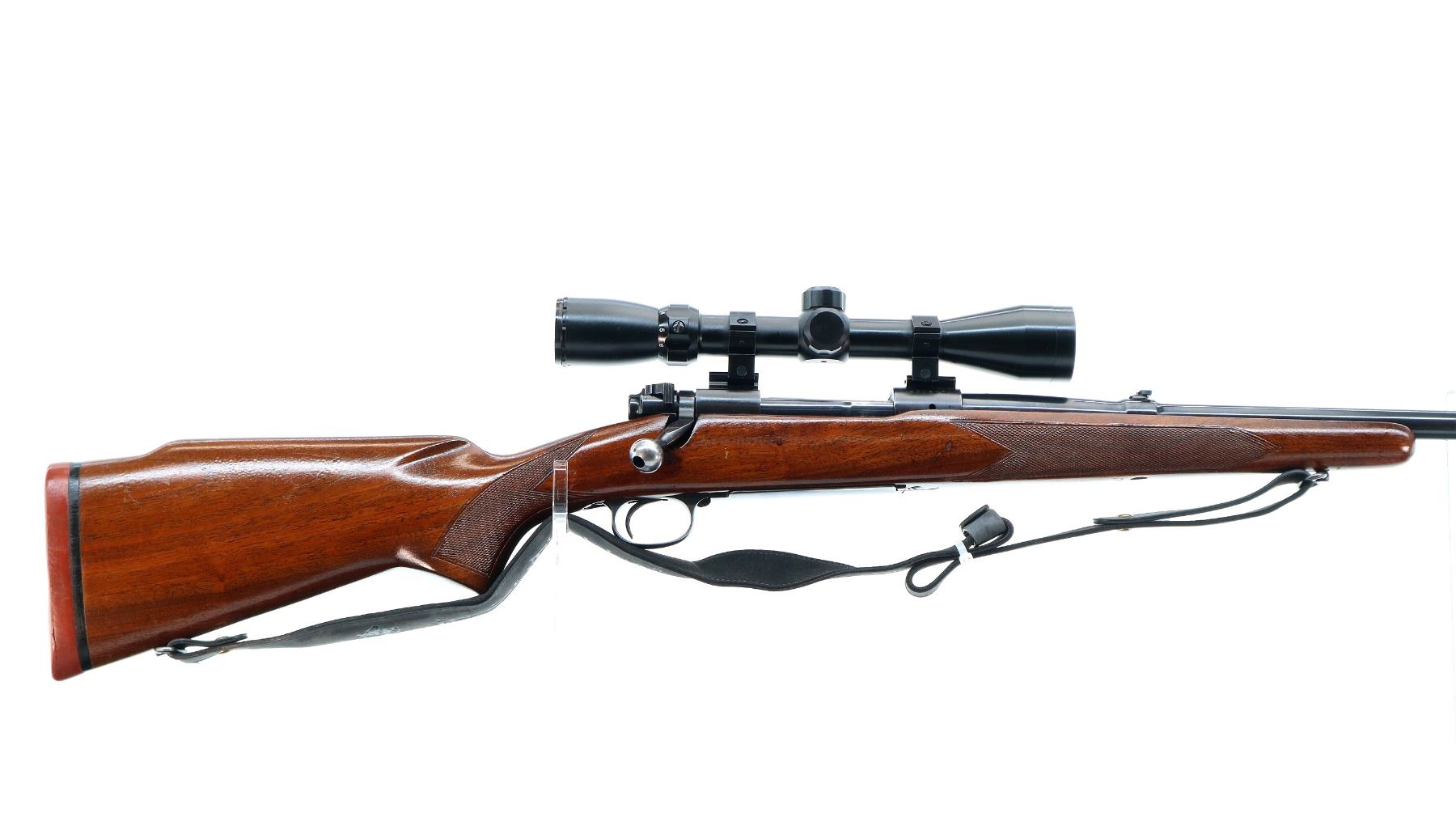 Main Description: Manufactured 1959. Blade front sight with ramp, adjustable folding u notched rear sight, polish blued finish, receiver drilled and tapped with unknown 3-9x40 scope installed, clear optics with duplex crosshair. Controlled round feed bolt with smooth knob. One piece wood stock, checkered forearm and pistol grip, raised comb, black rubber recoil pad, 13.5" LOP, stock chipped at bottom of grip, hinged floor plate, sling swivels with grey leather Winchester sling