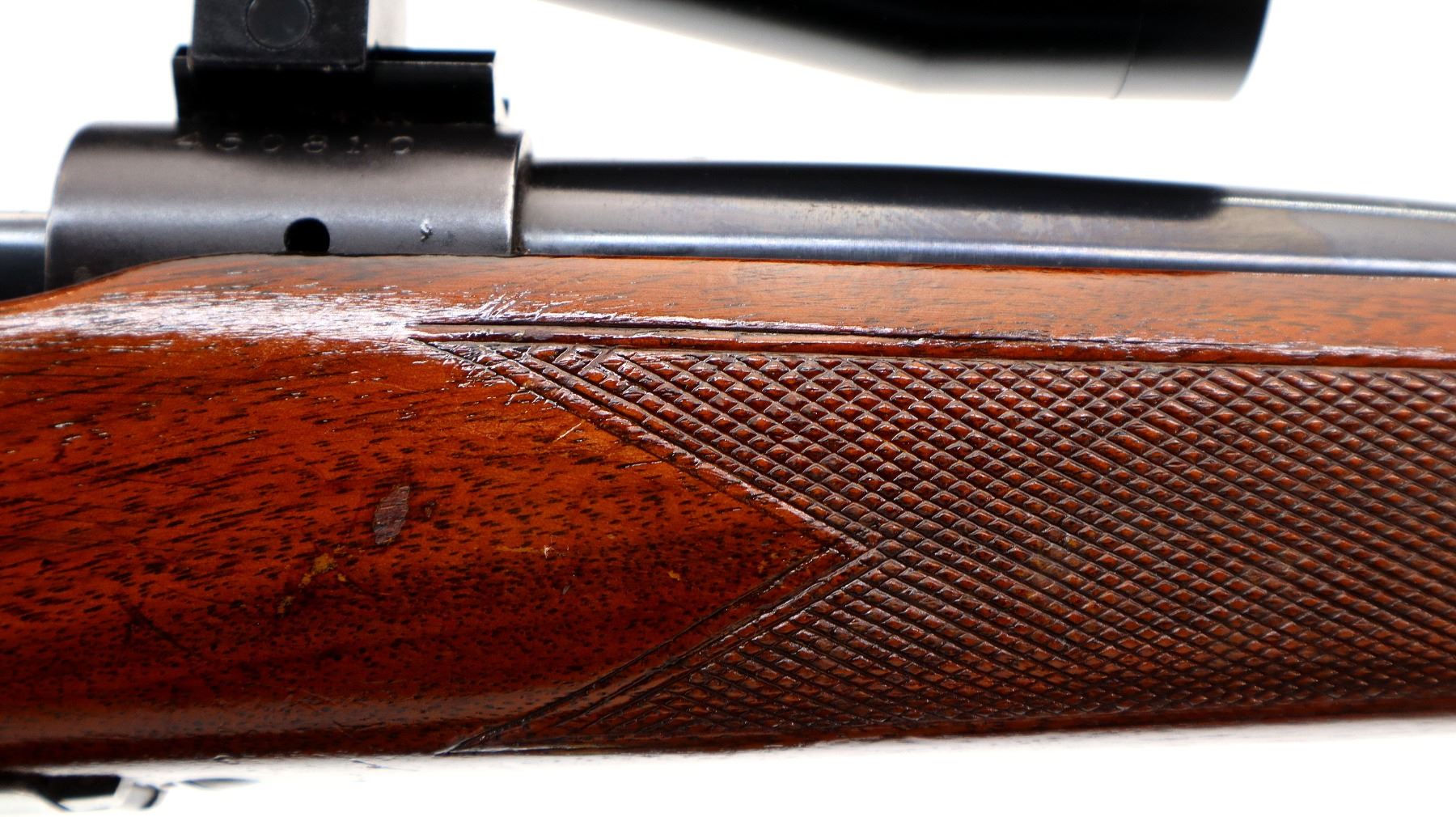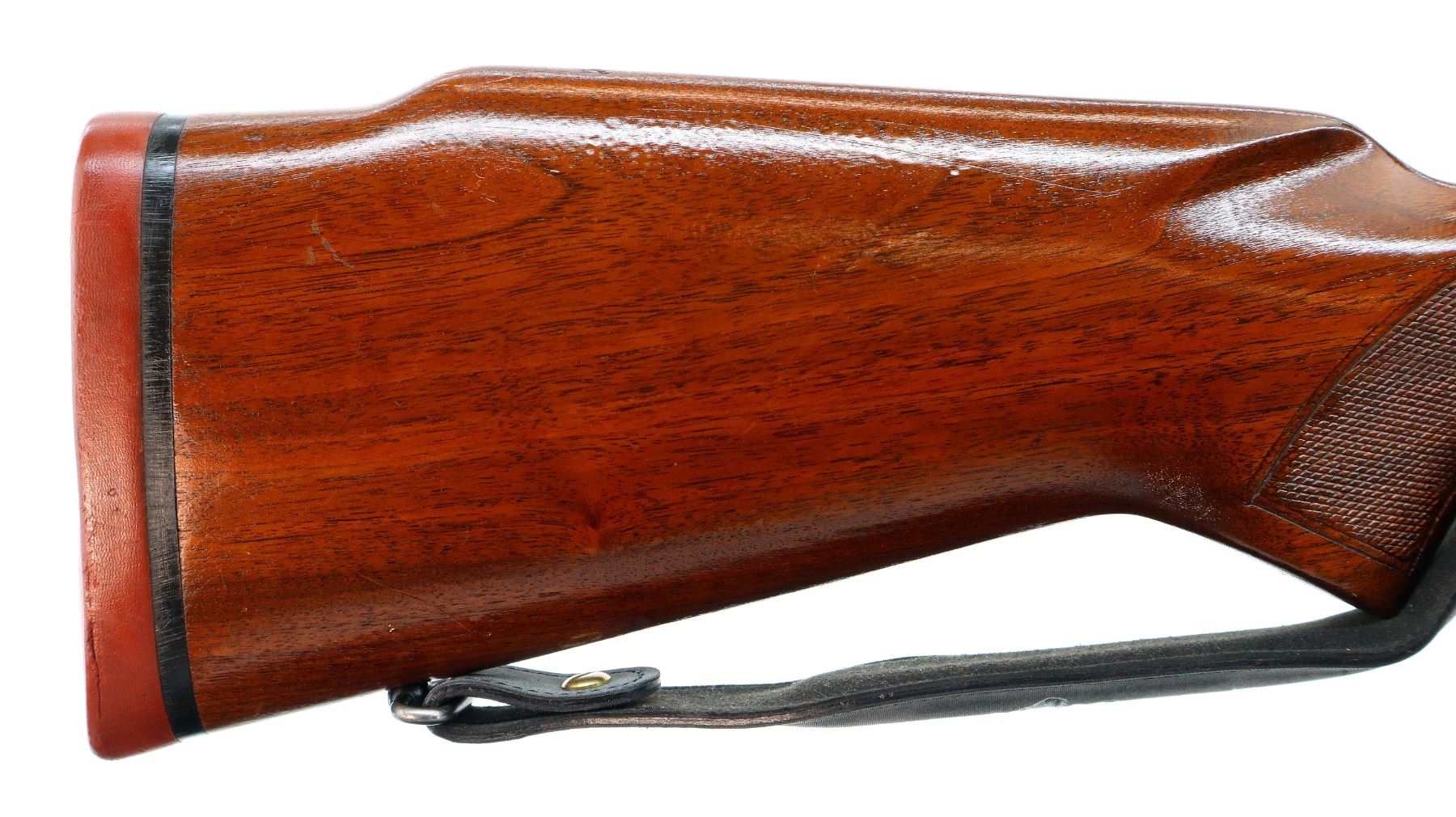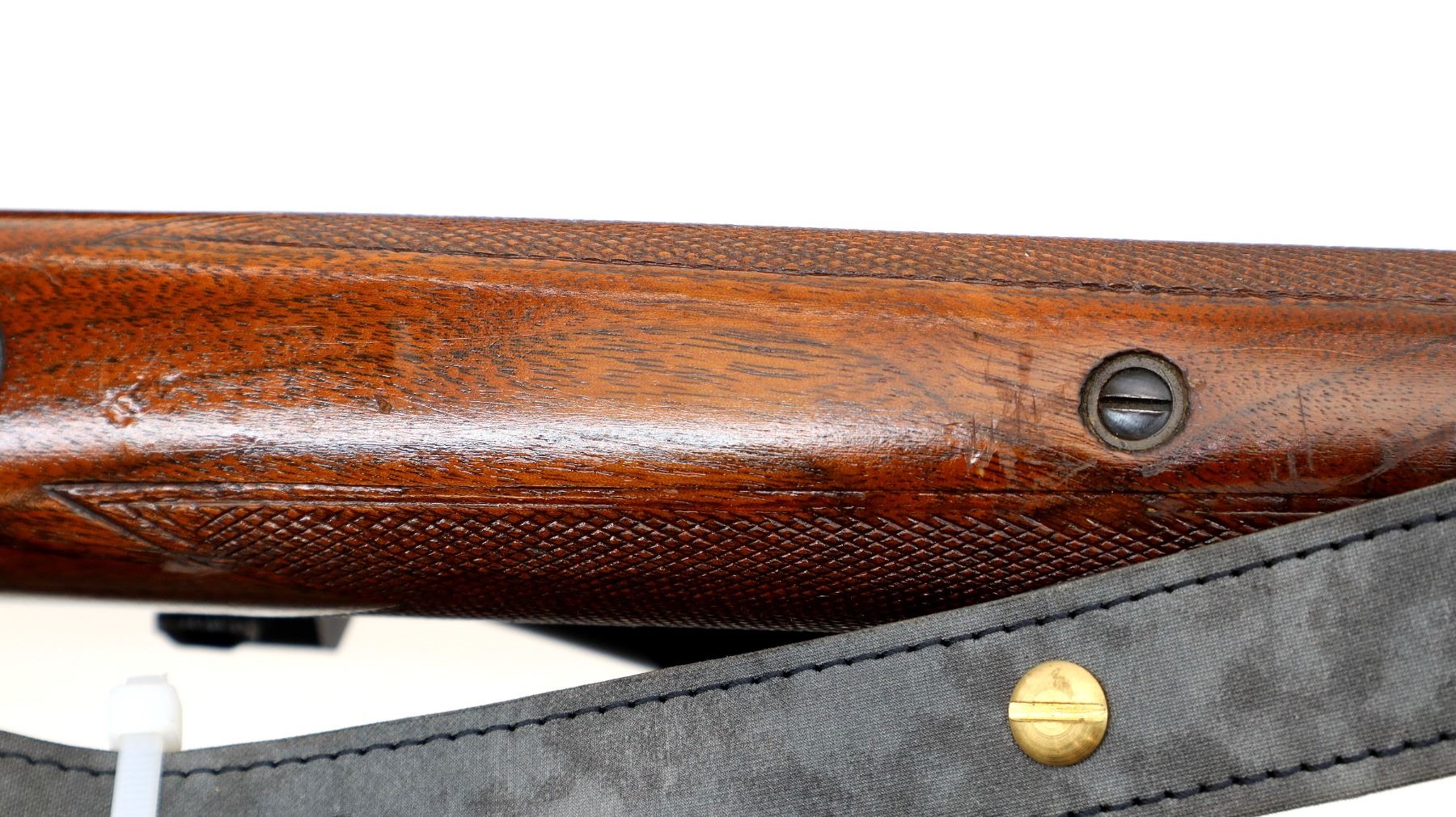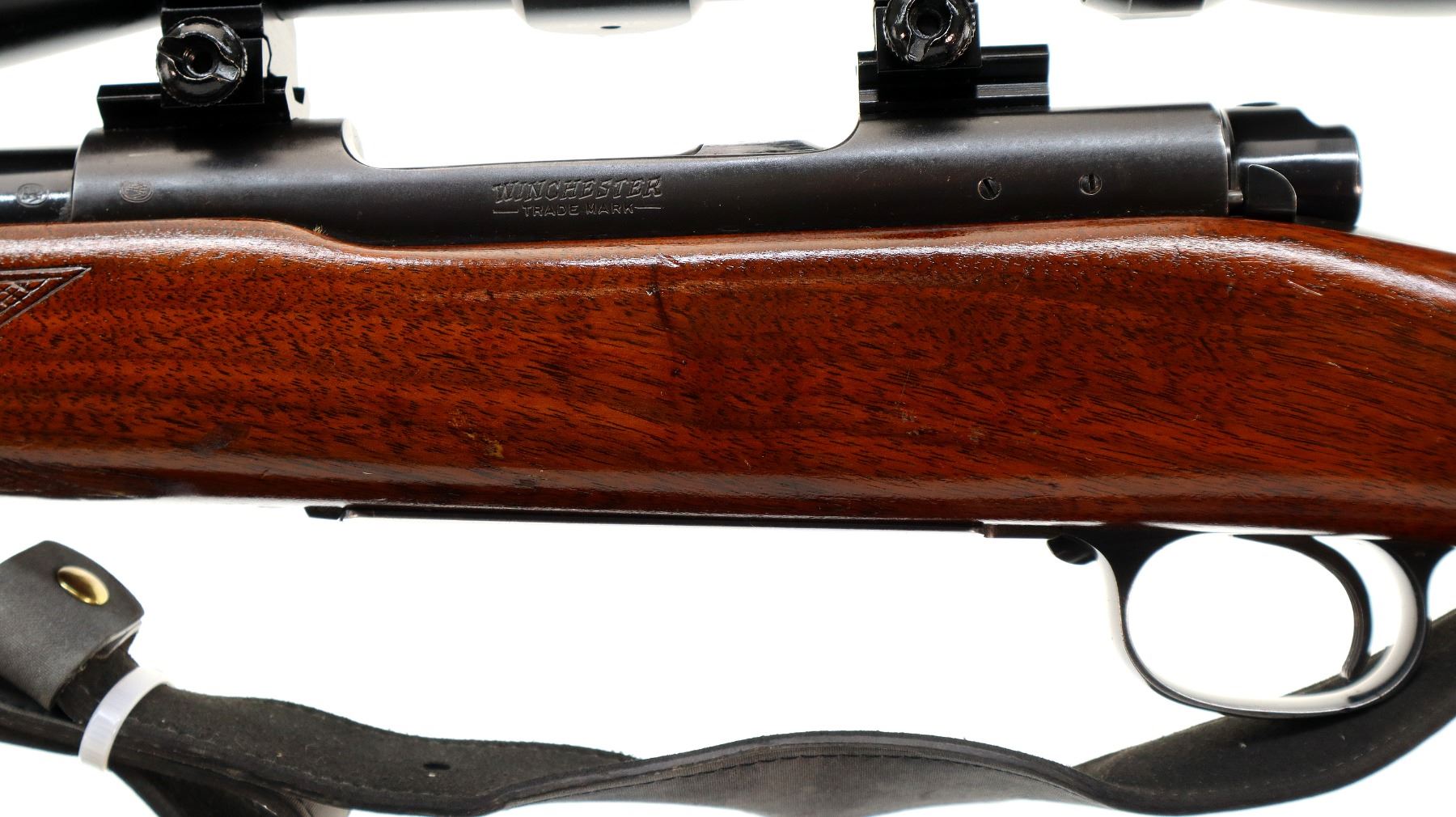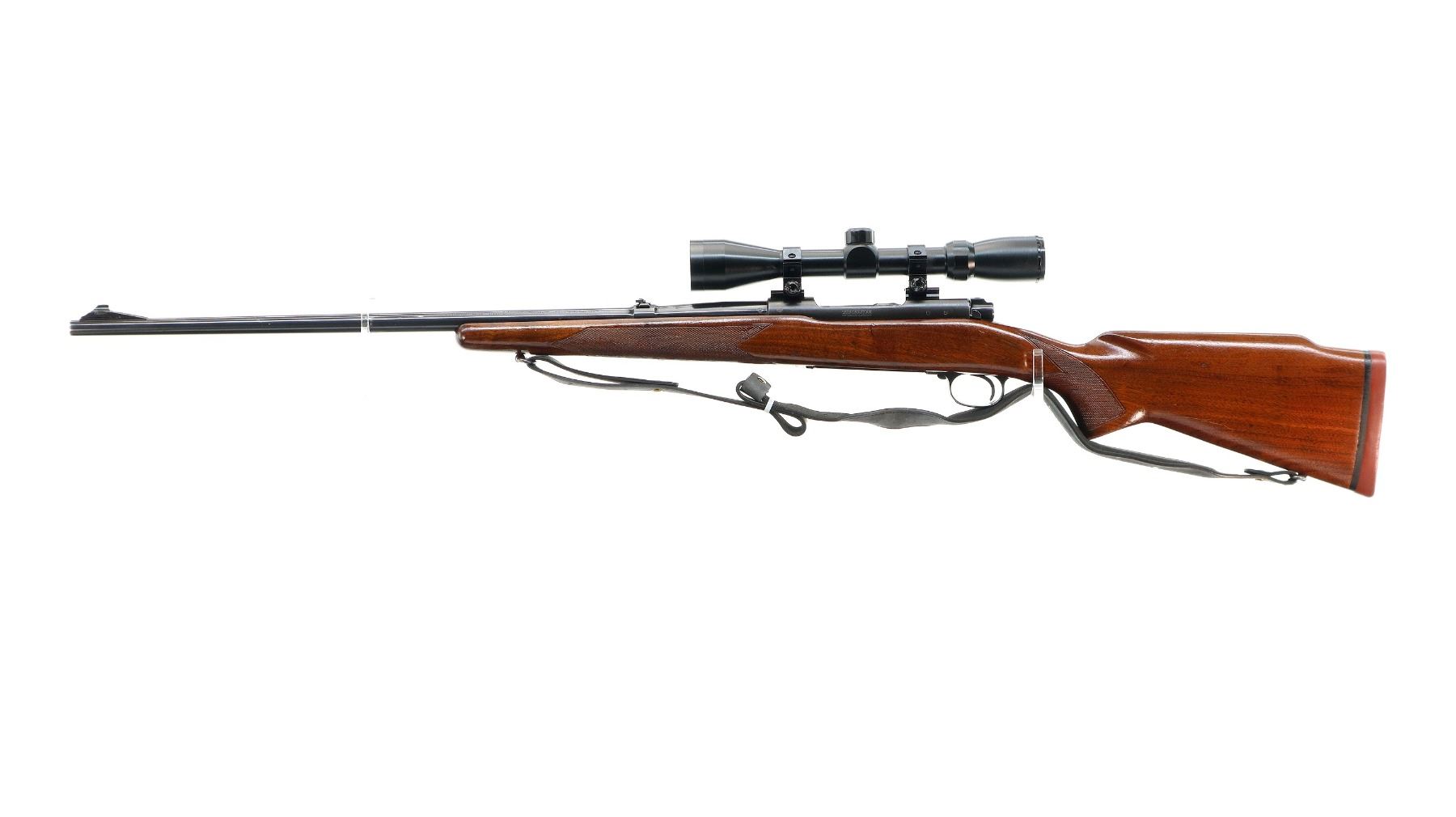 Main Description: Manufactured 1959. Blade front sight with ramp, adjustable folding u notched rear sight, polish blued finish, receiver drilled and tapped with unknown 3-9x40 scope installed, clear optics with duplex crosshair. Controlled round feed bolt with smooth knob. One piece wood stock, checkered forearm and pistol grip, raised comb, black rubber recoil pad, 13.5" LOP, stock chipped at bottom of grip, hinged floor plate, sling swivels with grey leather Winchester sling