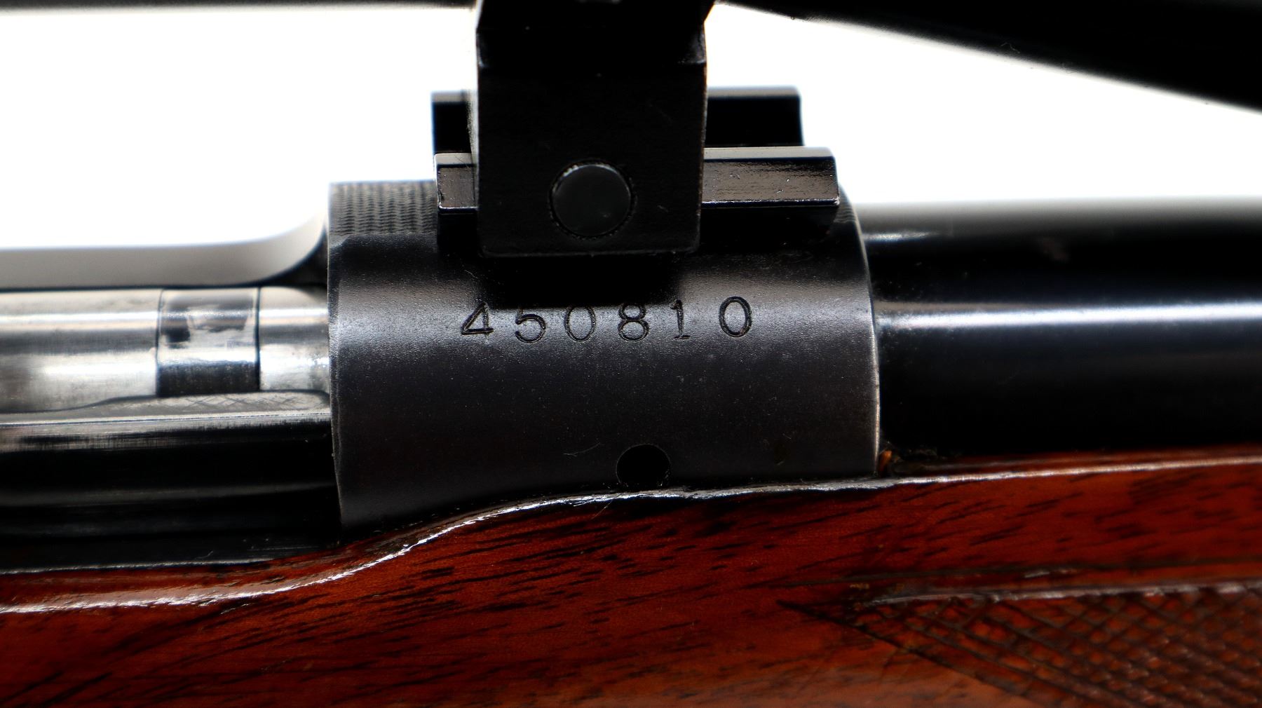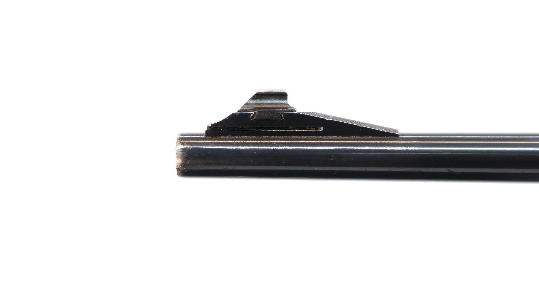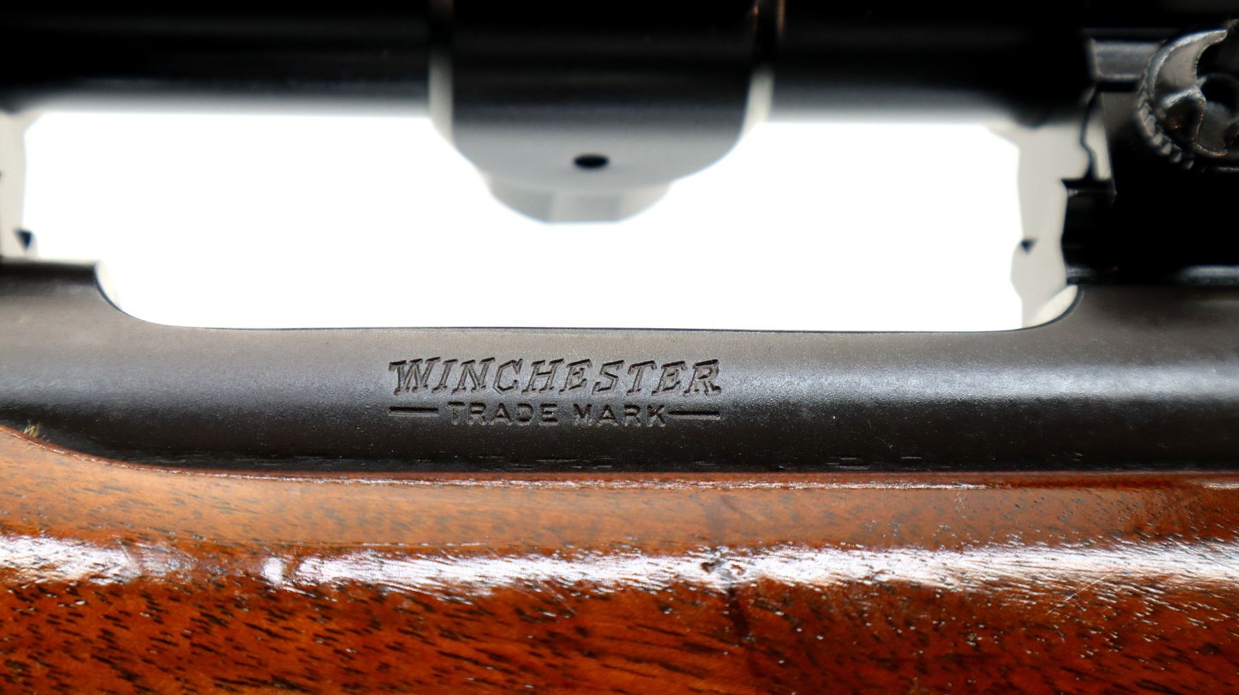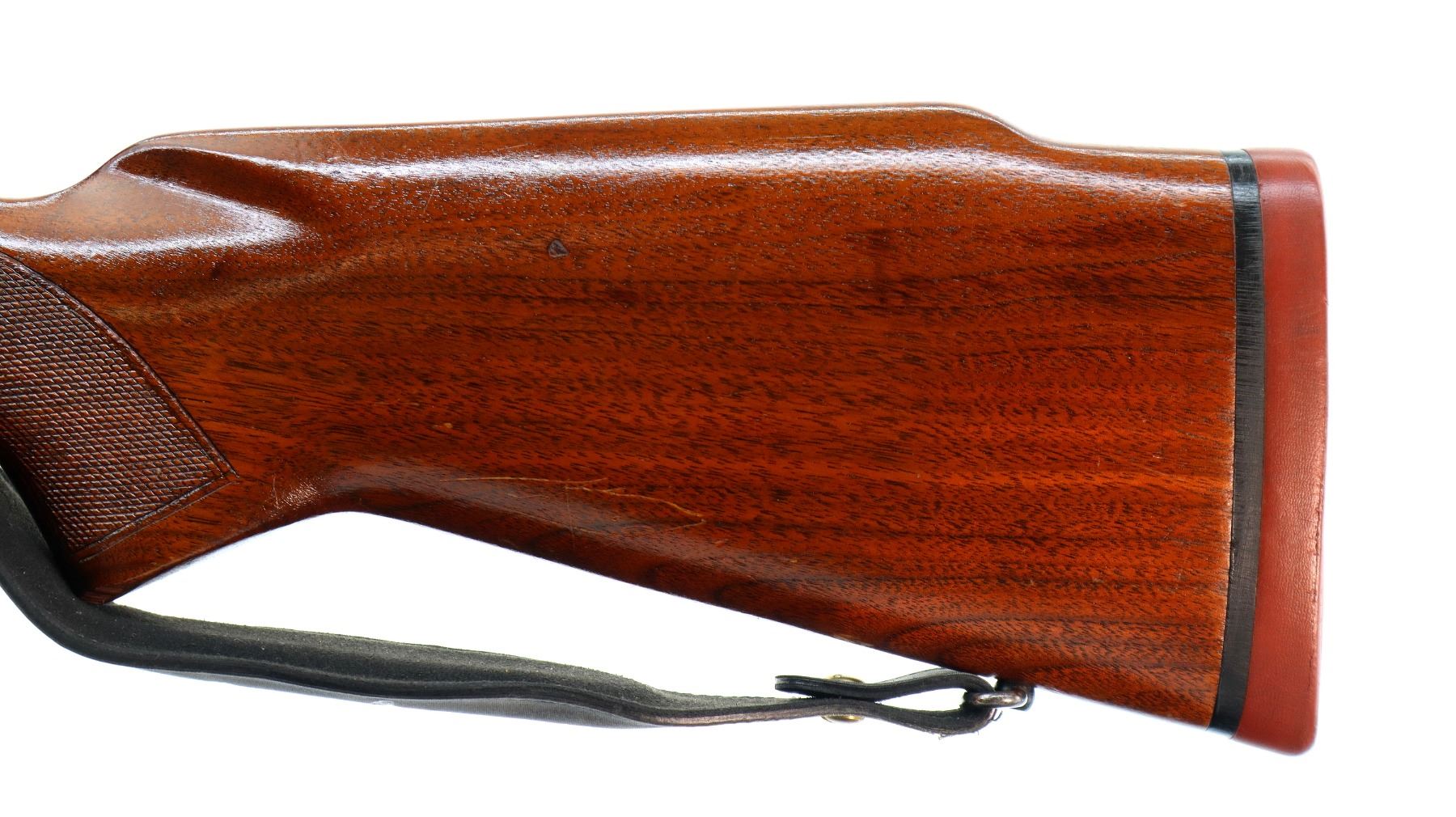 Main Description: Manufactured 1959. Blade front sight with ramp, adjustable folding u notched rear sight, polish blued finish, receiver drilled and tapped with unknown 3-9x40 scope installed, clear optics with duplex crosshair. Controlled round feed bolt with smooth knob. One piece wood stock, checkered forearm and pistol grip, raised comb, black rubber recoil pad, 13.5" LOP, stock chipped at bottom of grip, hinged floor plate, sling swivels with grey leather Winchester sling
