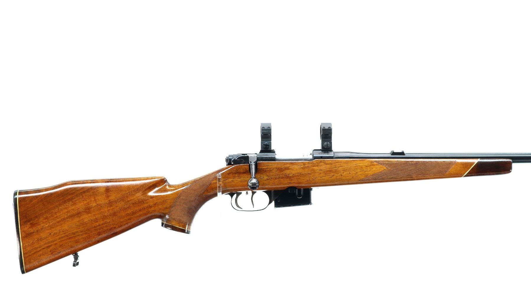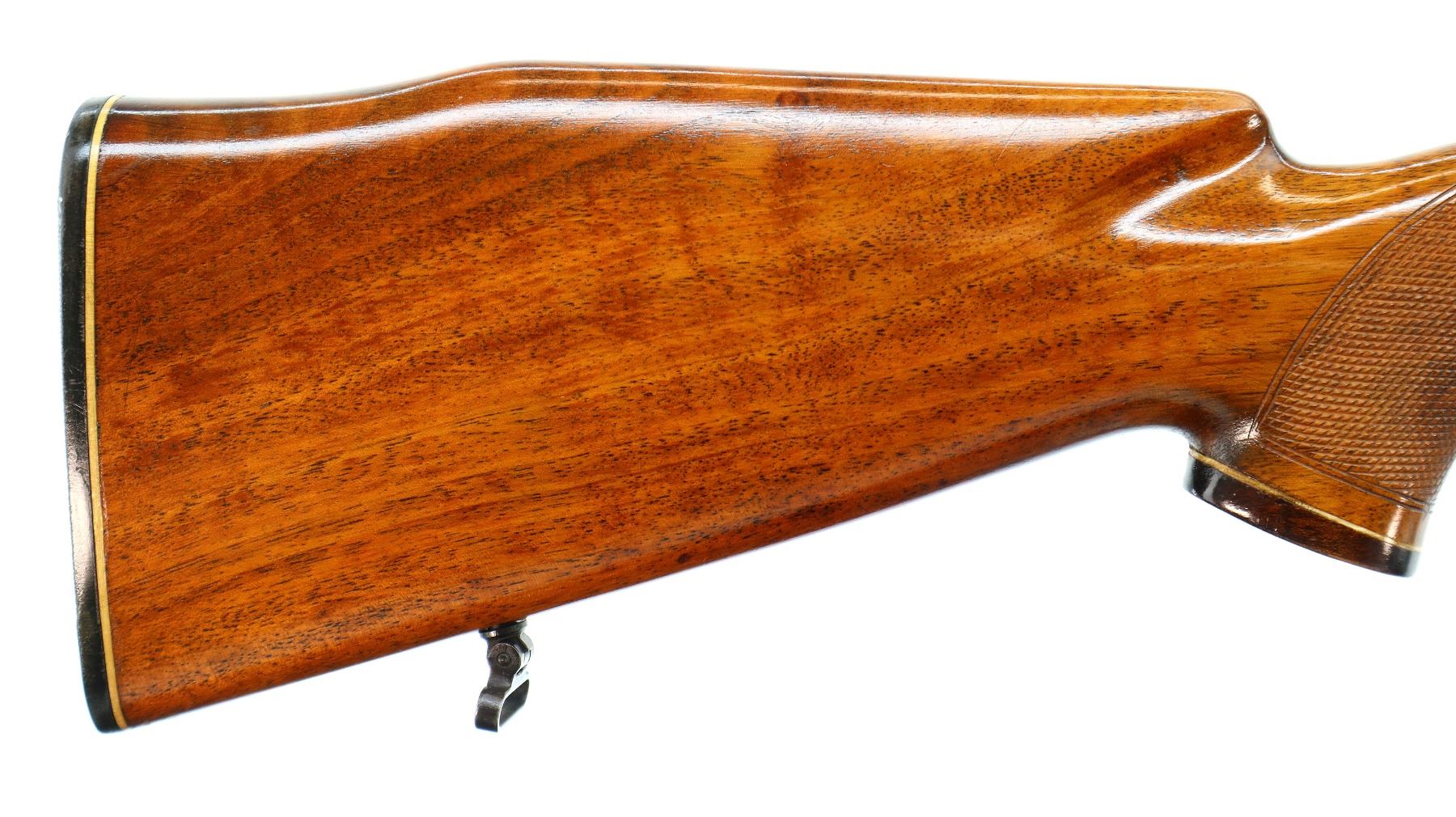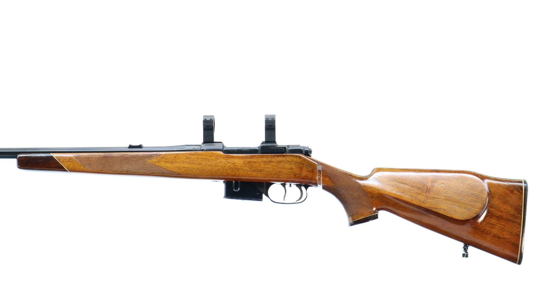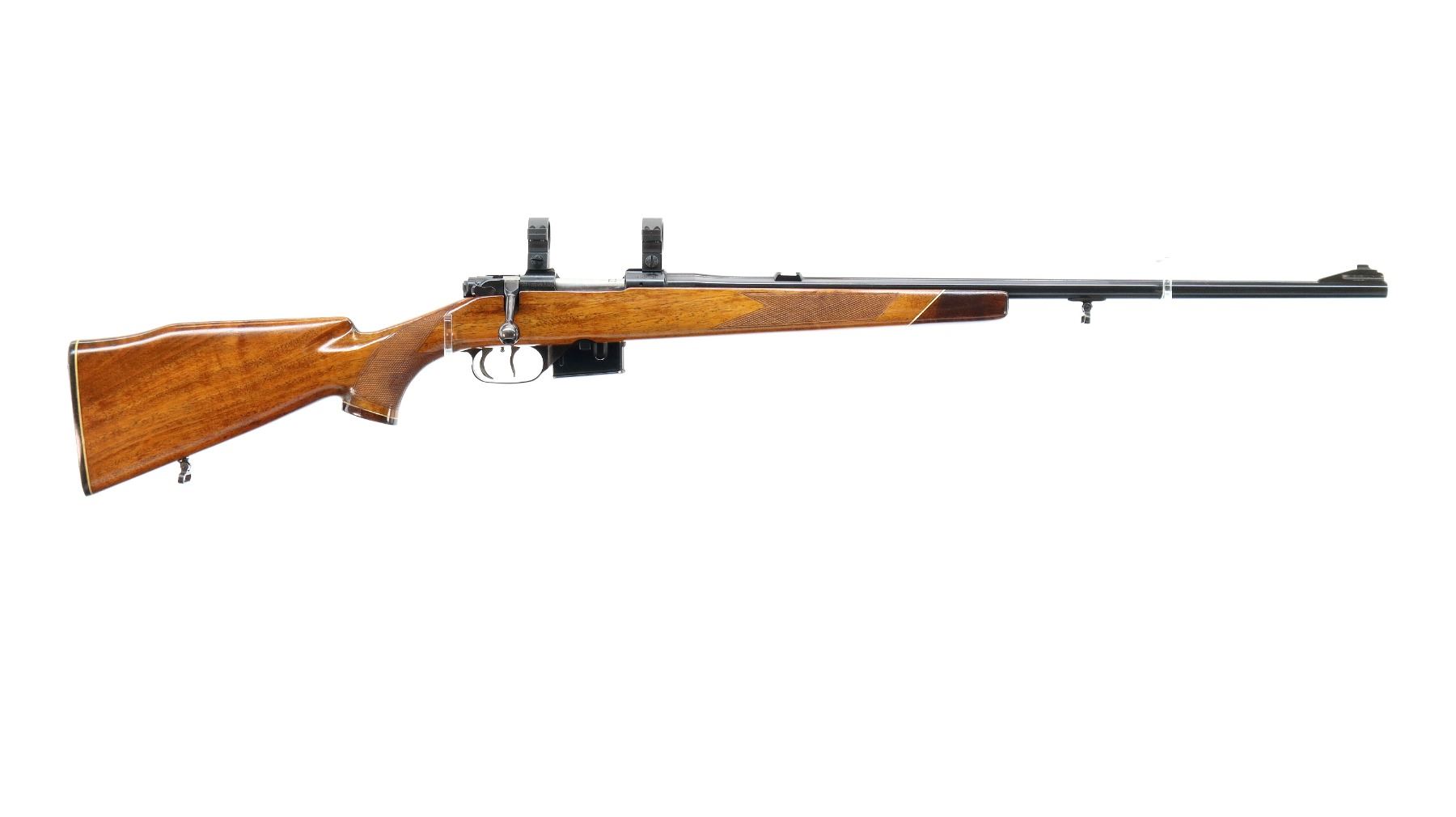 Main Description: Dated 1975. Blade front sight with ramp, missing rear sight dovetail present, polish blued finish, receiver has integral scope bases, 1" CZ 527 rings installed, smooth bolt knob, double set triggers. One piece wood stock, wood forend and pistol grip caps, checkered forearm, pistol grip and black polymer butt plate. Cheek rest, sling swivels