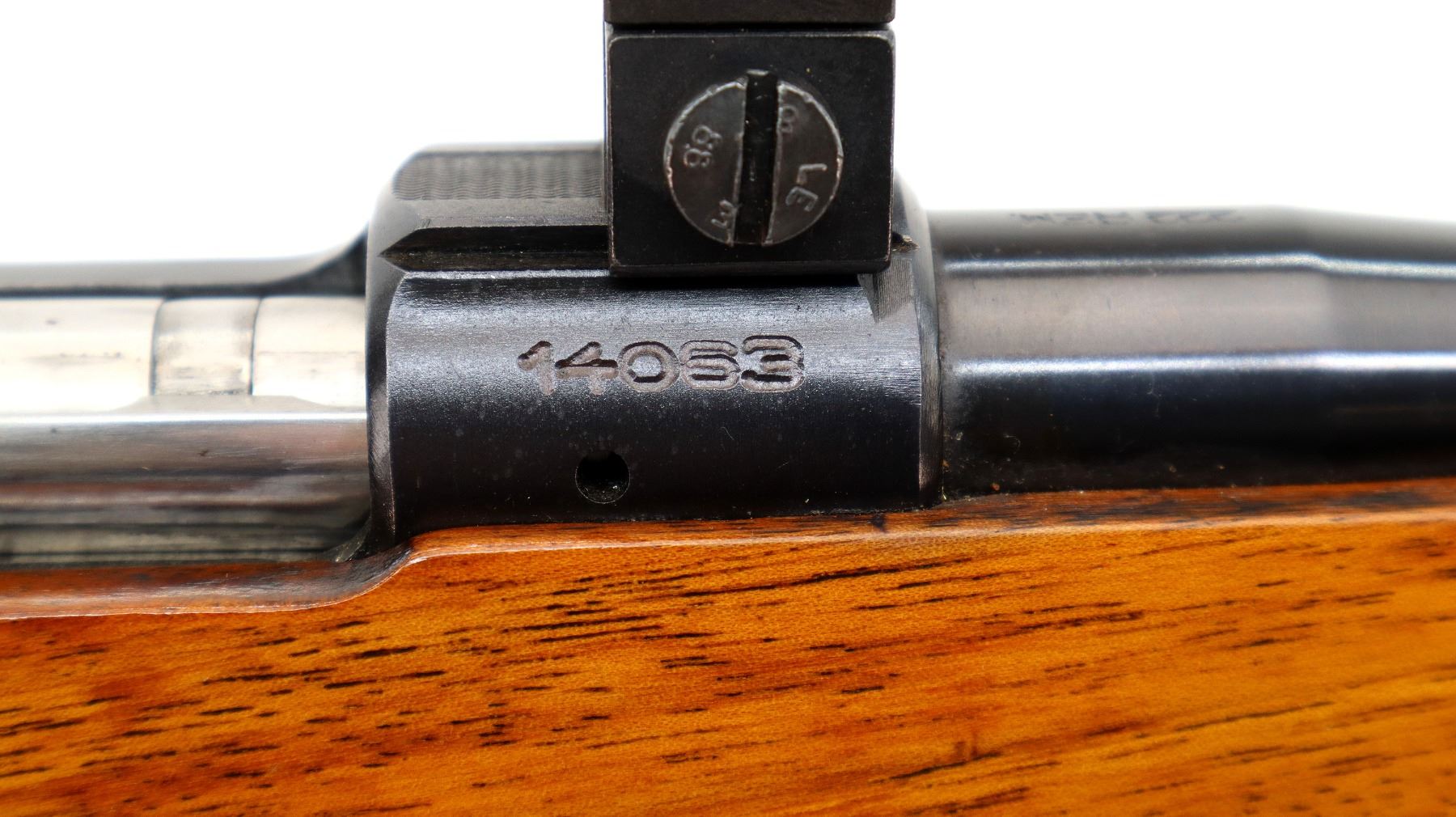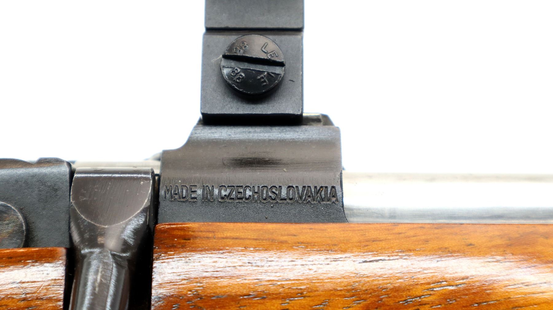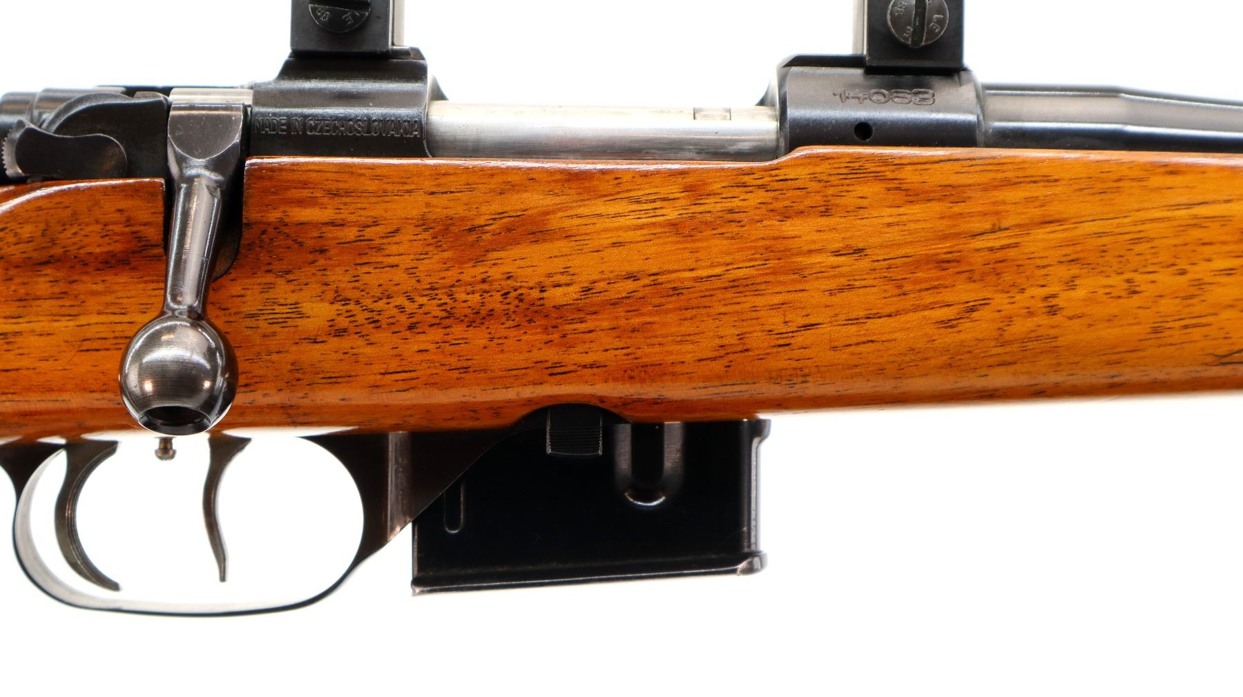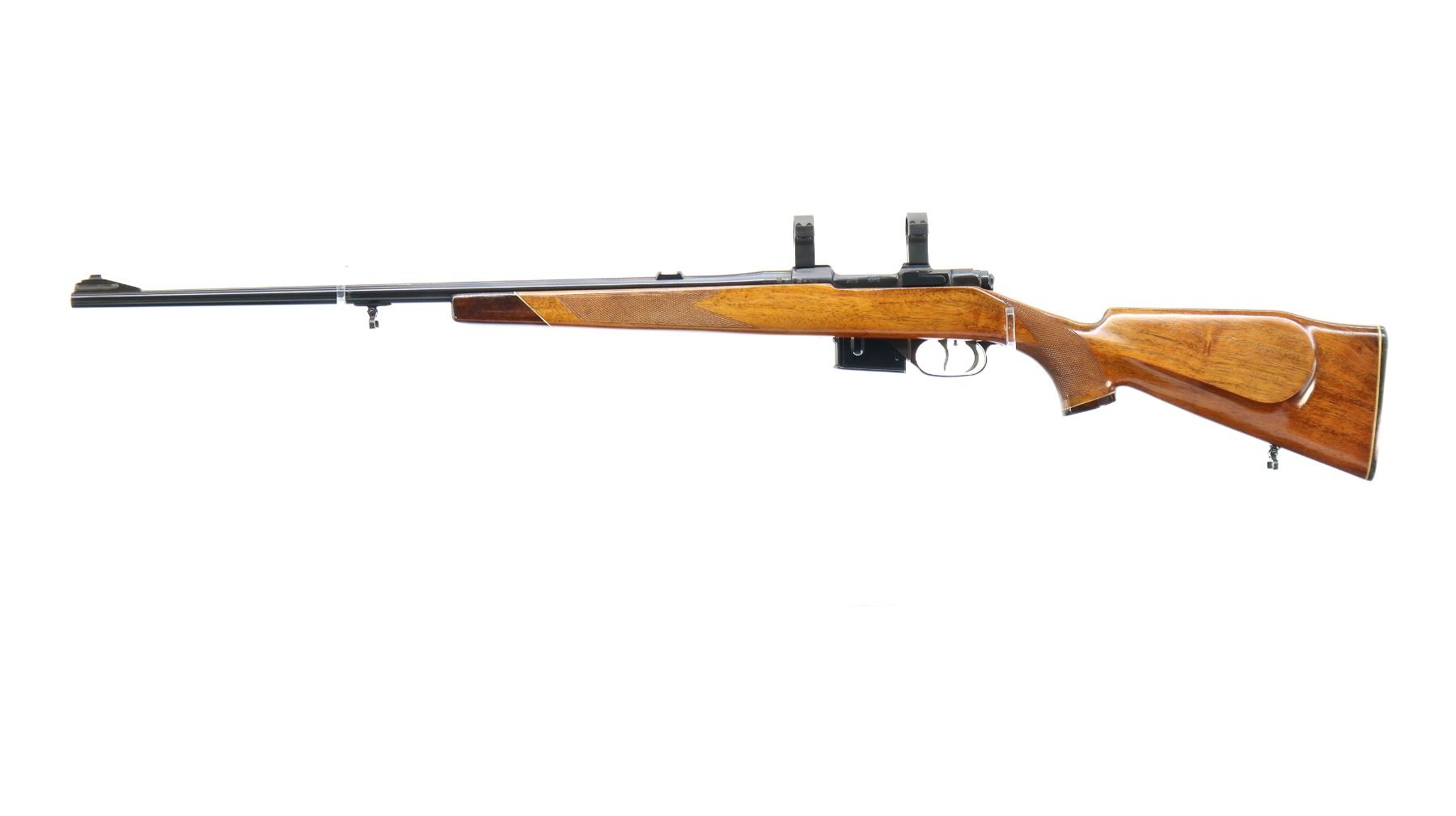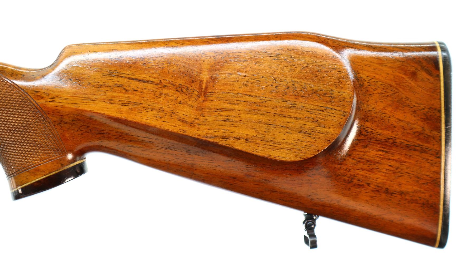 Main Description: Dated 1975. Blade front sight with ramp, missing rear sight dovetail present, polish blued finish, receiver has integral scope bases, 1" CZ 527 rings installed, smooth bolt knob, double set triggers. One piece wood stock, wood forend and pistol grip caps, checkered forearm, pistol grip and black polymer butt plate. Cheek rest, sling swivels