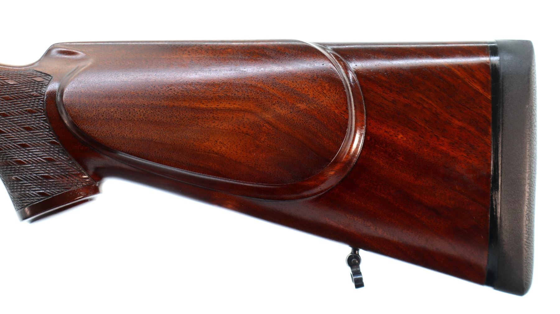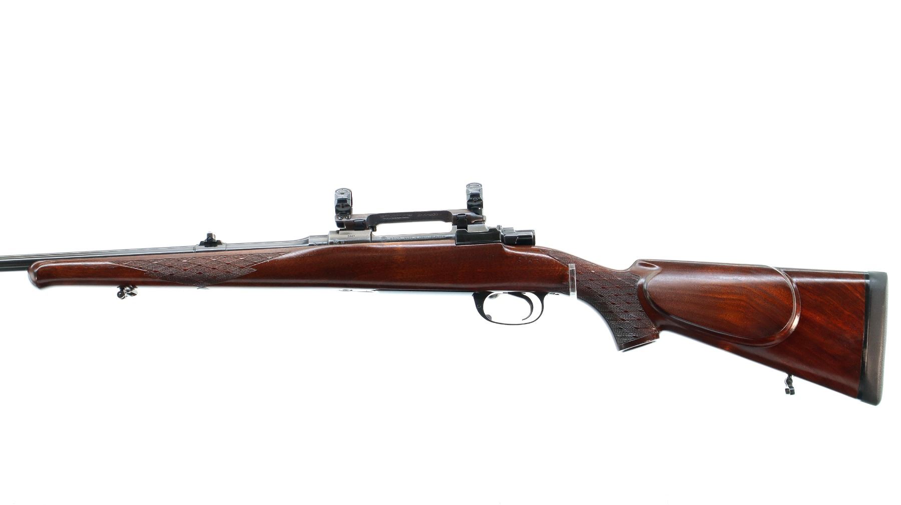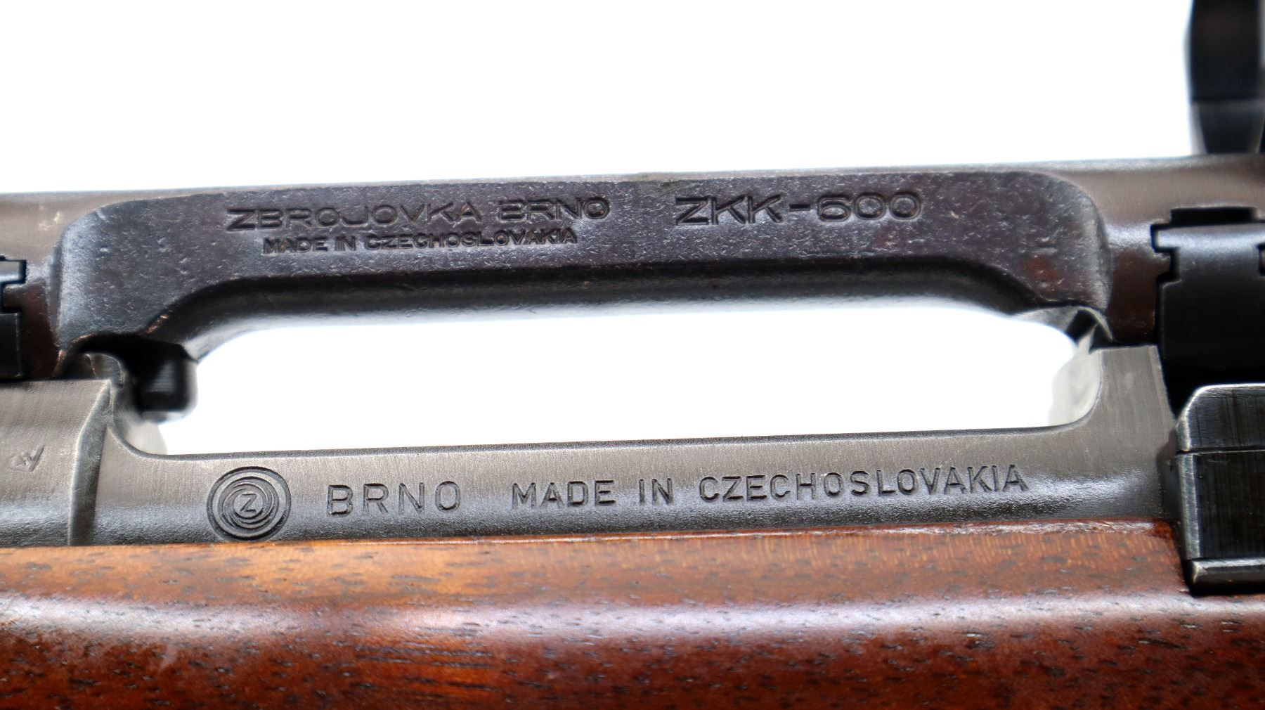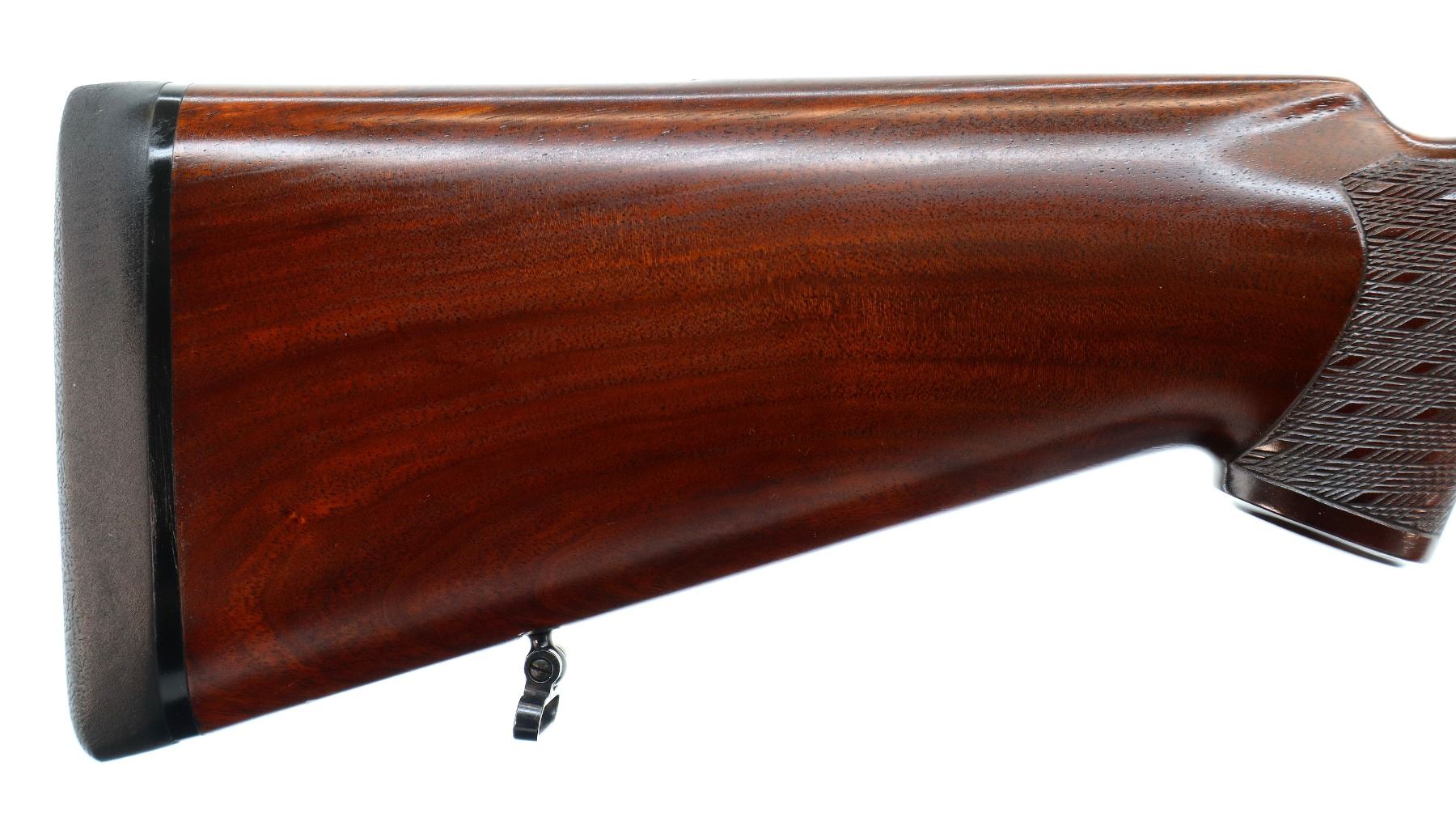 Main Description: Dated 1957. Blade front sight with ramp, adjustable u notched rear sight, polish blued finish, receiver has integral scope bases with ZKK-600 scope base and custom 1" rings installed, smooth bolt knob. One piece deluxe grade wood stock, Schnabel forend tip, checkered forearm and pistol grip, European cheek rest, black rubber recoil pad, hinged floor plate, sling swivels.