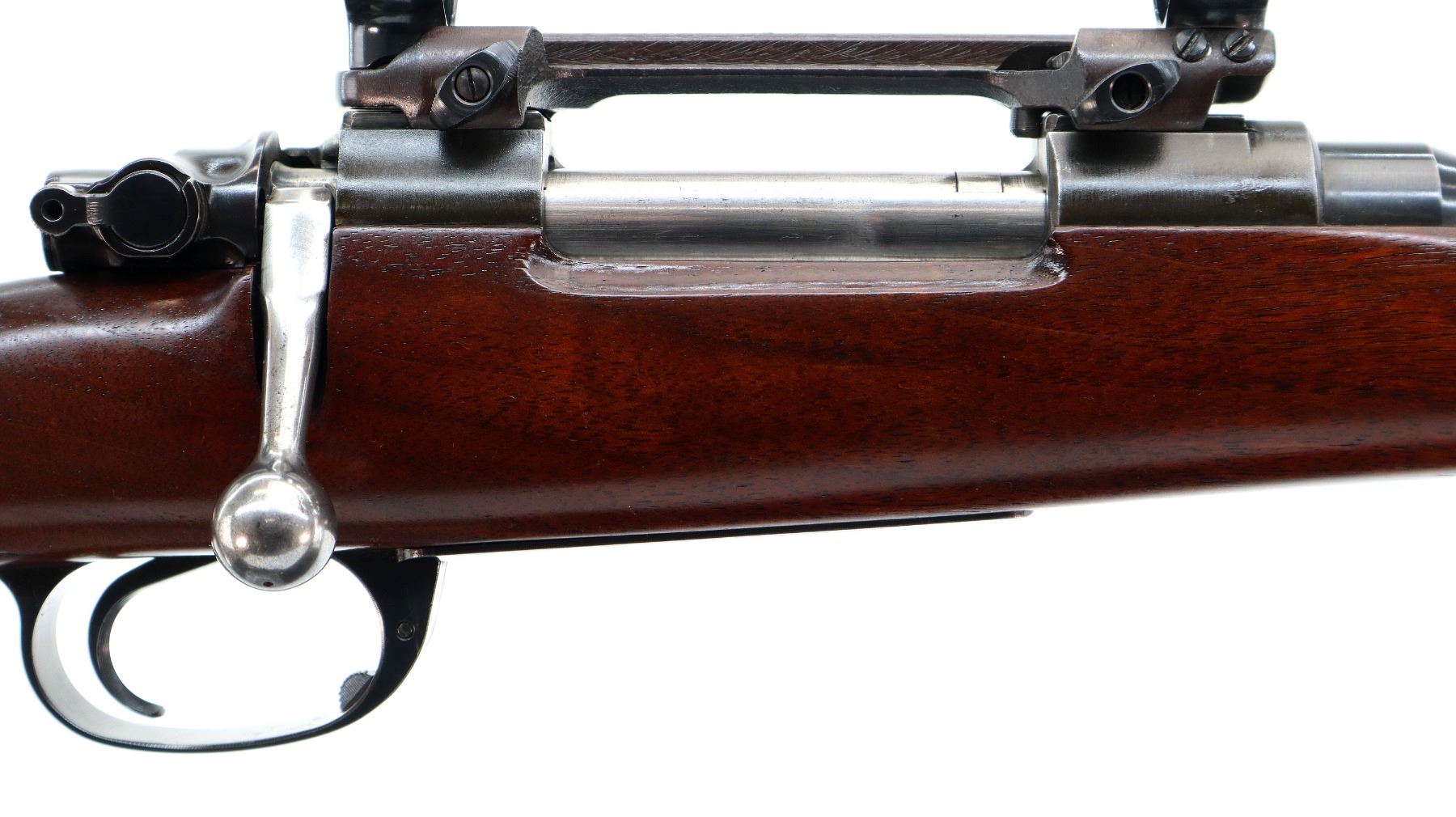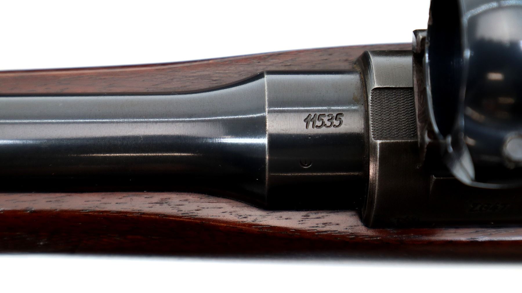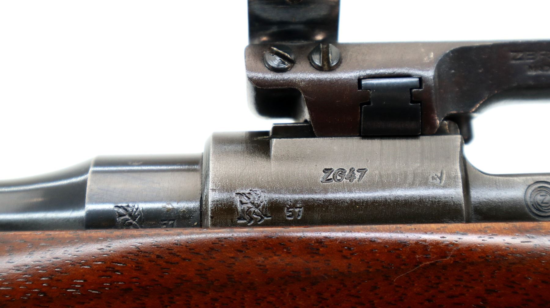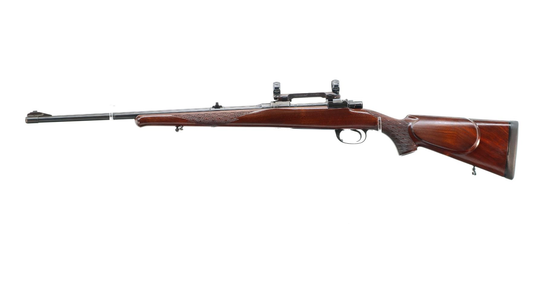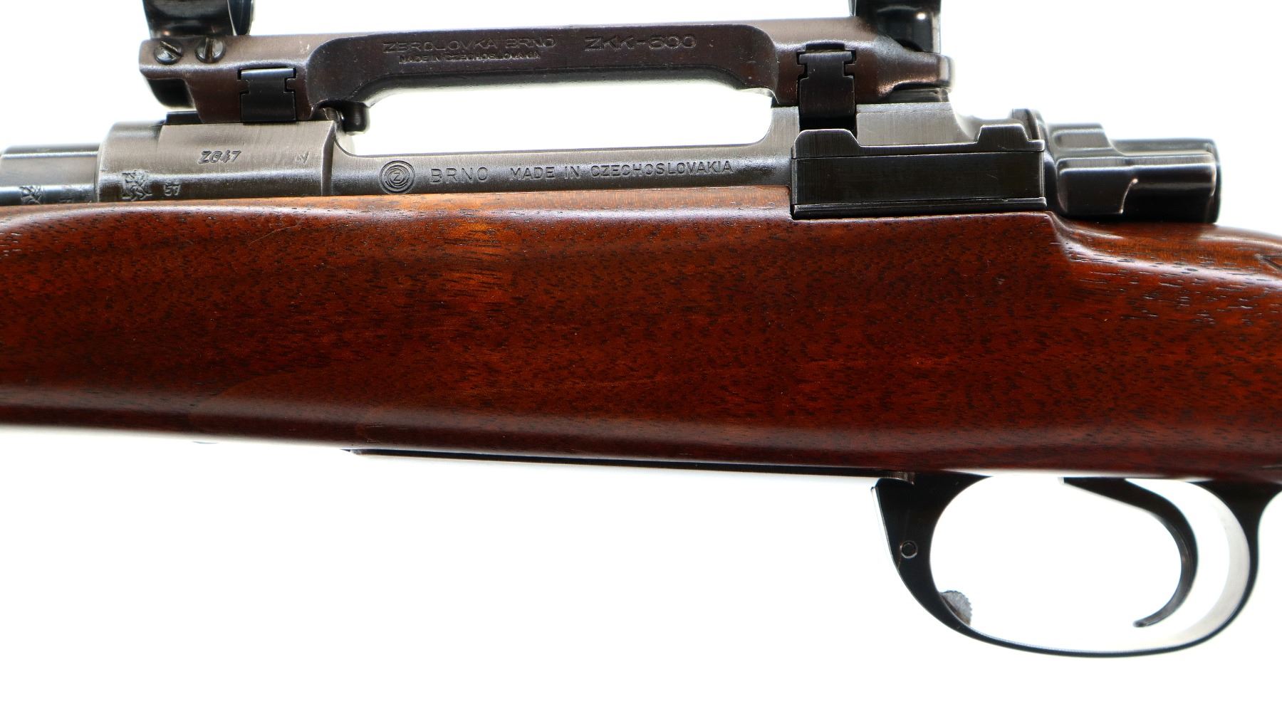 Main Description: Dated 1957. Blade front sight with ramp, adjustable u notched rear sight, polish blued finish, receiver has integral scope bases with ZKK-600 scope base and custom 1" rings installed, smooth bolt knob. One piece deluxe grade wood stock, Schnabel forend tip, checkered forearm and pistol grip, European cheek rest, black rubber recoil pad, hinged floor plate, sling swivels.