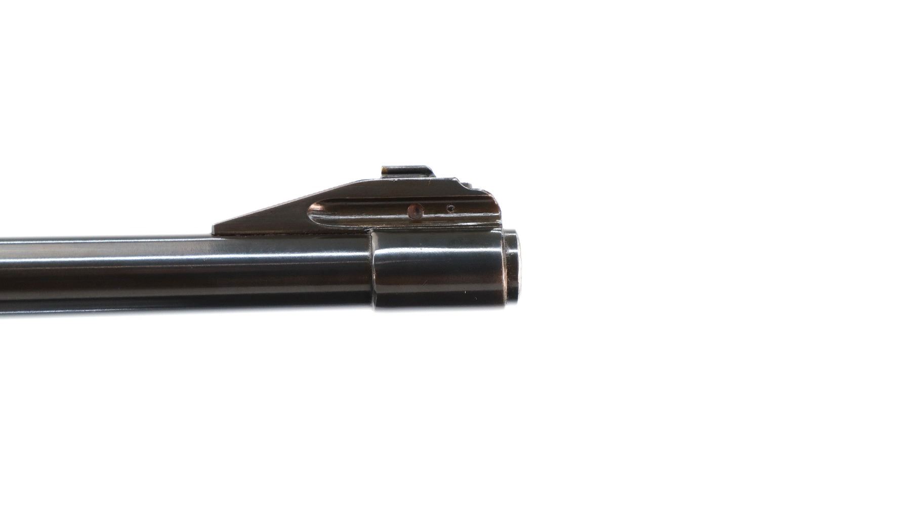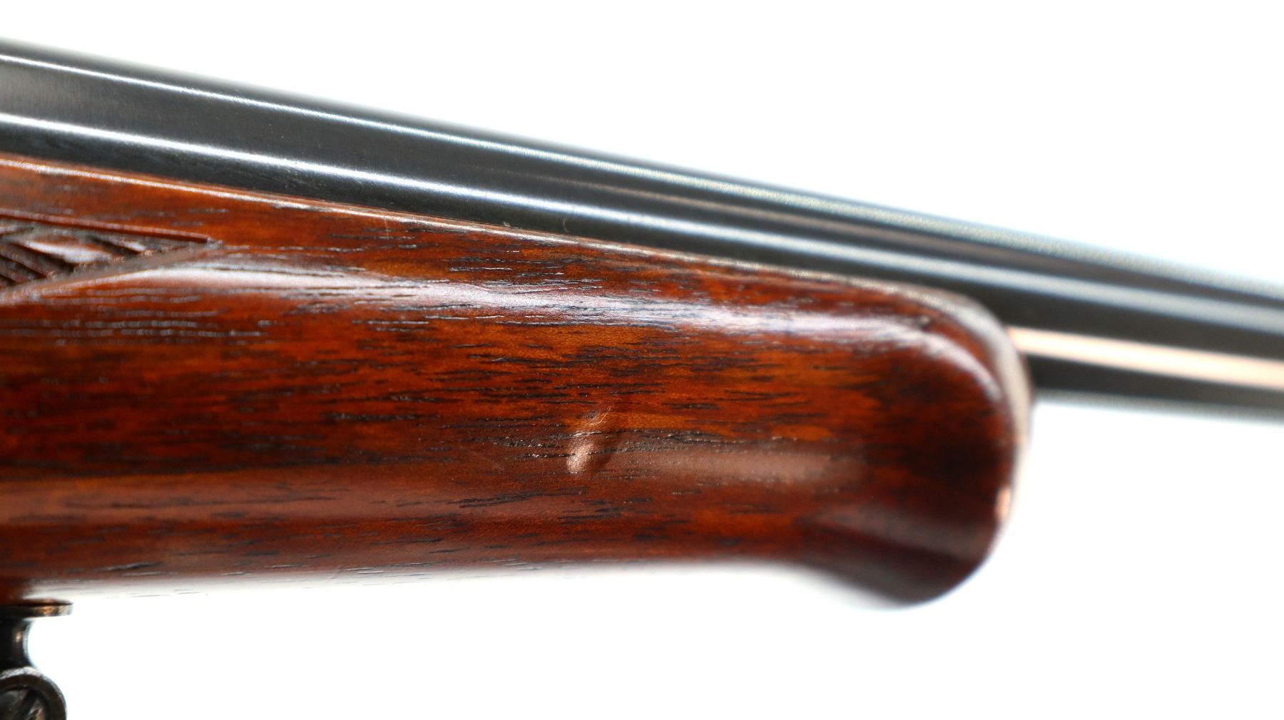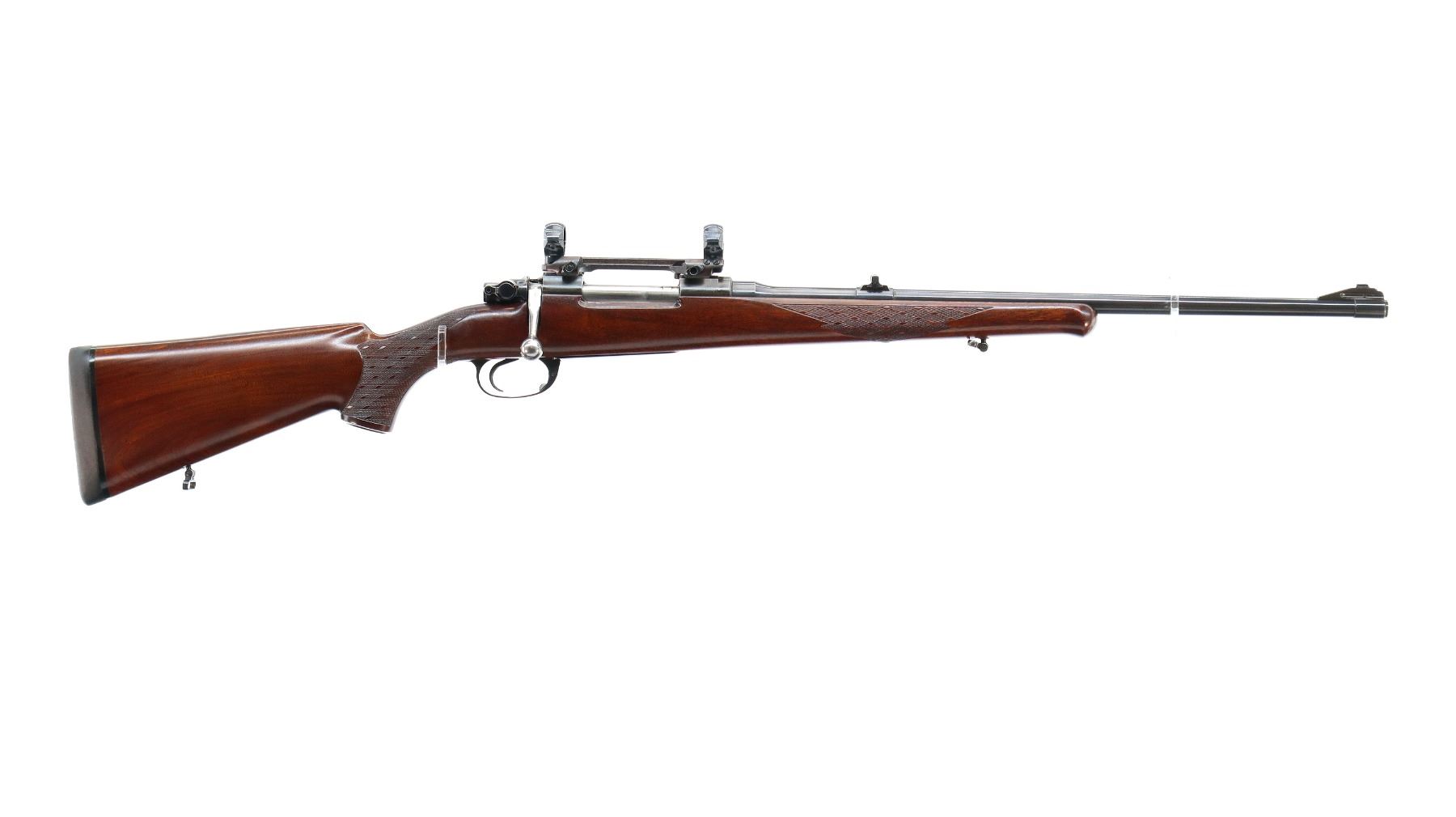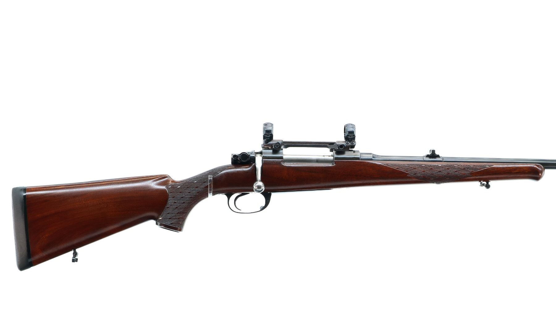 Main Description: Dated 1957. Blade front sight with ramp, adjustable u notched rear sight, polish blued finish, receiver has integral scope bases with ZKK-600 scope base and custom 1" rings installed, smooth bolt knob. One piece deluxe grade wood stock, Schnabel forend tip, checkered forearm and pistol grip, European cheek rest, black rubber recoil pad, hinged floor plate, sling swivels.