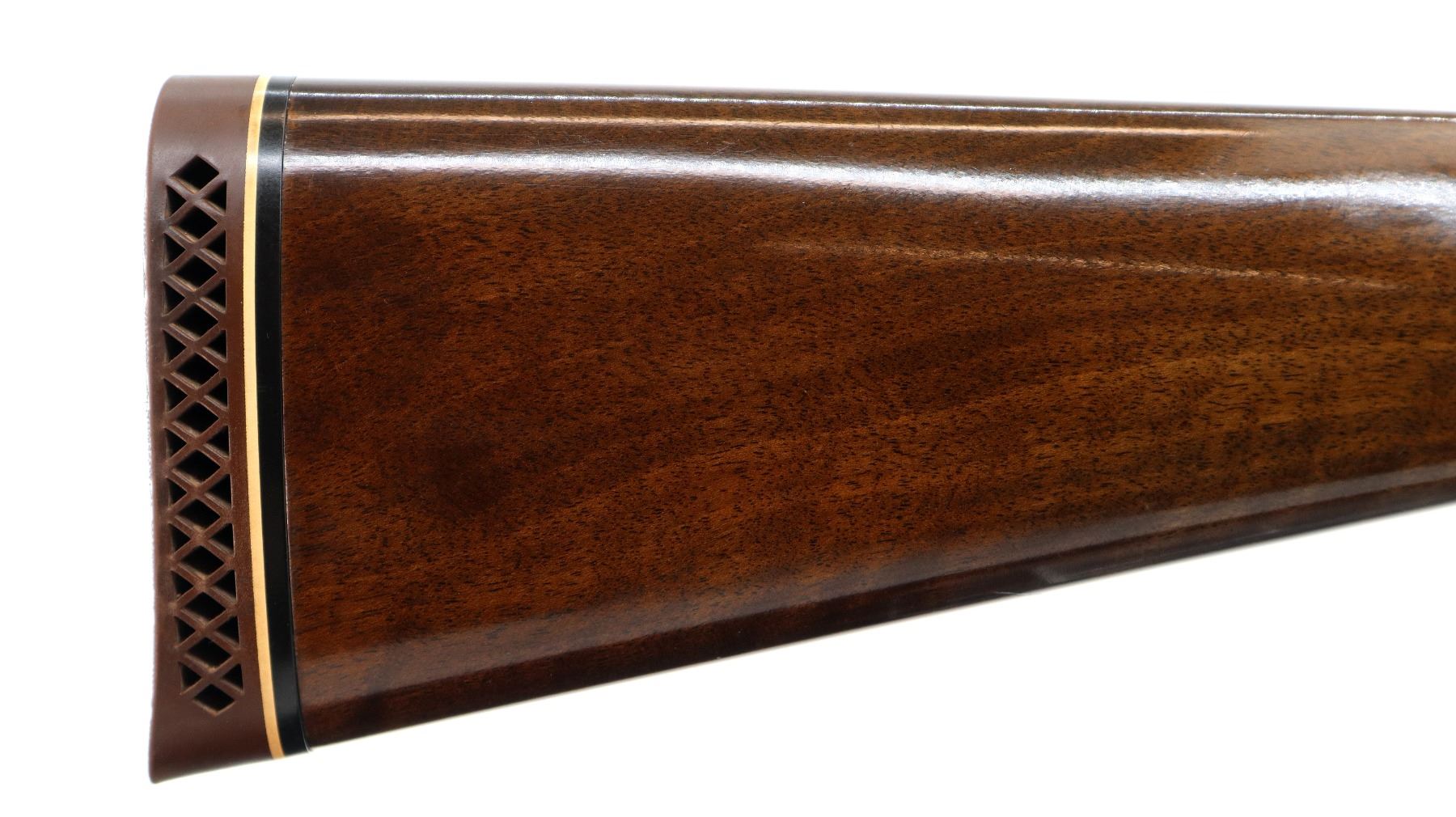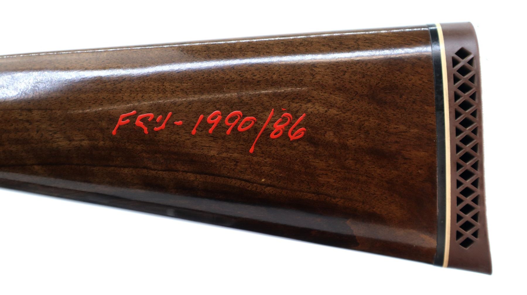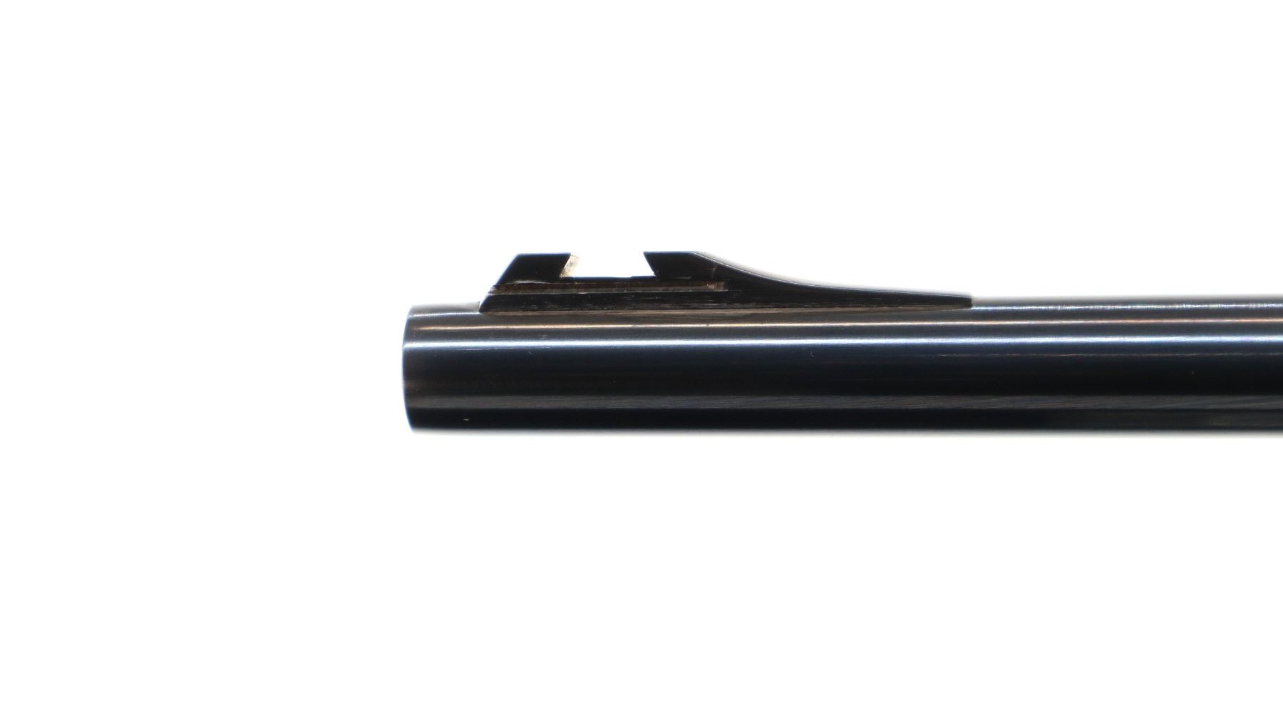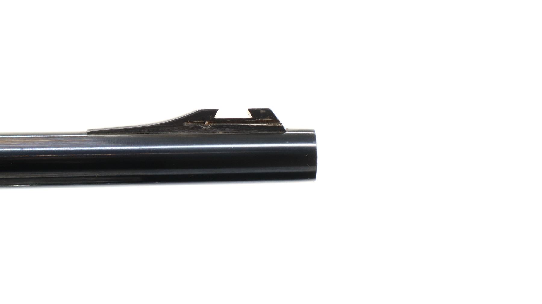 Main Description: Missing front sight ramp present, no rear sight threaded hole filled with plug screw, polish blued finish, receiver drilled and tapped with two piece scope bases installed, grooved spur hammer. Two piece gloss finish wood stocks, checkered forearm and straight grip, brown vented rubber recoil pad, red painted letters/numbers on left side of stock.