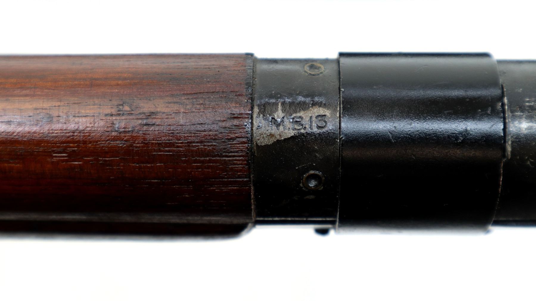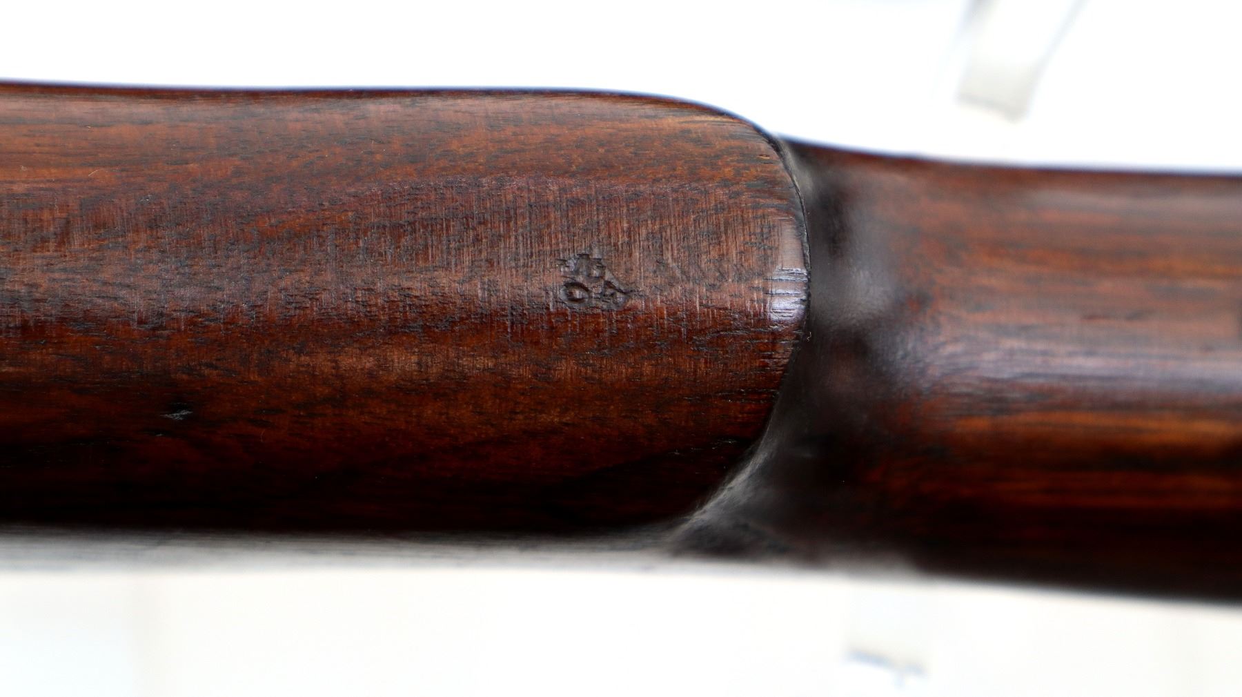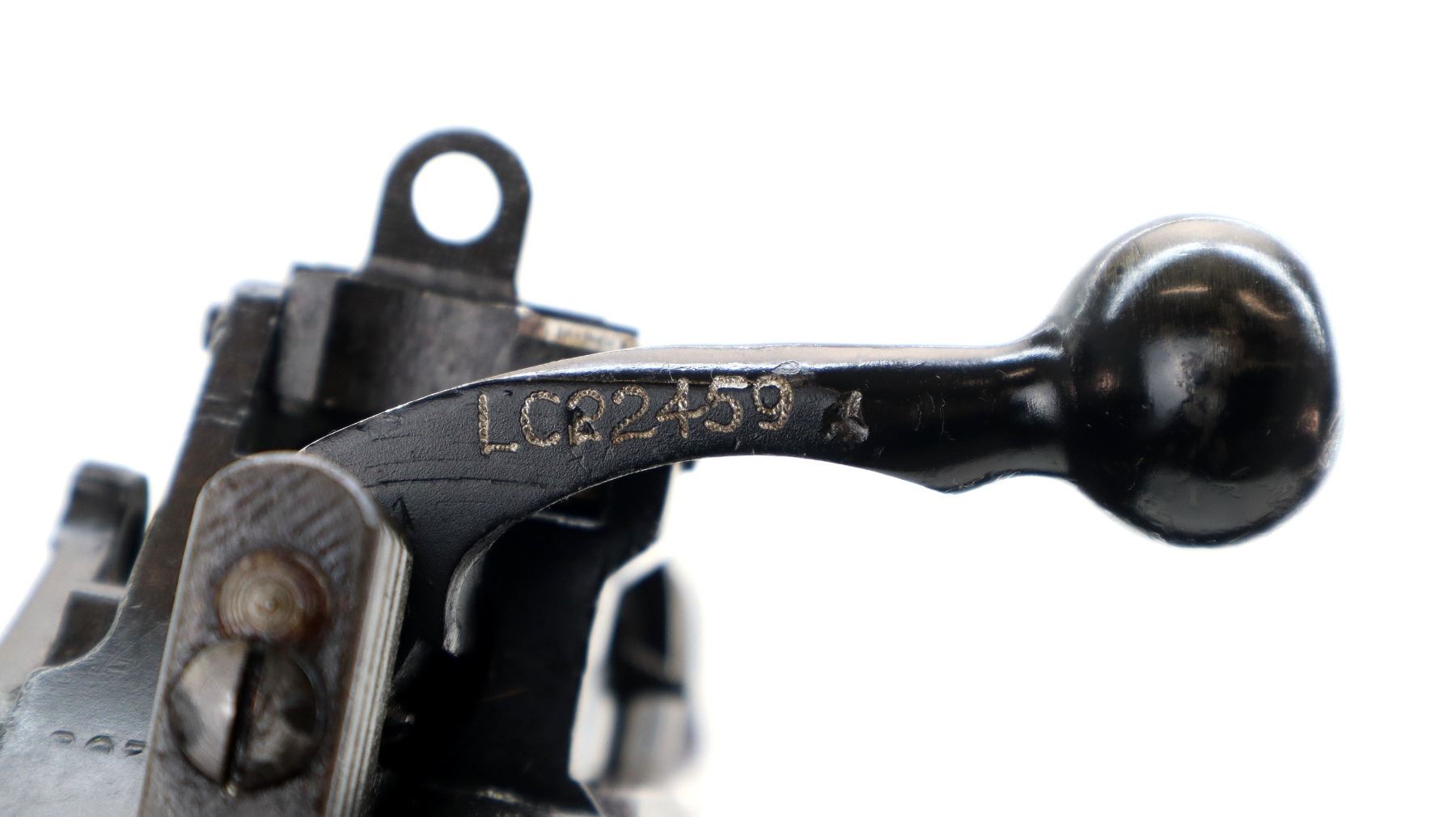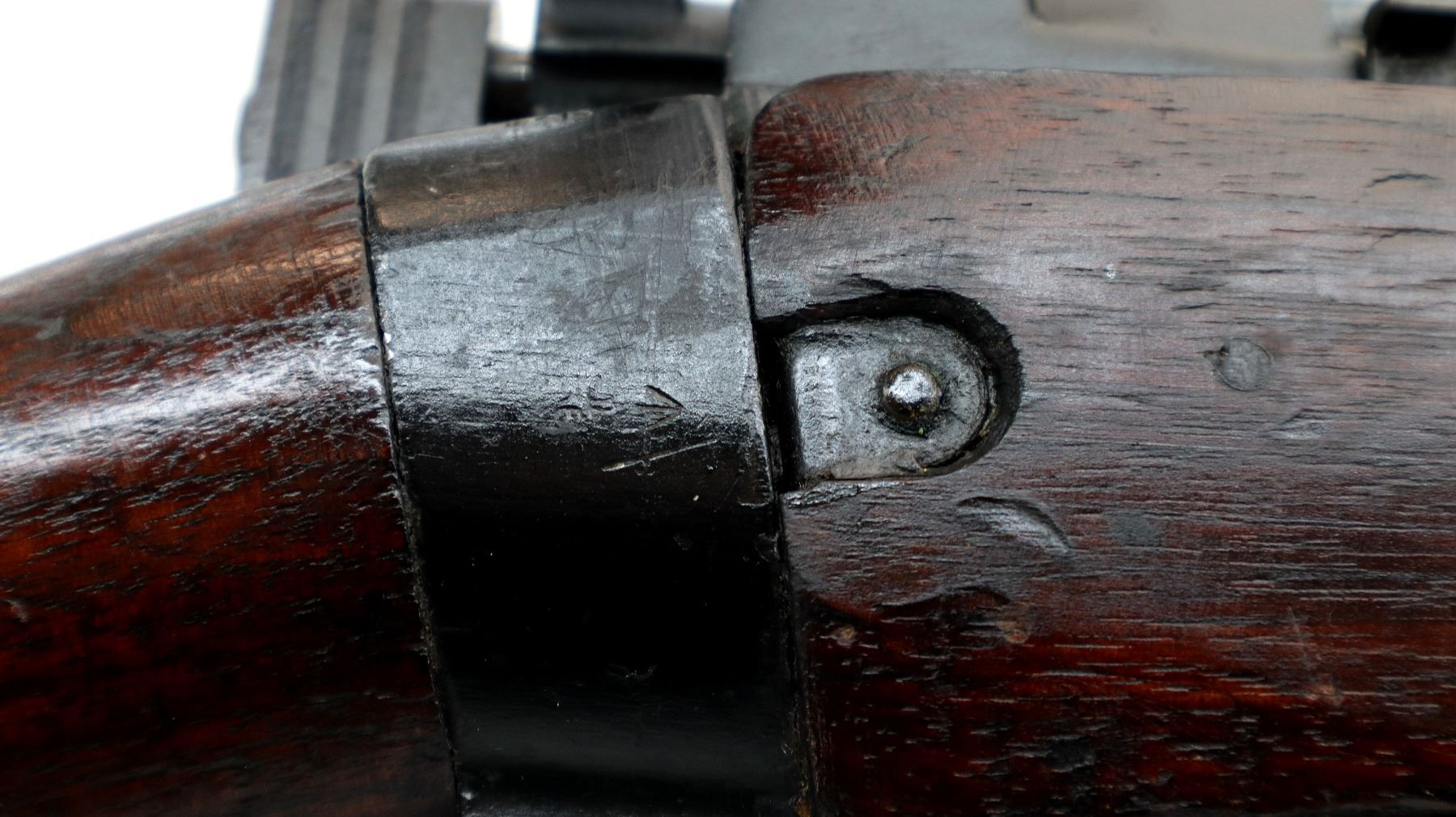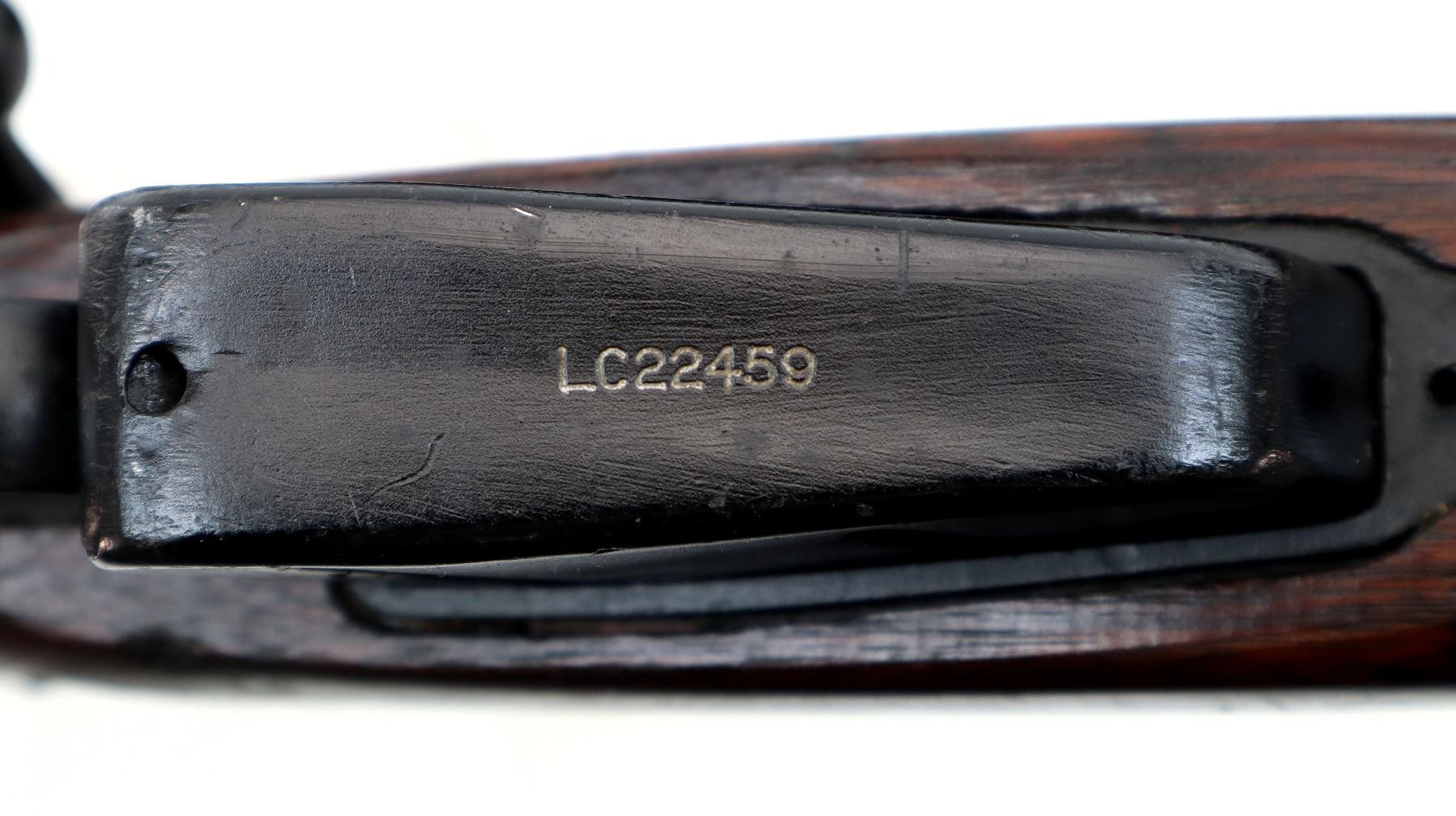 Main Description: Manufactured by Fazakerley 1949, visible numbers match. Blade front sight with ears and ramp, adjustable milled rear peep sight. Four piece full military wood stocks, pistol grip, smooth brass butt plate with trap, sling swivels, bayonet lugs.