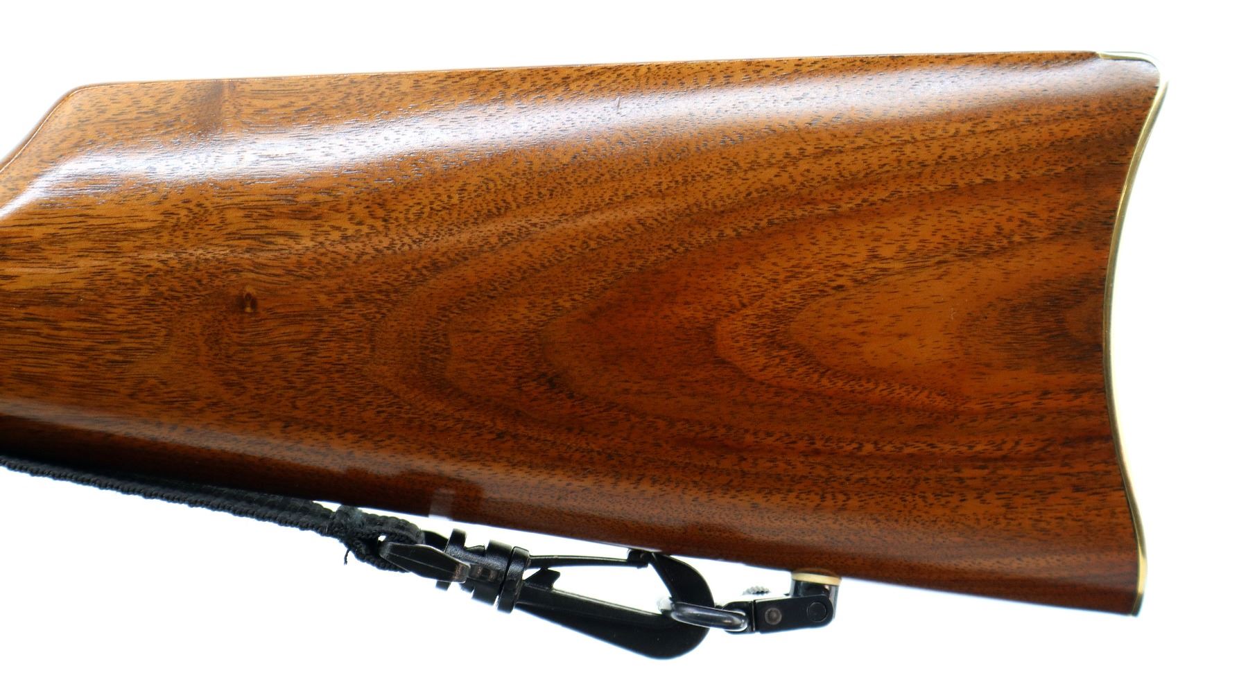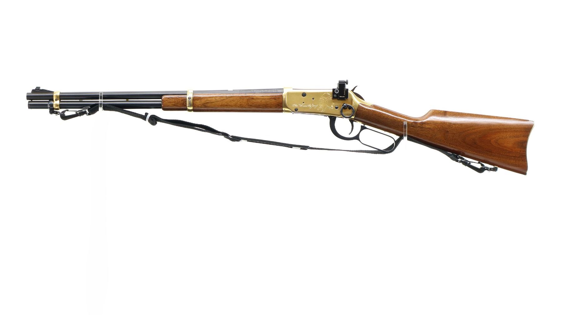 Main Description: Blade front sight with ramp, missing rear sight dovetail present, receiver has an adjustable Williams peep sight installed, polish blued barrel, bolt, lever and full length magtube, engraved gold receiver, grooved spur hammer, saddle ring and stud. Two piece wood stocks, straight grip, smooth curved gold butt plate and two barrel bands, medallion in right side of stock with 7th Cavalry logo, sling swivels with black nylon sling.