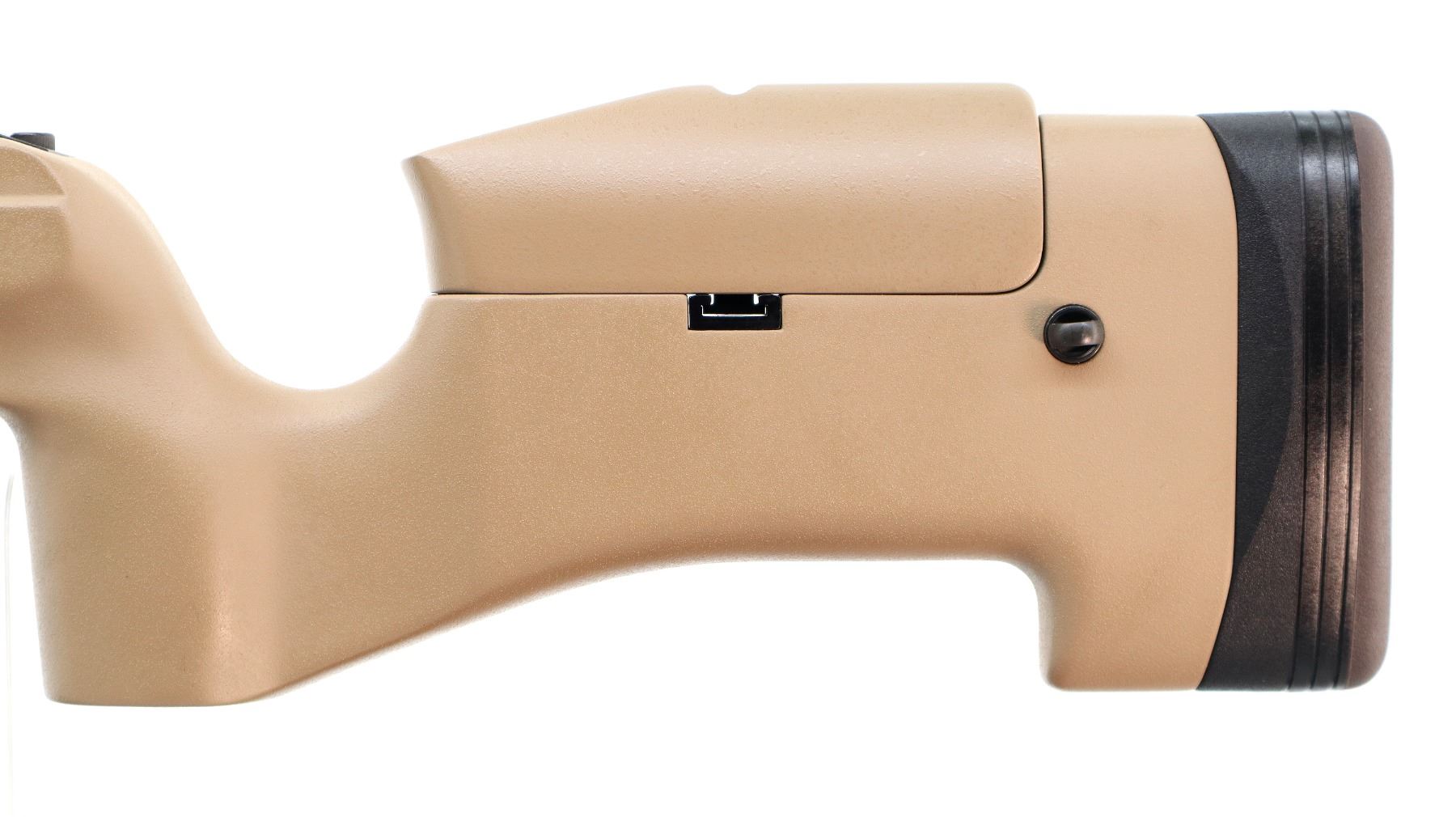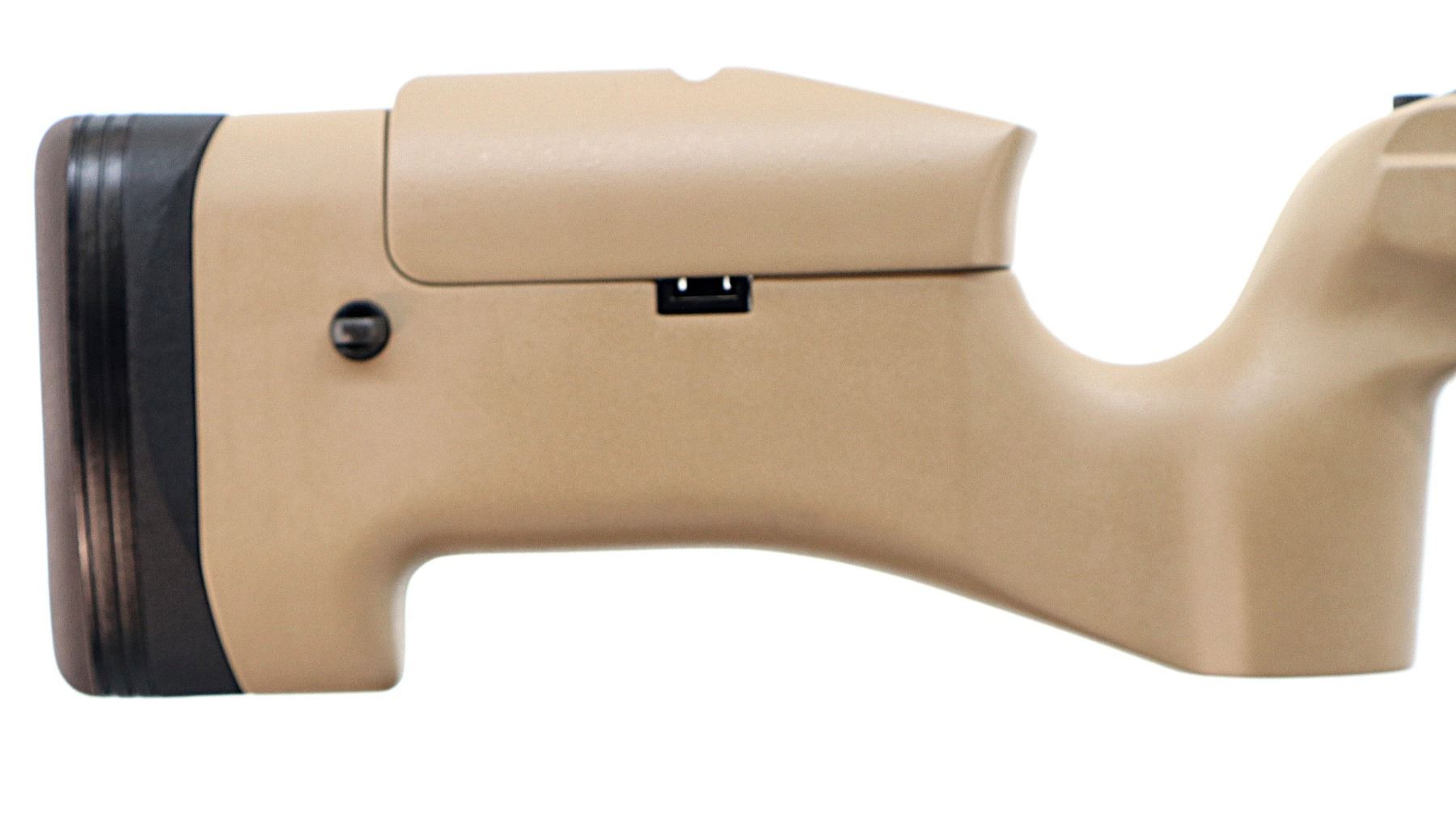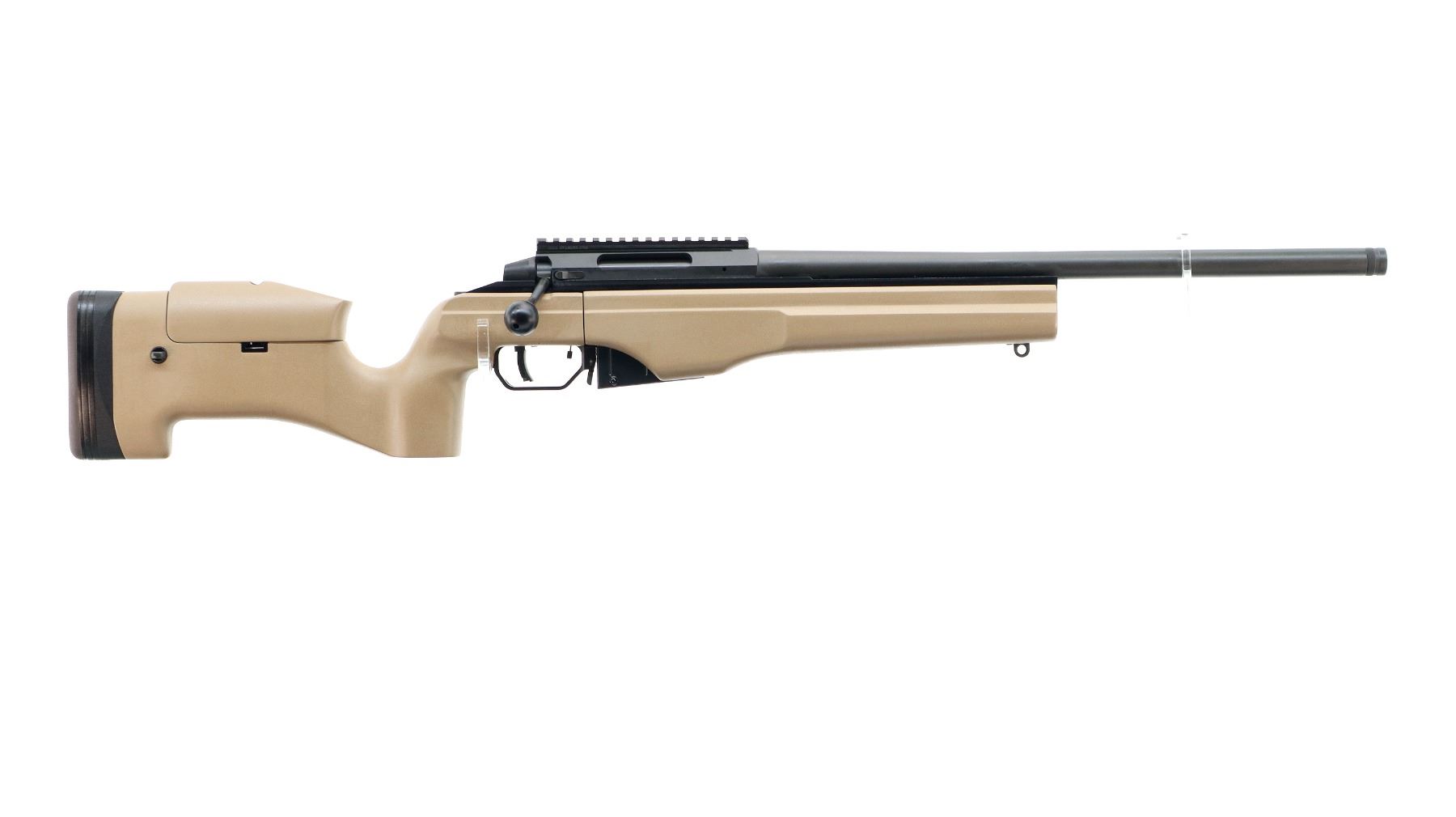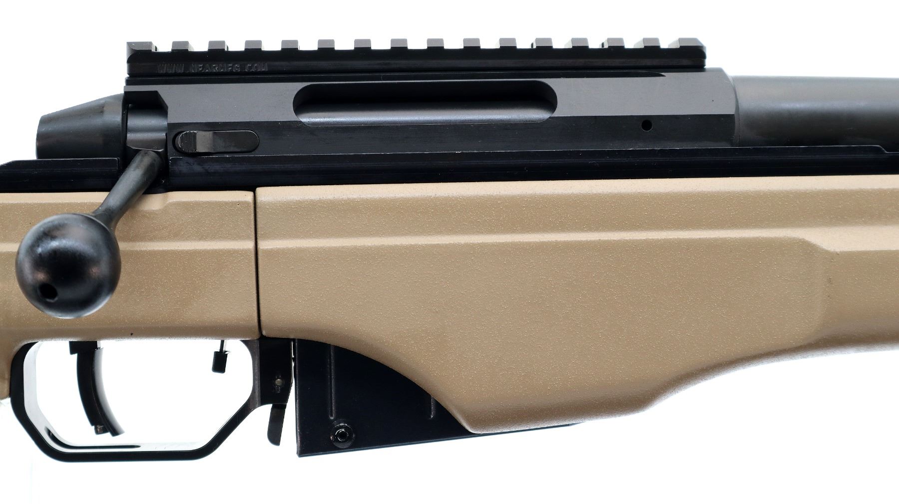 Main Description: No sights, Parkerized metal finish, heavy barrel threaded at muzzle with cap, receiver drilled and tapped with NEAR one piece rail installed, large black polymer bolt knob. Two piece FDE synthetic tactical stocks, wide forearm, thumb rest pistol grip, adjustable comb, brown rubber recoil pad with spacers, hooked butt, adjustable trigger, three swivel studs.