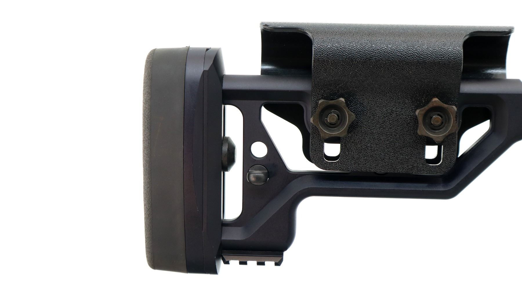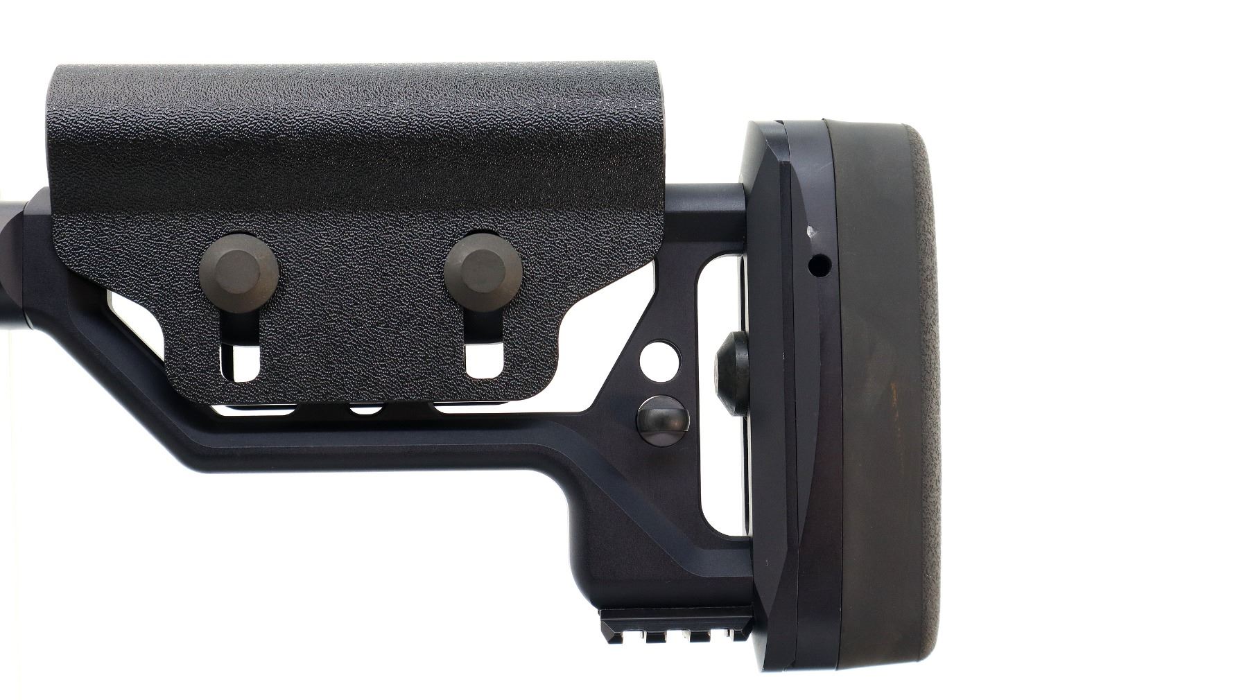 Main Description: No sights, satin blued finish, heavy barrel threaded at muzzle with ported brake installed, receiver drilled and tapped with one piece rail, black anodized chassis and ventilated forearm with full length rail. Two piece synthetic stocks, textured AGR 43 pistol grip, folding butt stock with adjustable cheek rest and black rubber recoil pad, hooked but with short rail, ambi magcatch, large black polymer bolt knob, swivel studs.