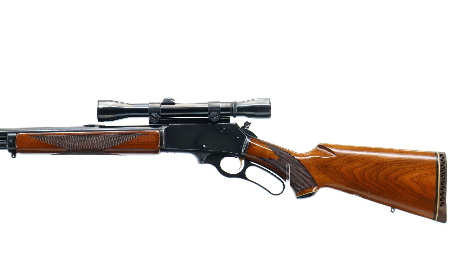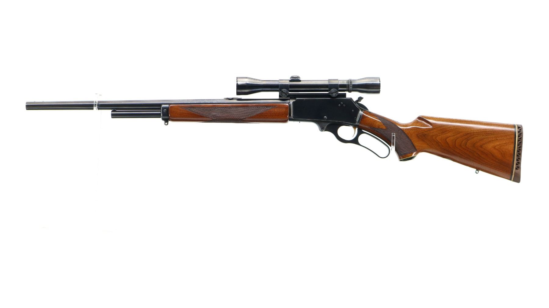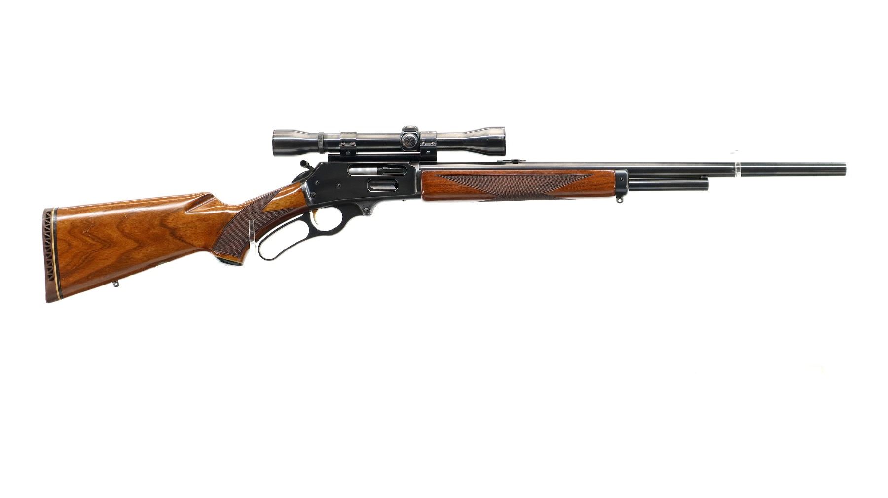 Main Description: Missing front sight, threaded holes filled with plug screws, no rear sight, dovetail blank installed, polish blued finish, receiver drilled and tapped with Weaver K4 scope installed, clear optics with fine crosshair, grooved spur hammer with checkered thumb extension, gold trigger. Two piece wood stocks, checkered forearm and pistol grip, brown vented rubber recoil pad, Marlin bullseye, vanity plate and grip cap. 2/3rd length magtube, swivel studs.