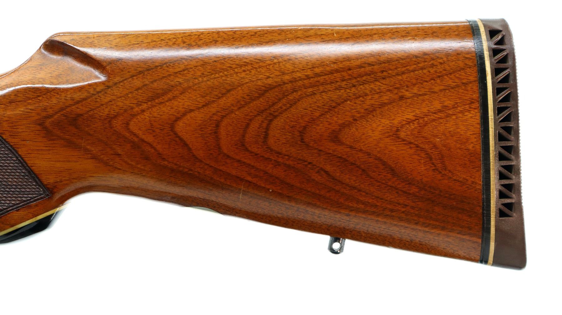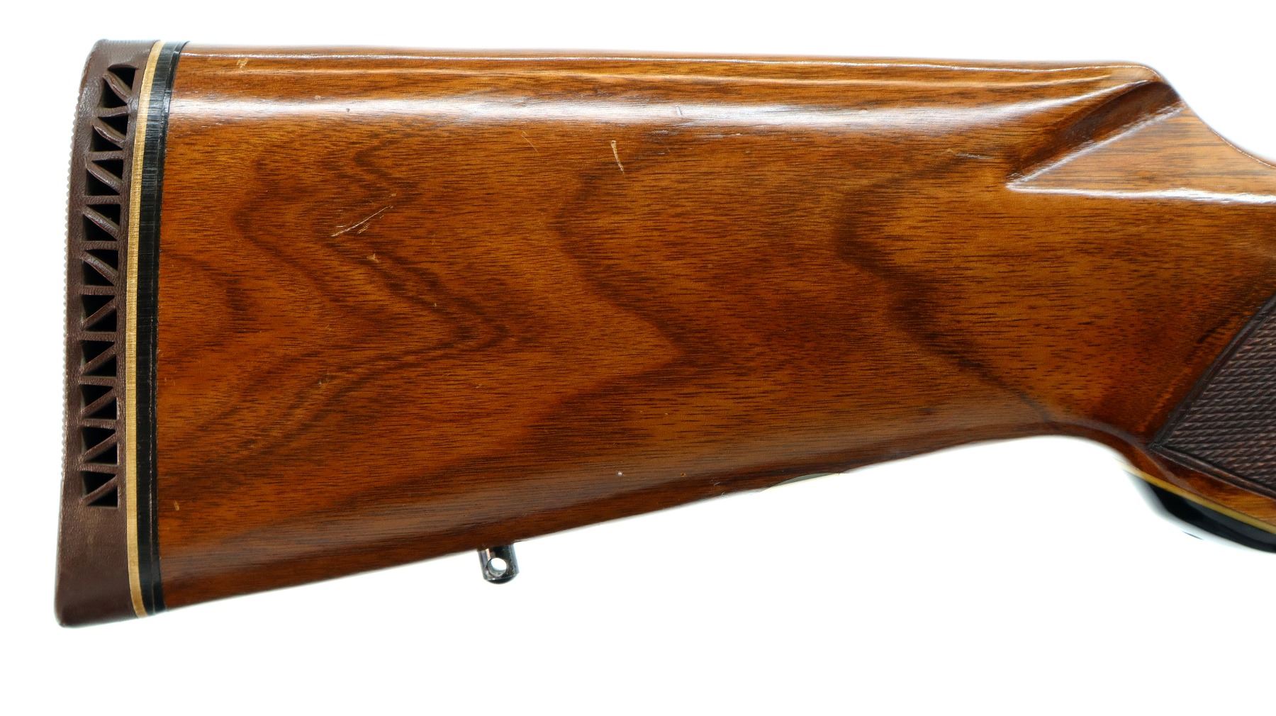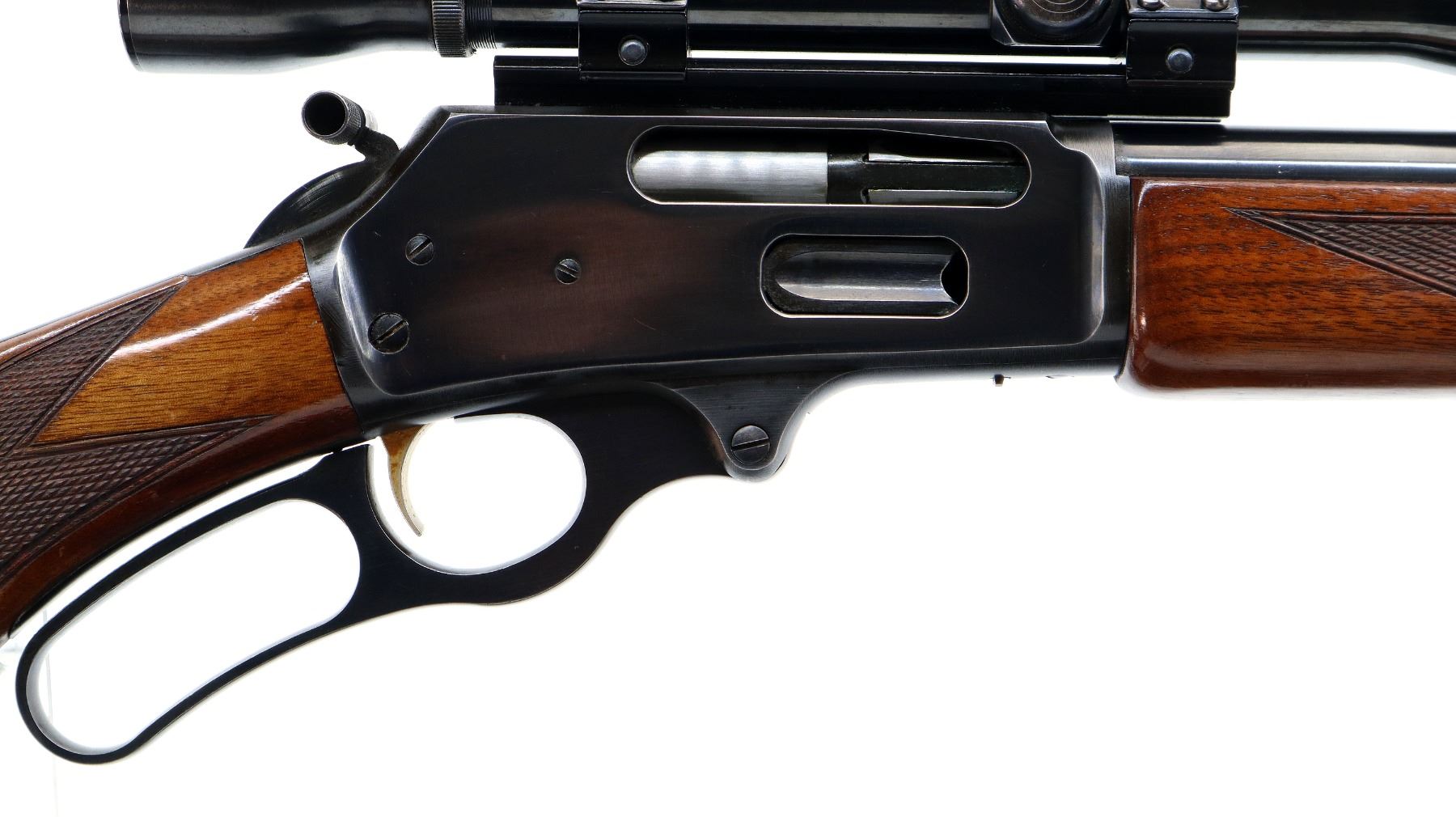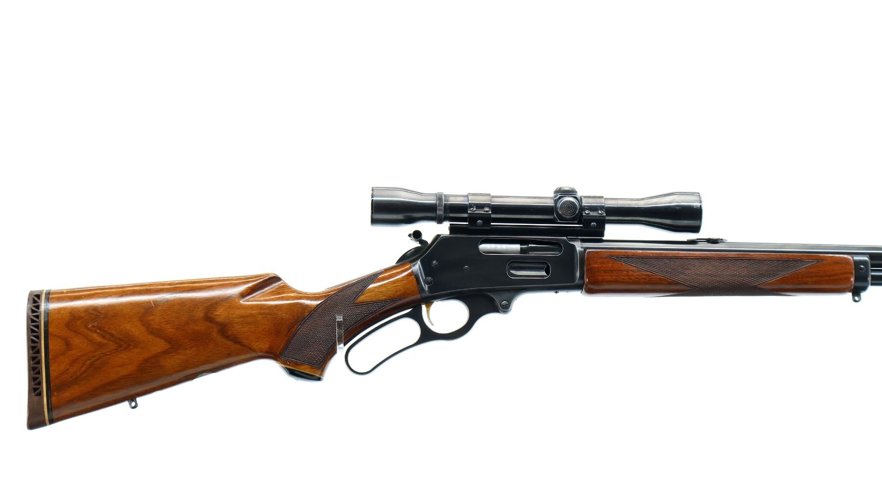 Main Description: Missing front sight, threaded holes filled with plug screws, no rear sight, dovetail blank installed, polish blued finish, receiver drilled and tapped with Weaver K4 scope installed, clear optics with fine crosshair, grooved spur hammer with checkered thumb extension, gold trigger. Two piece wood stocks, checkered forearm and pistol grip, brown vented rubber recoil pad, Marlin bullseye, vanity plate and grip cap. 2/3rd length magtube, swivel studs.